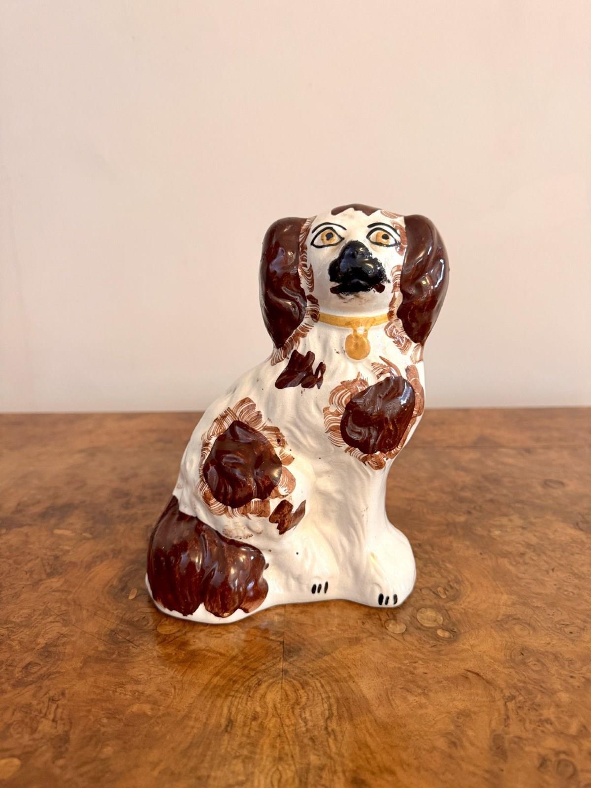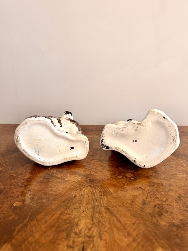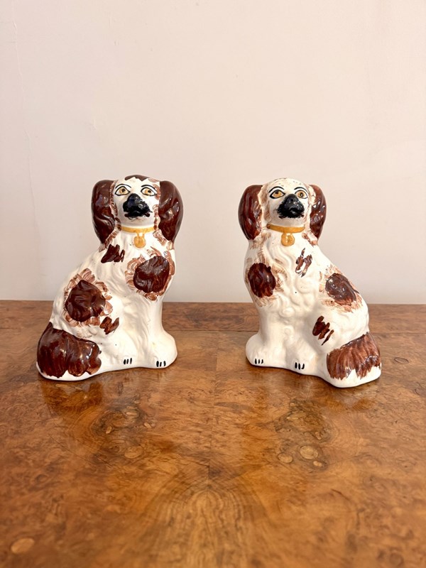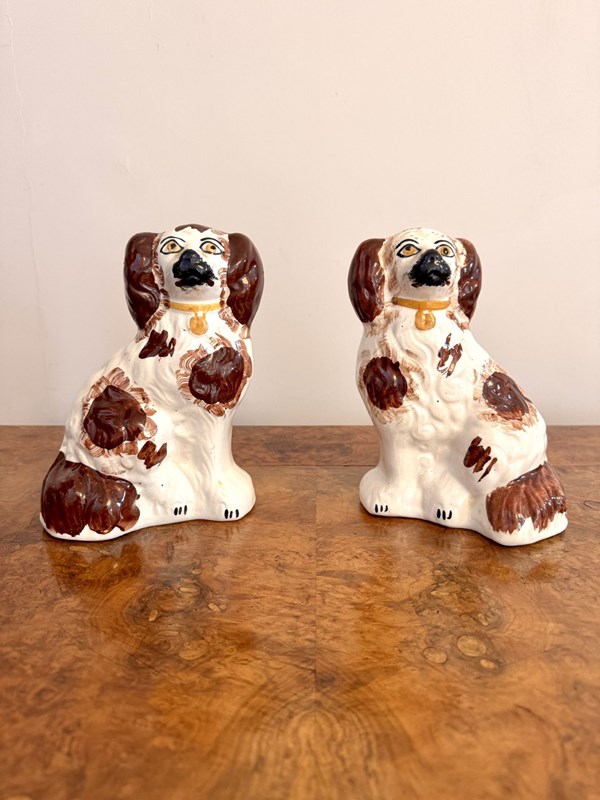 Pair of antique Staffordshire dogs, having a pair of seated spaniels with white and brown coloured coats and matching collars. D. 1900