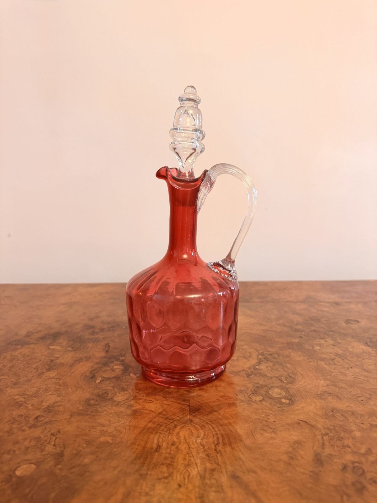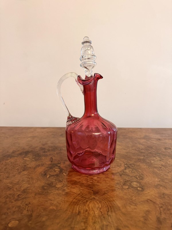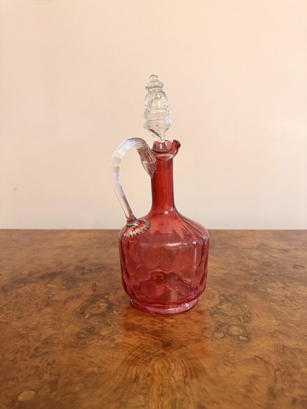 Pretty antique Victorian cranberry glass decanter, having a pretty antique Victorian cranberry glass decanter with a wavy shaped top and a shaped clear glass handle to the back with the original glass stopper. D. 1860