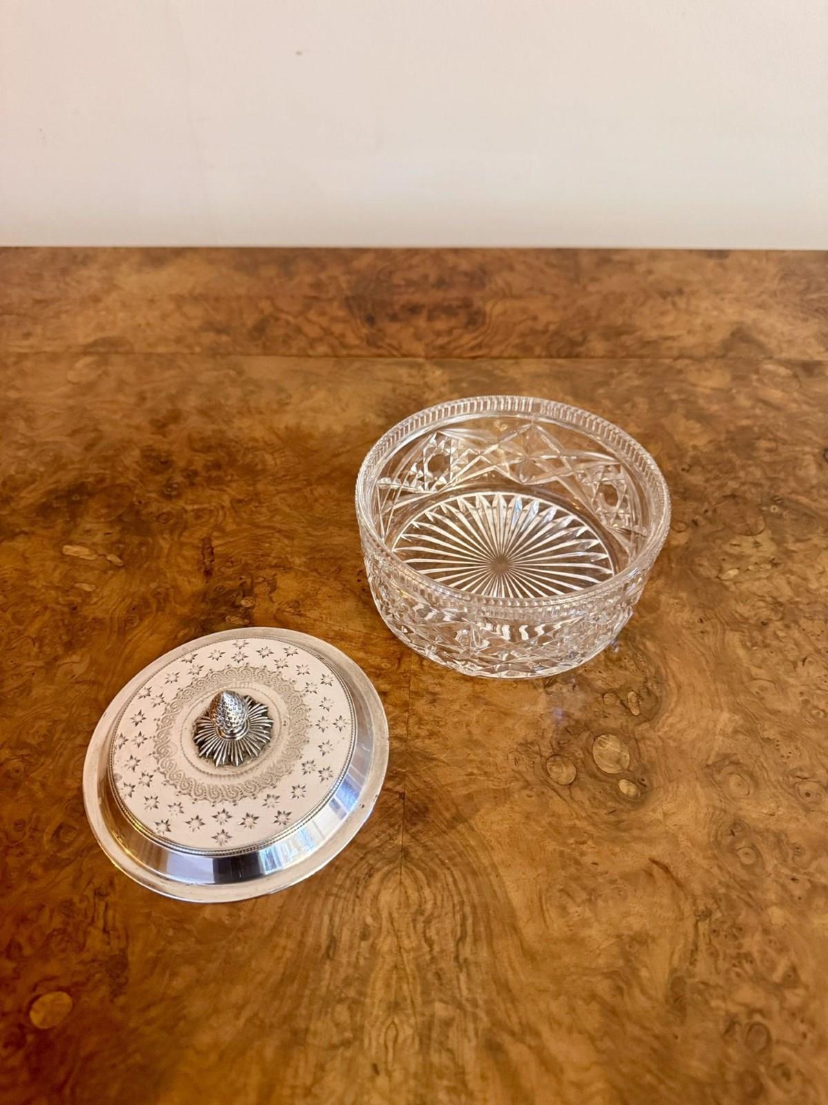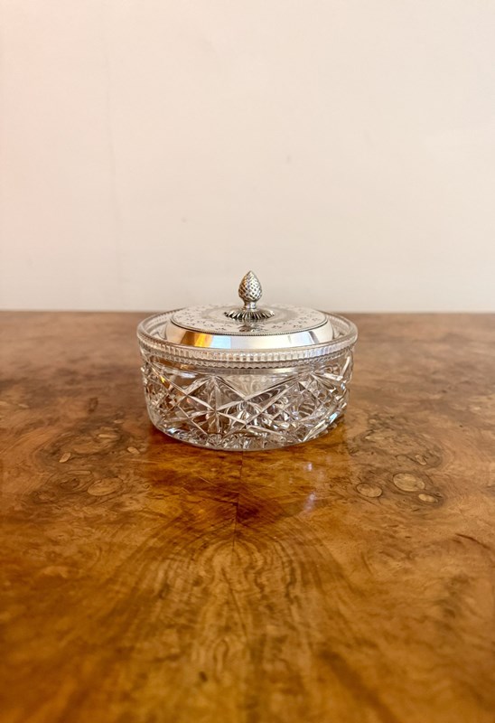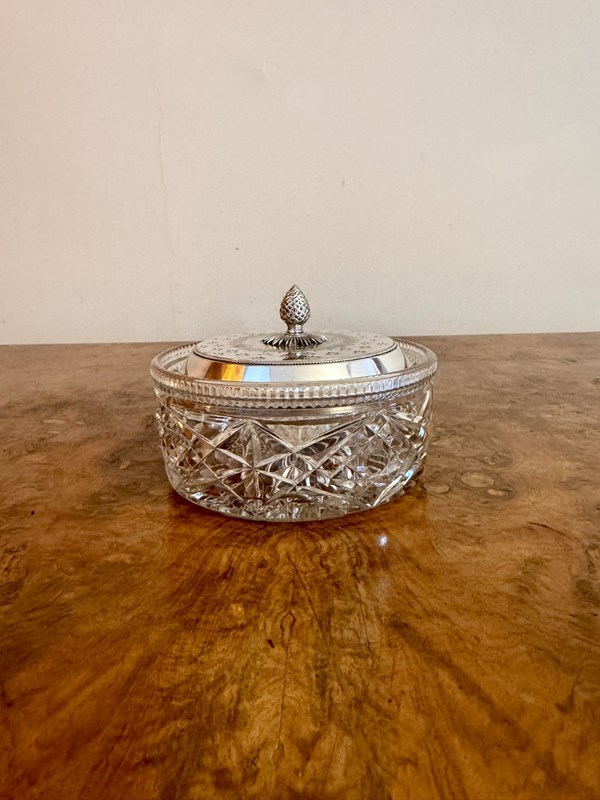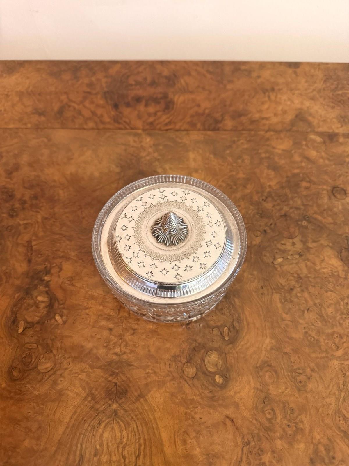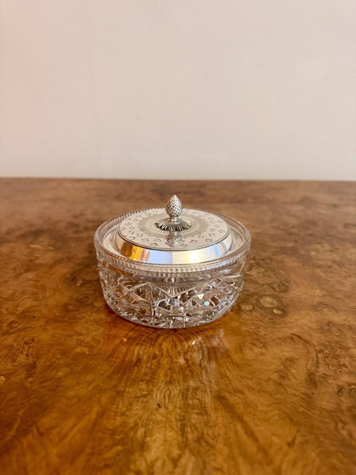Pretty quality antique Edwardian cut glass trinket box, having a quality antique Edwardian trinket box with a silver plated lid above a cut glass body. D. 1900