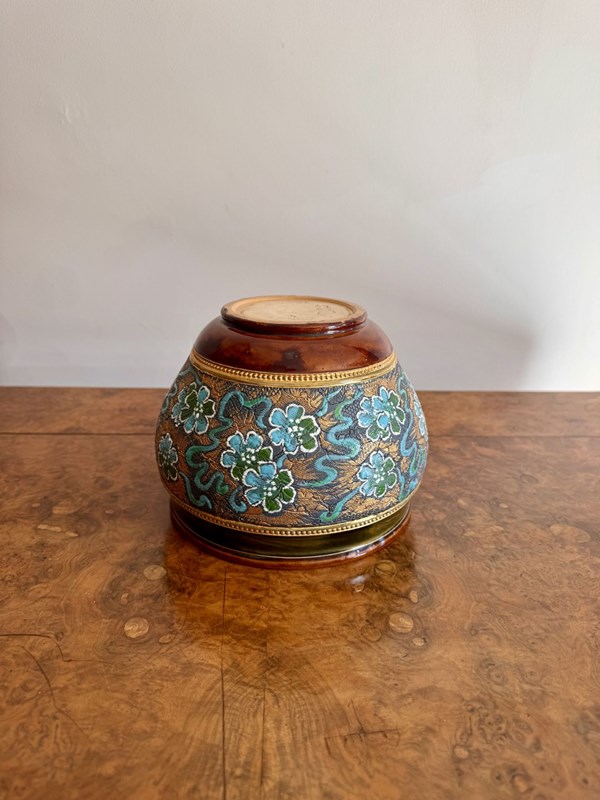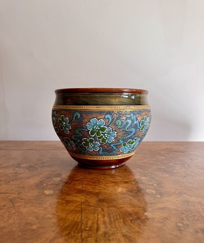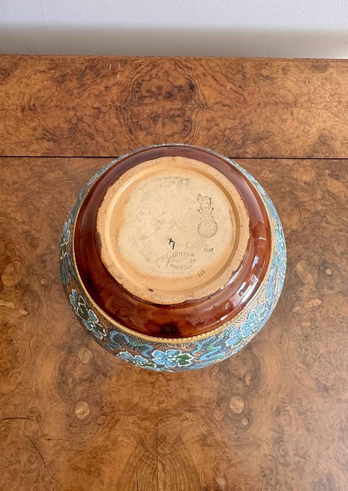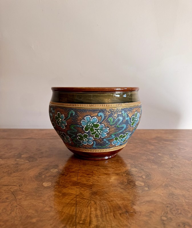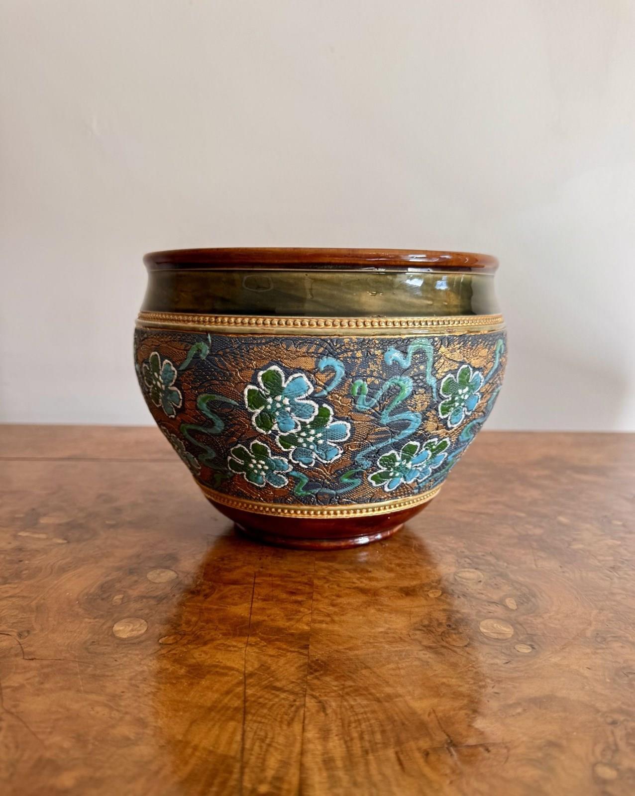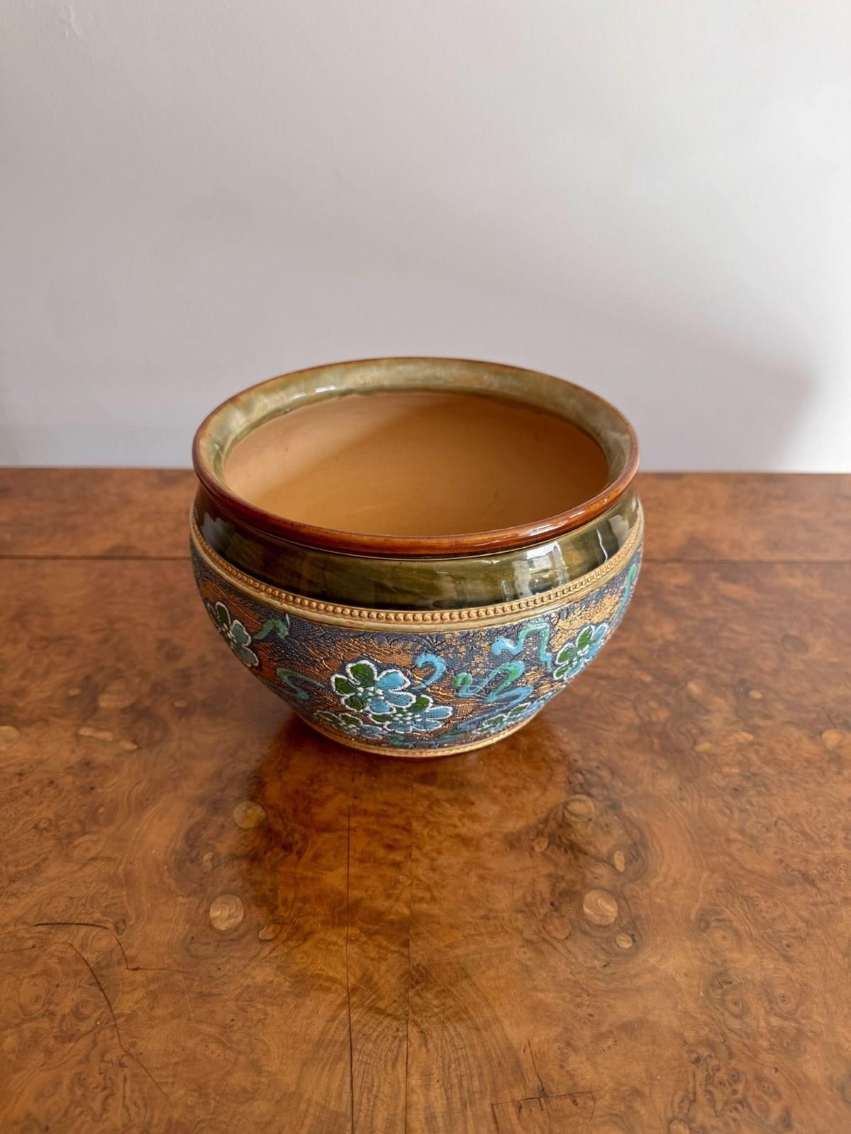 Pretty quality antique Royal Doulton jardiniere, having a quality antique Royal Doulton Jardiniere with a brown rim above a green and gold border, with a golden ground decorated with blue and green flowers, with a glazed finish, raised on a circular shaped base. Stamped to the base as shown. D. 1920