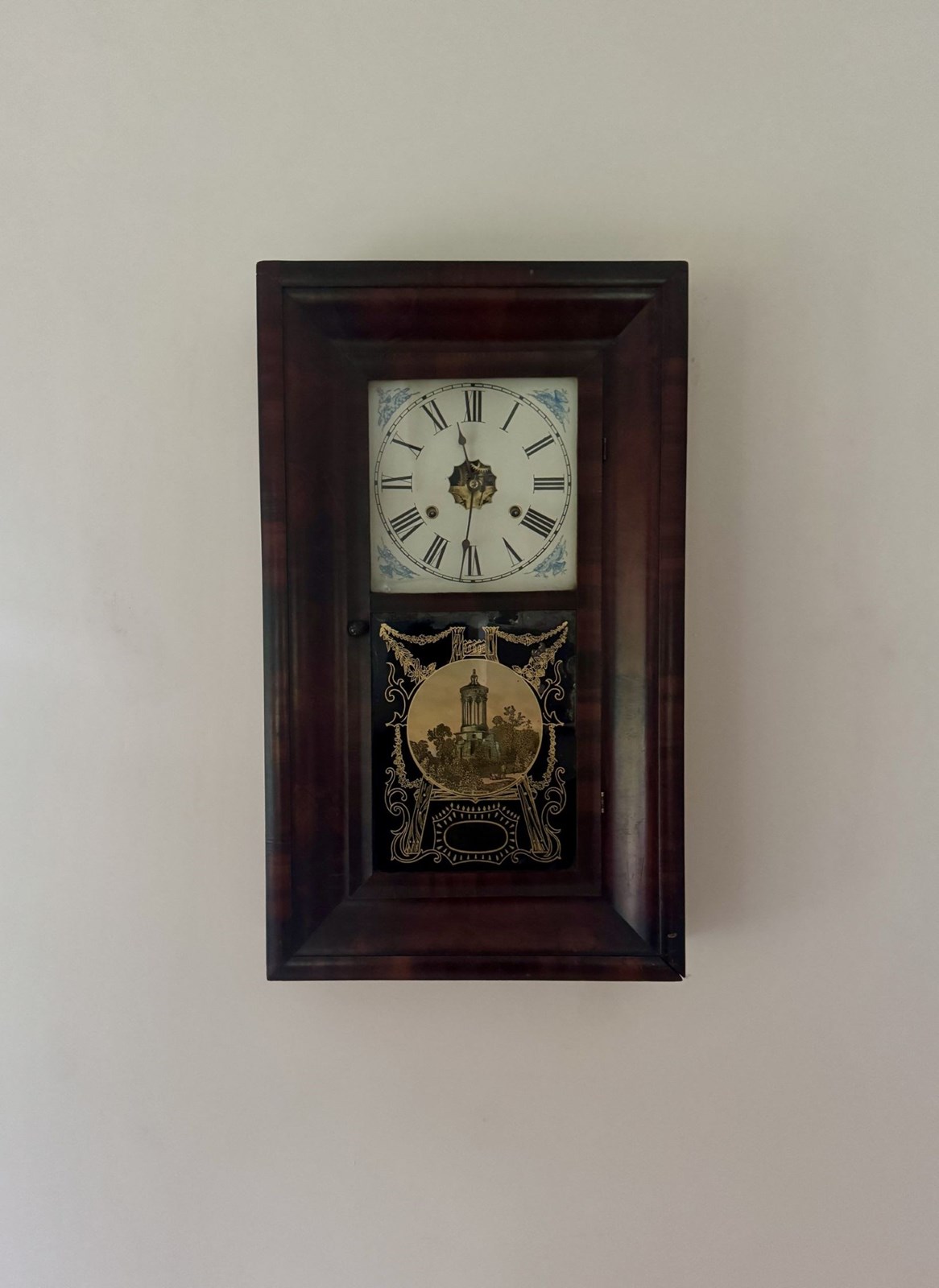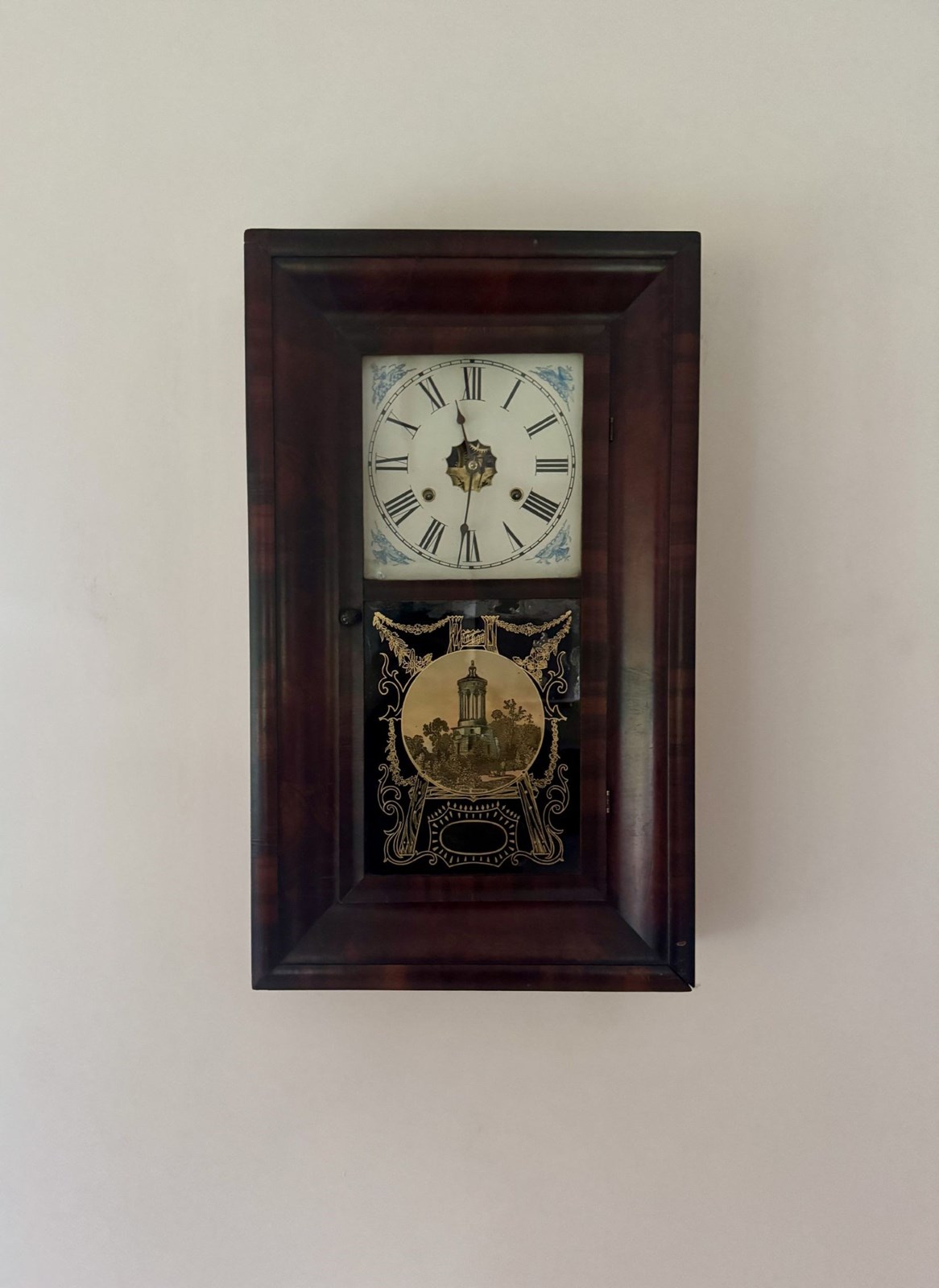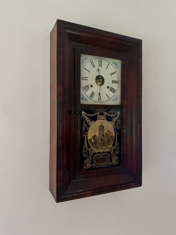 Quality 19th century mahogany American wall clock, having a quality antique wall clock with a rectangular shaped mahogany case with a single glazed door with a painted panel depicting the Burns monument, opening to reveal a 9 inch painted dial with Roman numerals and the original black spade hands, a drop down weighted pendulum, having an eight day movement striking on a gong. All clocks get serviced prior to delivery. D. 1860