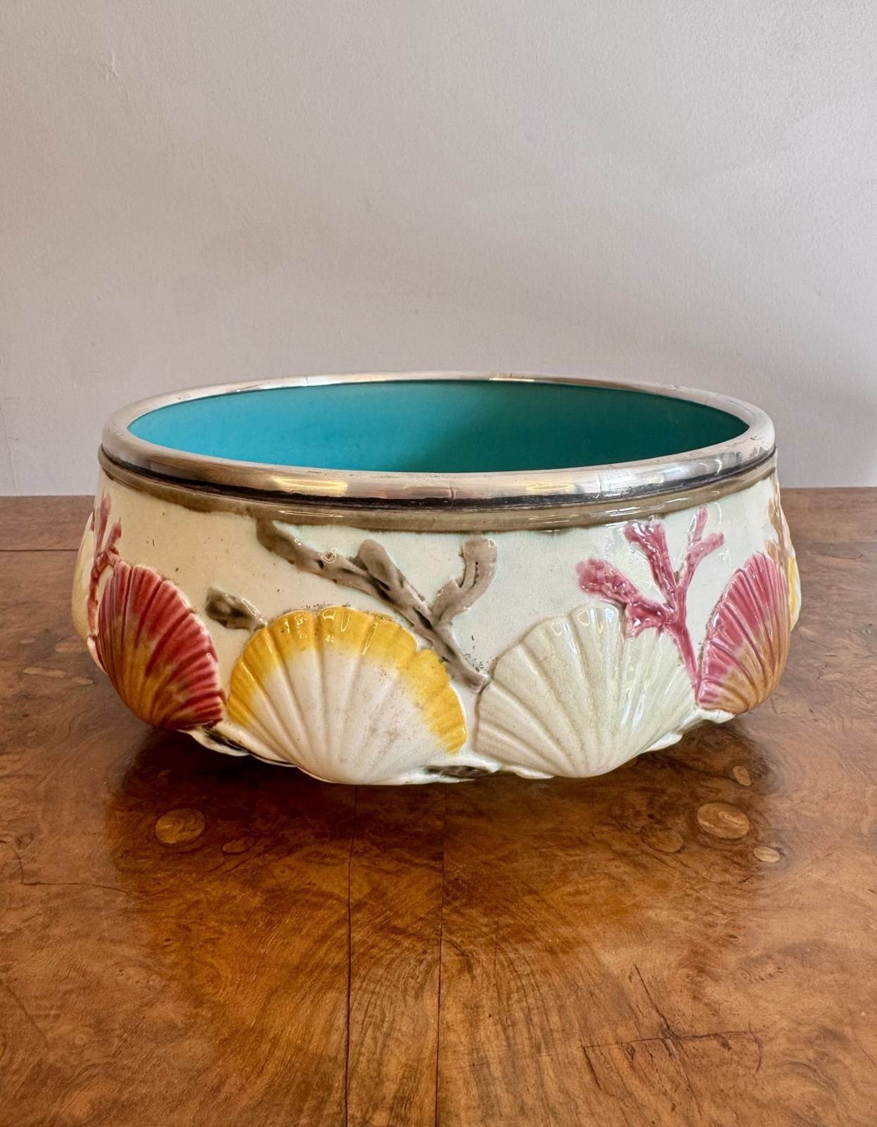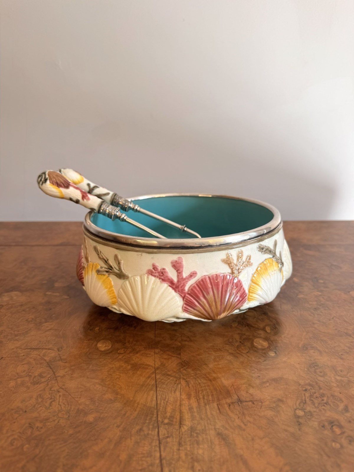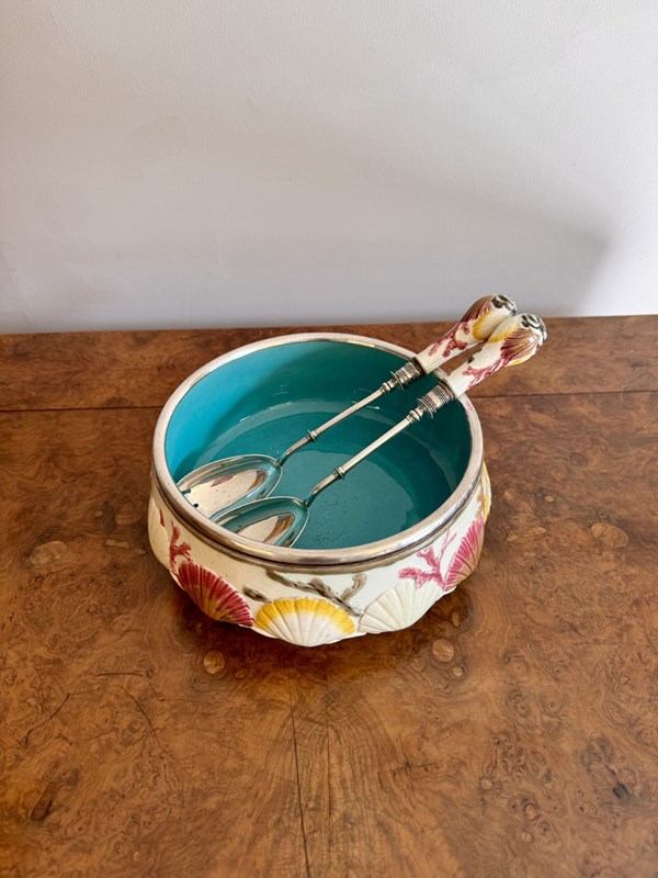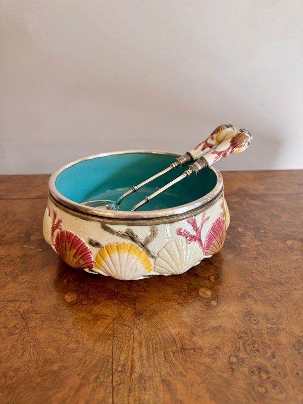 Quality antique 19th century majolica salad bowl and servers, having a quality majolica salad bowl decorated with embossed clam shells around the centre above seaweed towards the base, on a cream ground hand painted in pretty pastel tones in yellow, pink and green, finished with a silver plated rim, having a turquoise glazed centre, accompanied by the original silver plated servers. D. 1860