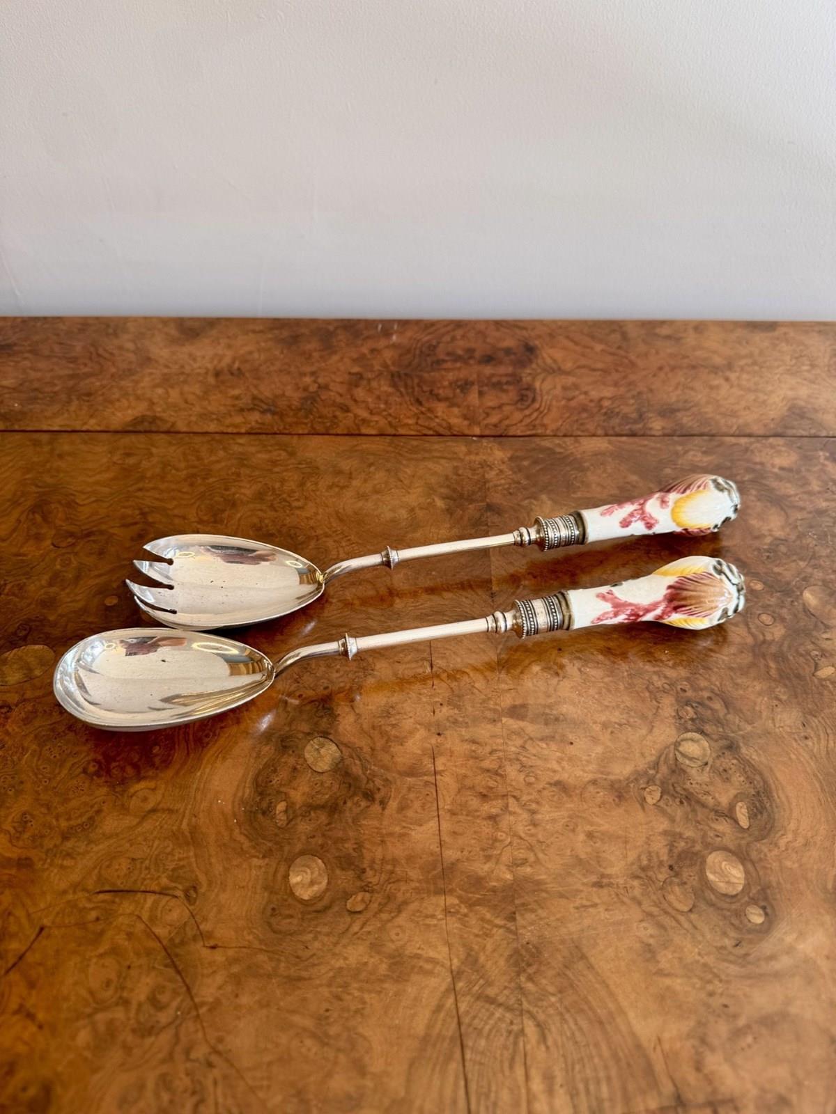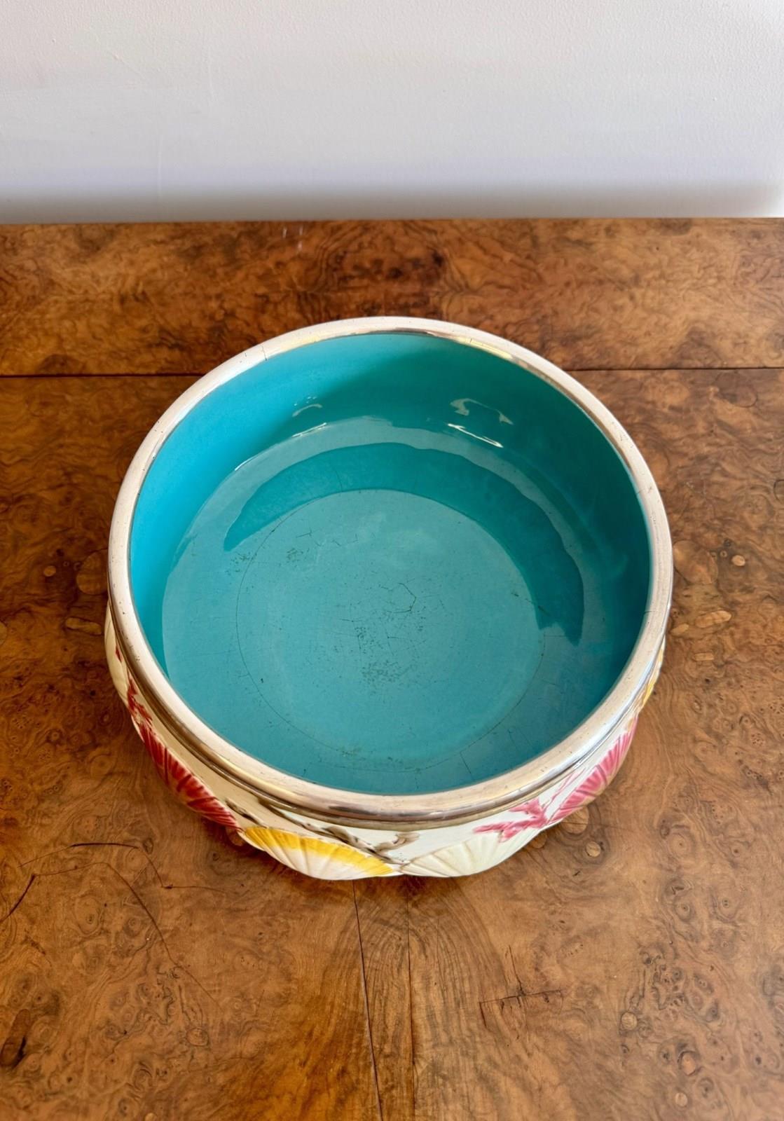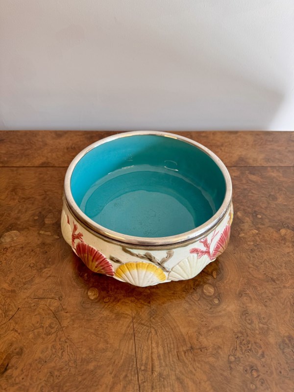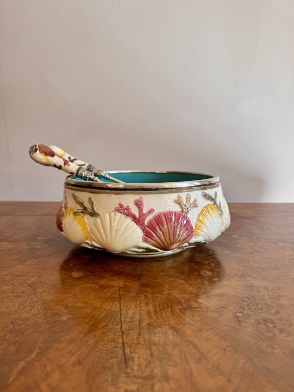 Quality antique 19th century majolica salad bowl and servers, having a quality majolica salad bowl decorated with embossed clam shells around the centre above seaweed towards the base, on a cream ground hand painted in pretty pastel tones in yellow, pink and green, finished with a silver plated rim, having a turquoise glazed centre, accompanied by the original silver plated servers. D. 1860