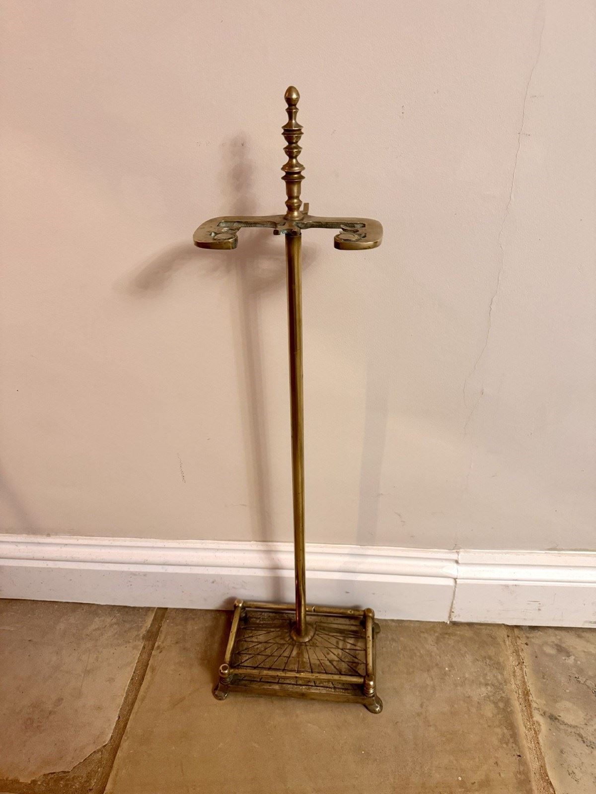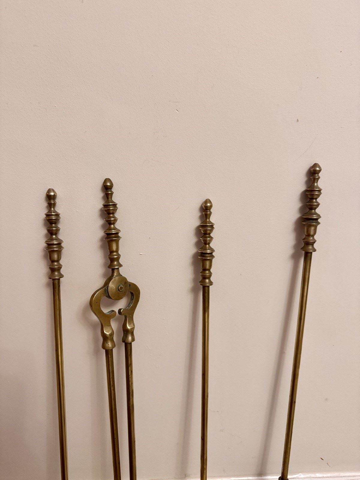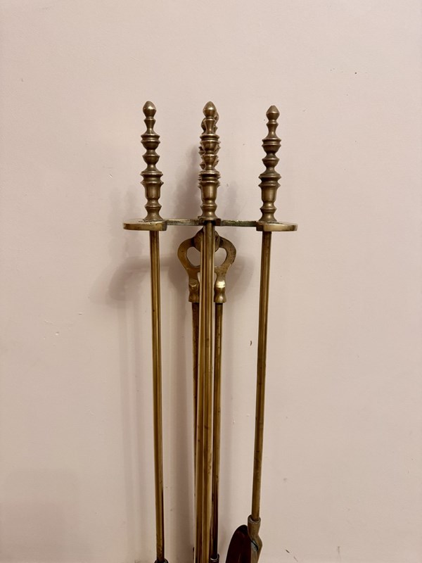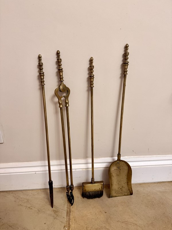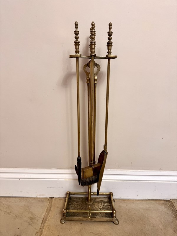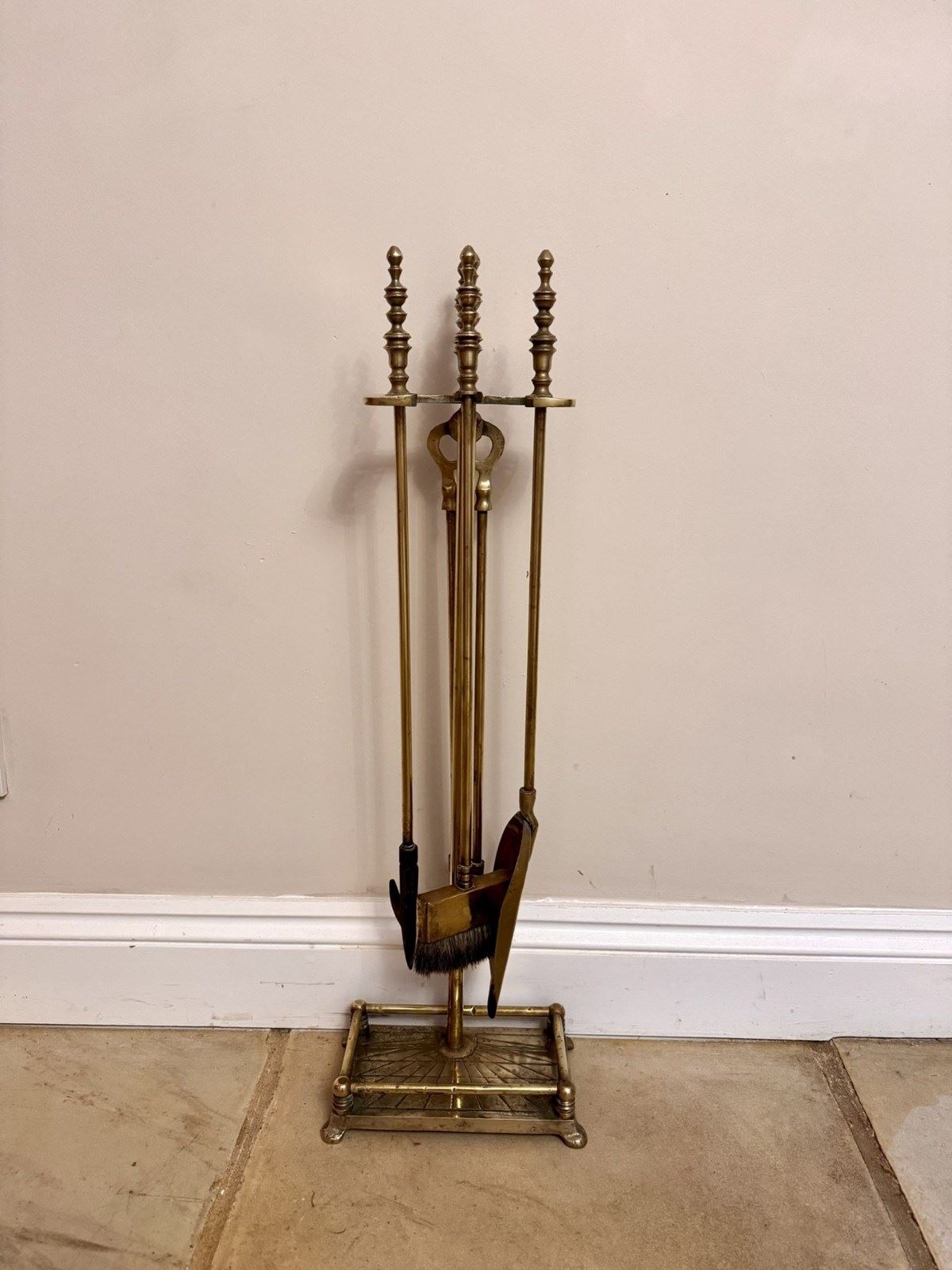 Quality antique Edwardian brass companion set and stand, having a quality antique Edwardian brass stand with a pair of brass fire tongs, a brass shovel, a brass brush and a brass poker with shaped brass handles. D. 1900