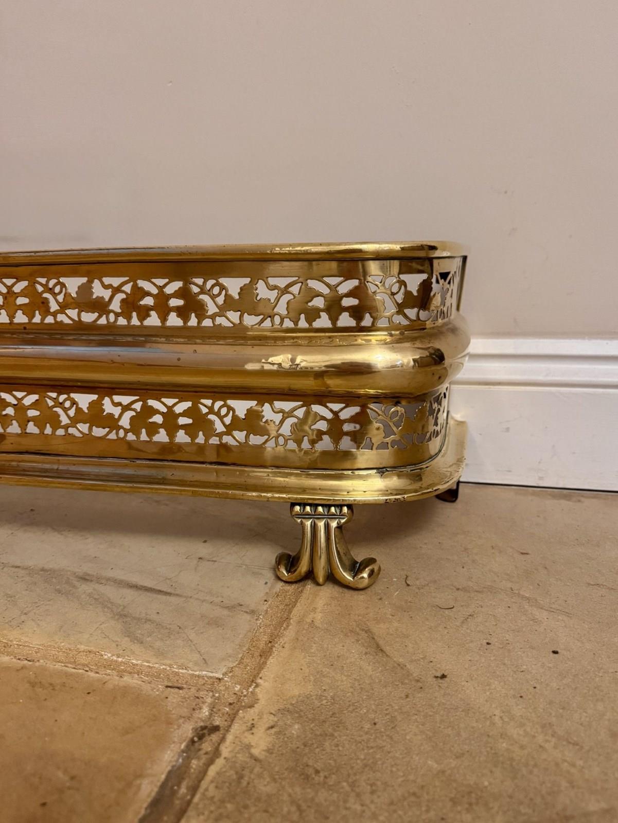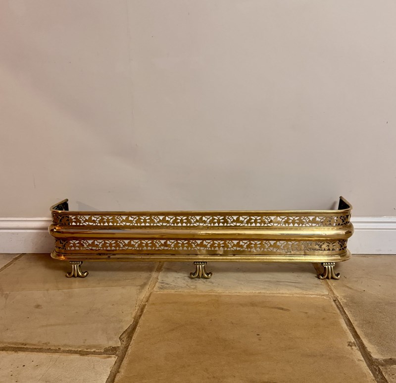 Quality antique Edwardian brass fire fender, having a quality brass fire fender with a pierced brass border above three scroll shaped feet. D. 1900