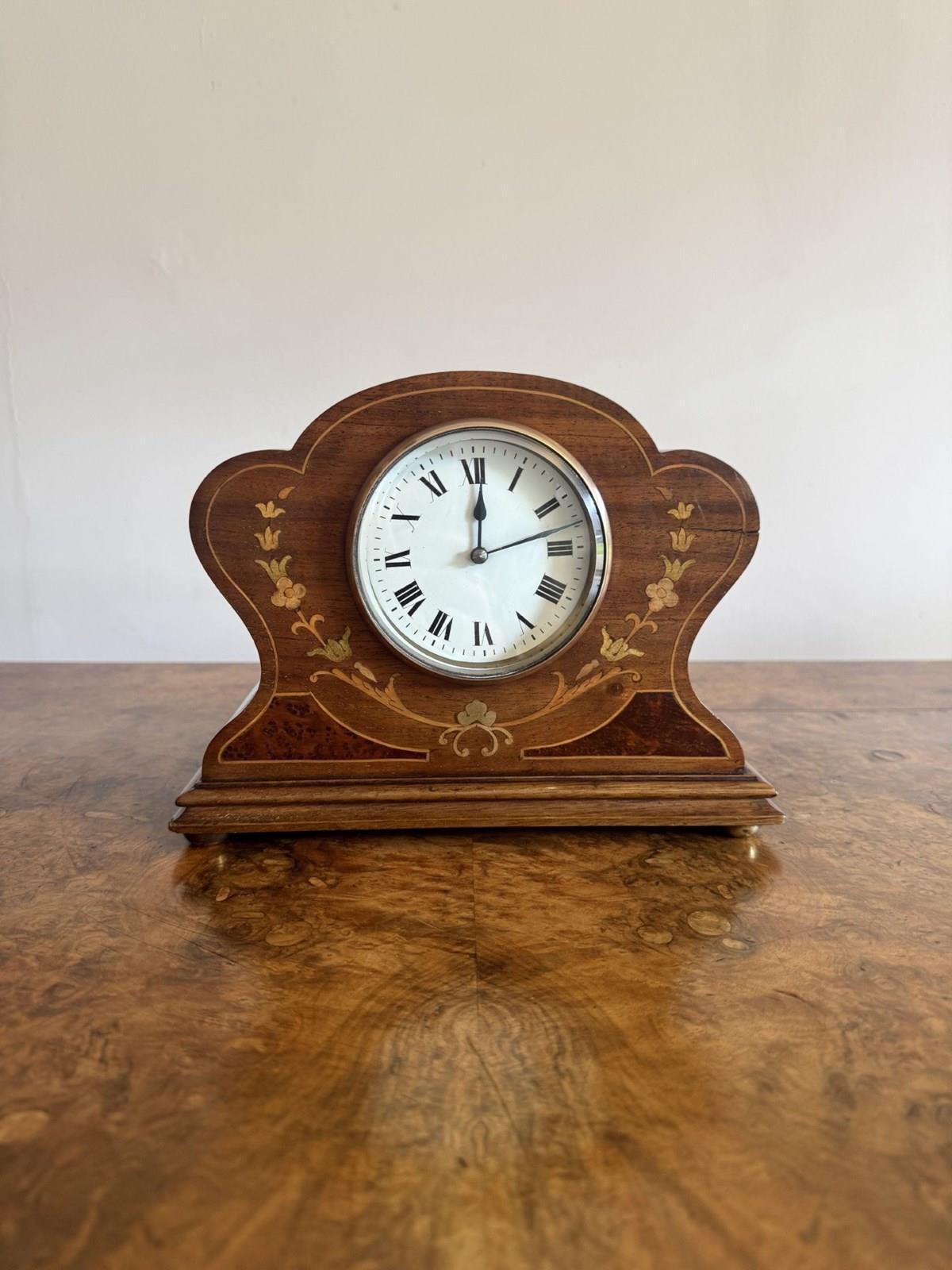 Quality antique Edwardian mahogany inlaid mantle clock, having a quality mahogany shaped case with attractive trailing floral inlay surrounding a circular shaped dial with black Roman numerals and the original black spade hands, having an eight day movement, raised on brass bun feet. All clocks get serviced prior to delivery. D. 1900