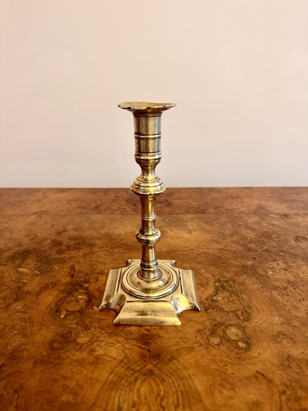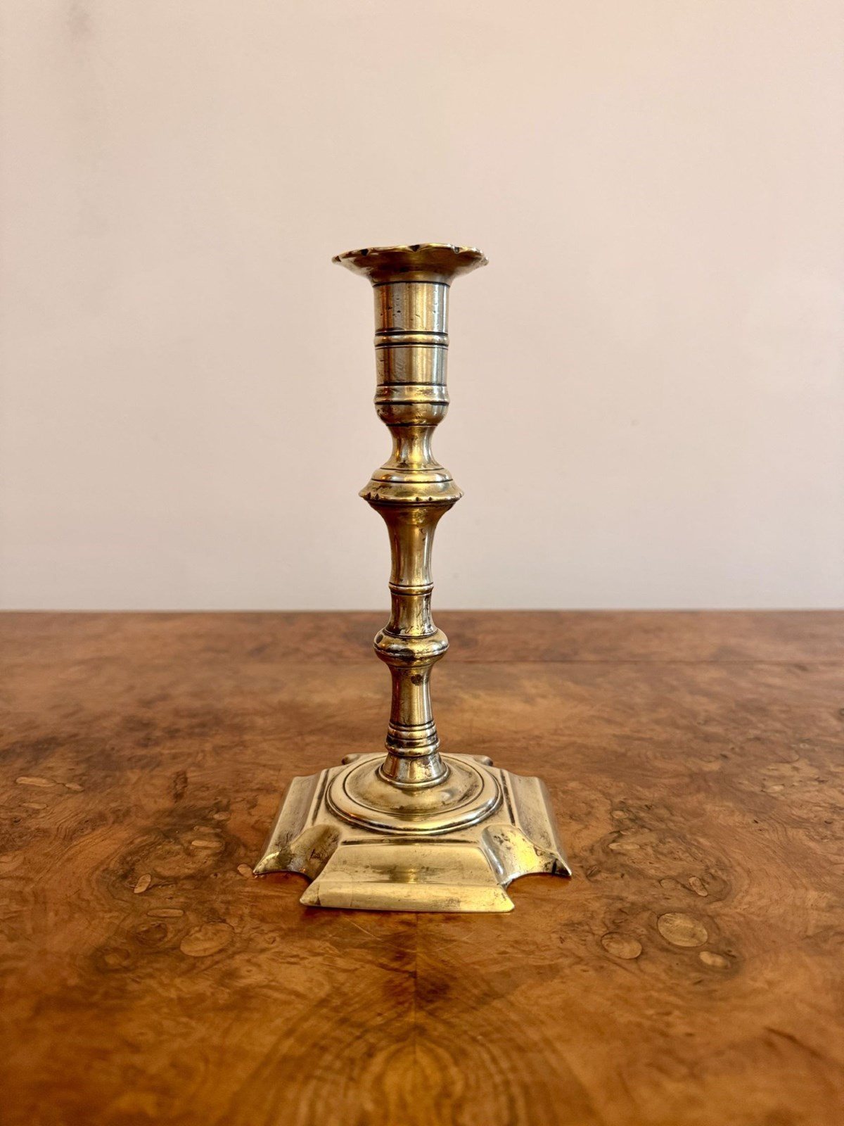 Quality antique Queen Ann brass candlestick, having a quality original antique Queen Ann brass candlestick raised on a shaped base. D. 1705