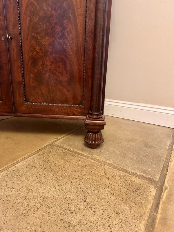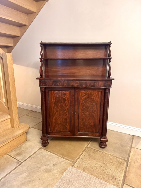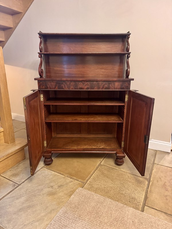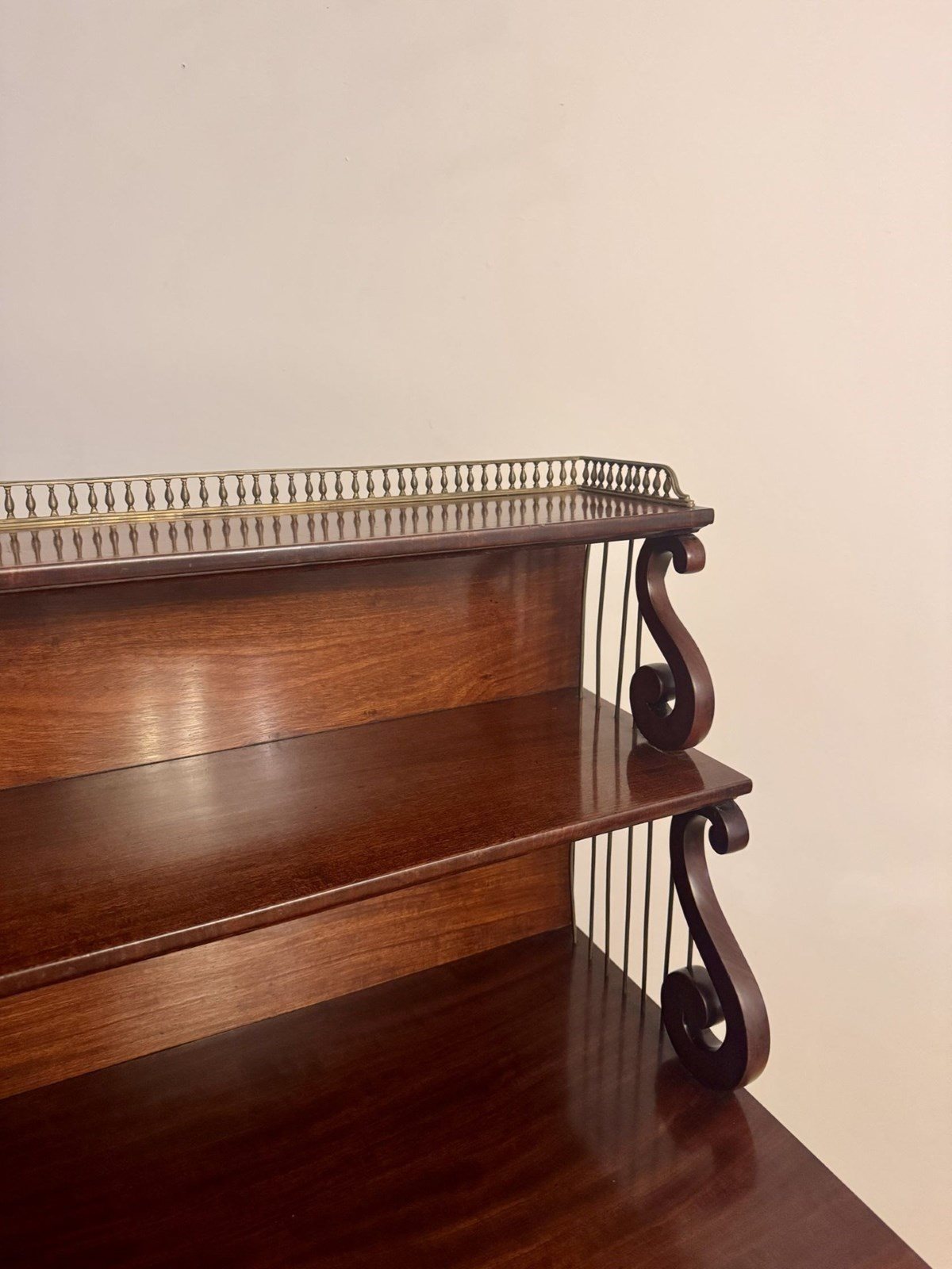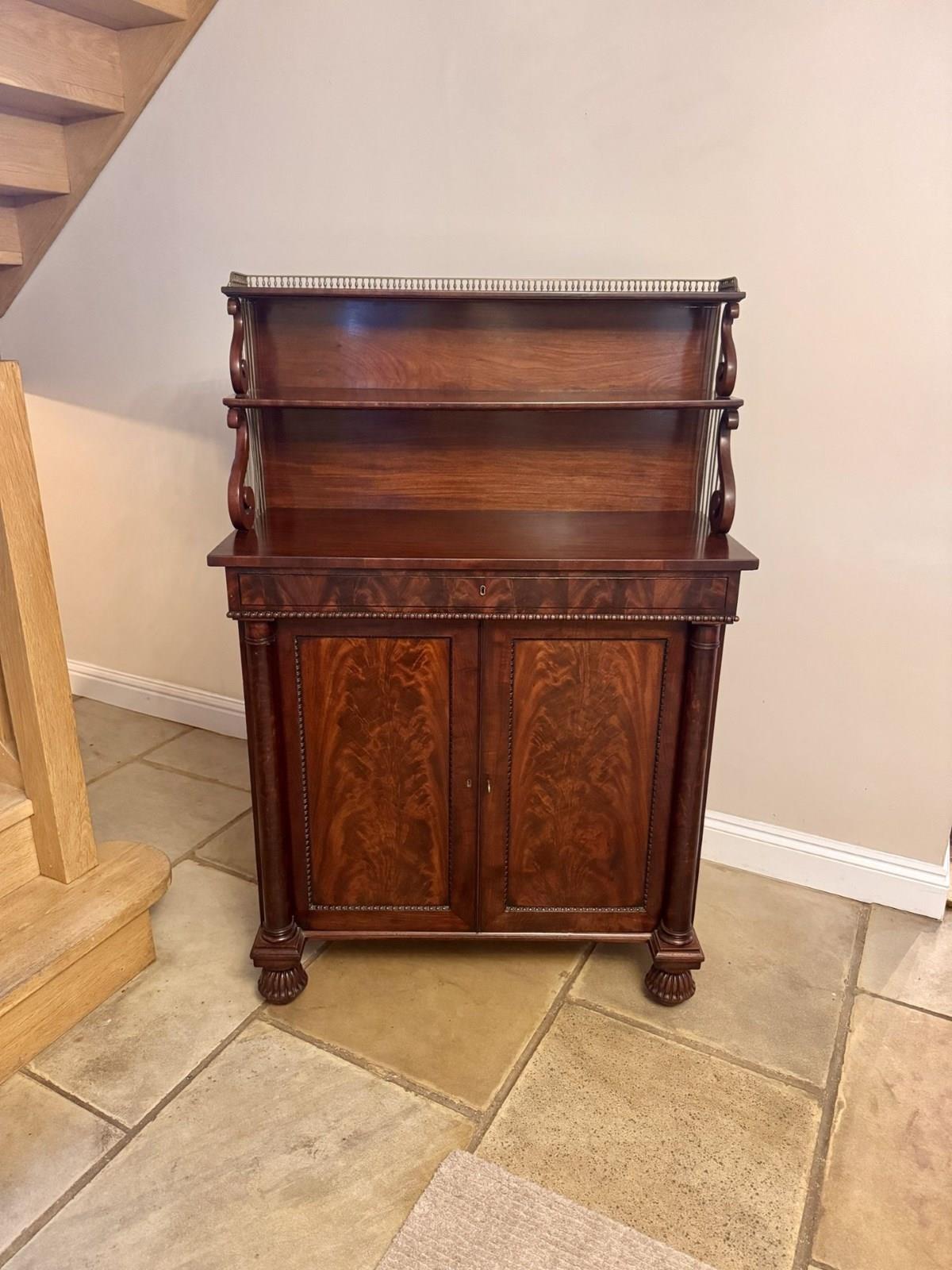 Quality antique Regency mahogany chiffonier, having a quality Regency mahogany chiffonier with brass gallery above the stepped back with serpentine supports, the base with a frieze drawer above a pair of panelled cupboard doors opening to reveal two shelves, raised on lobed bun feet. D. 1820