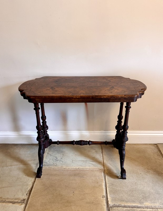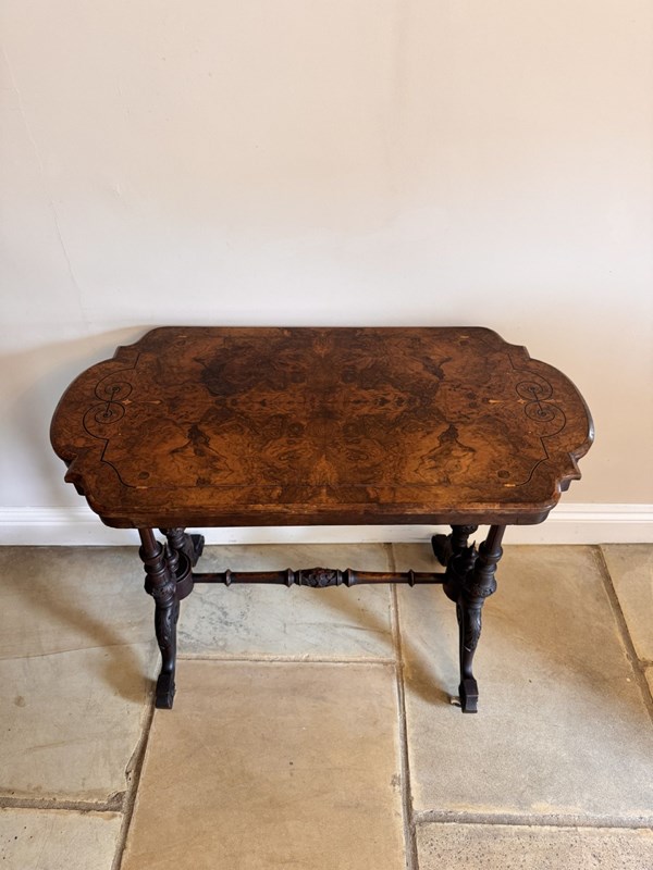 Quality antique Victorian burr walnut occasional table, having a quality antique Victorian occasional table with a burr walnut shaped top with inlaid decoration, on carved frame raised on the original castors. D. 1860