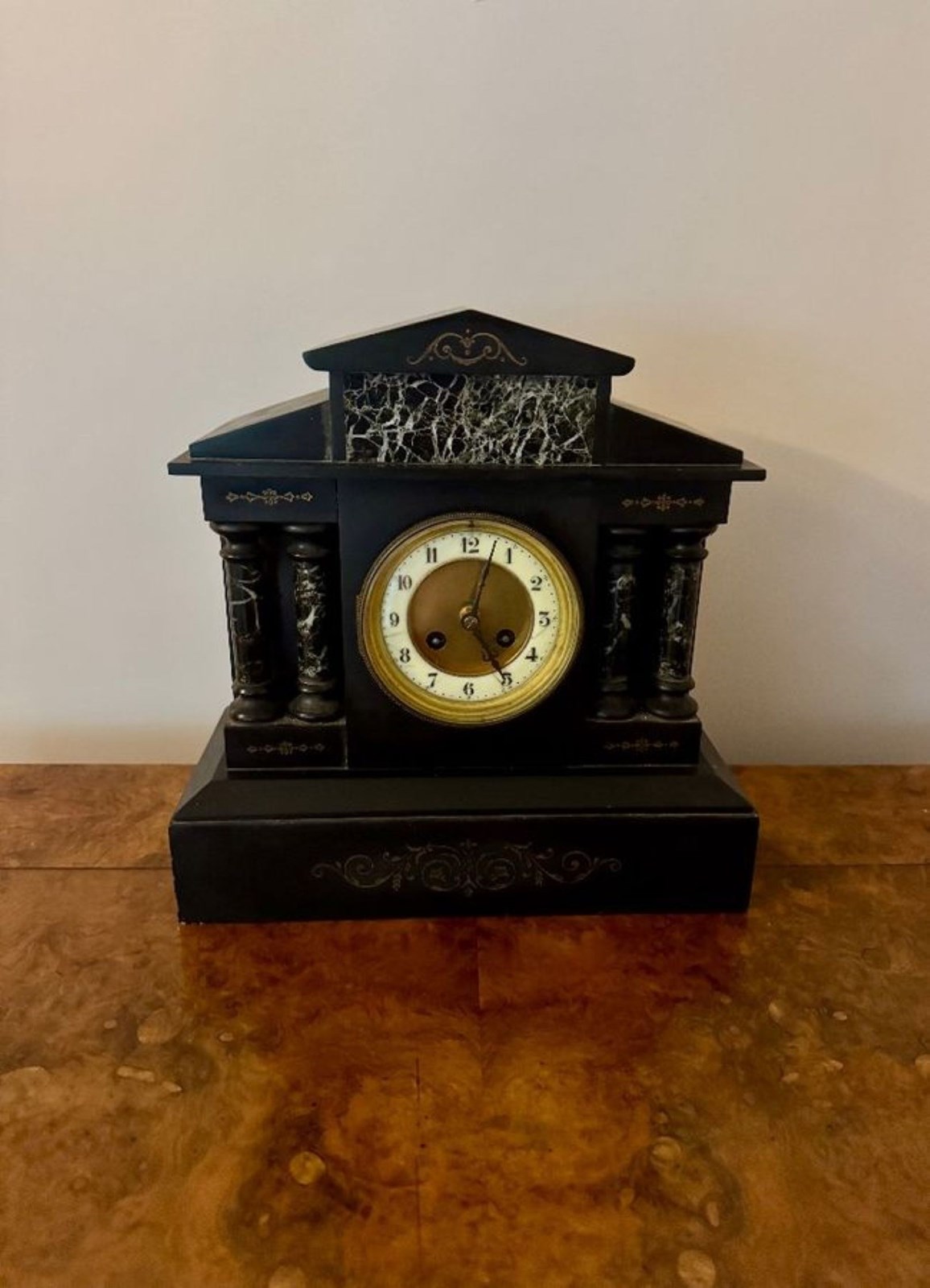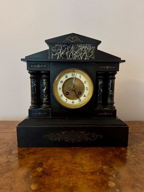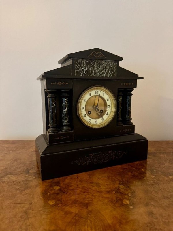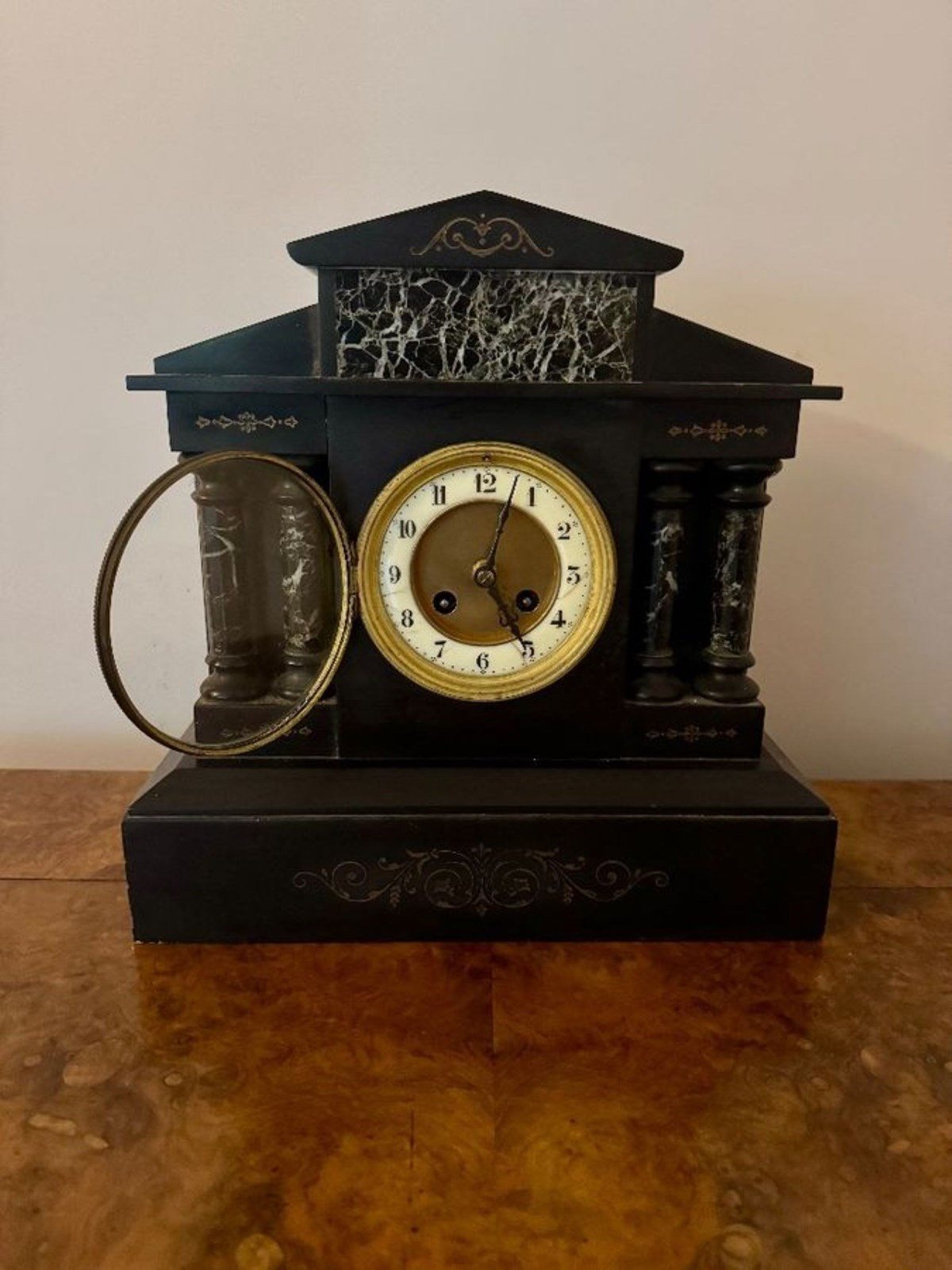 Quality antique Victorian eight day marble mantle clock, having a quality black slate and green marble cased mantel clock with two pairs of green flecked pillars flanking a 3.5inch brass bezel and chapter ring with Arabic numerals and the original hands, having an eight day movement striking the hour and half hour on a gong.