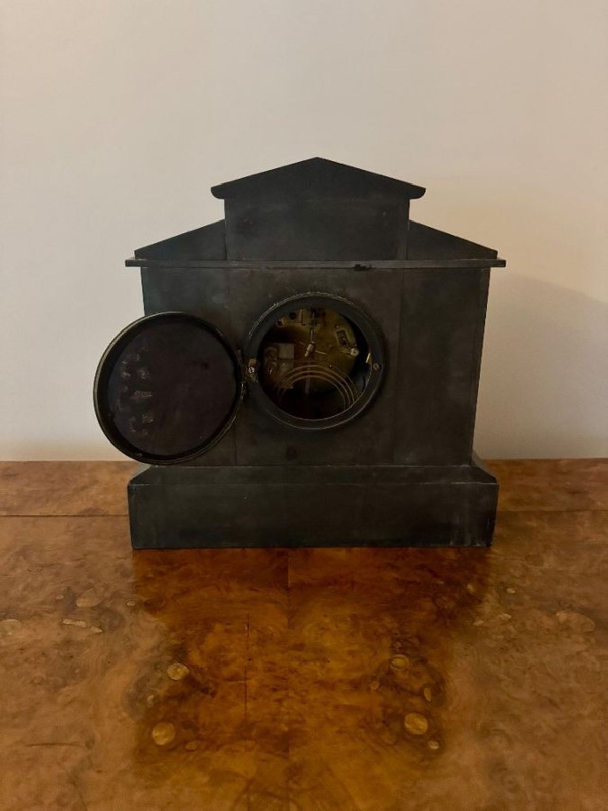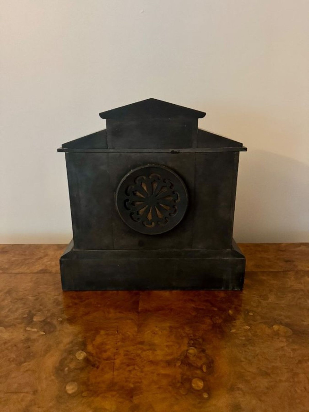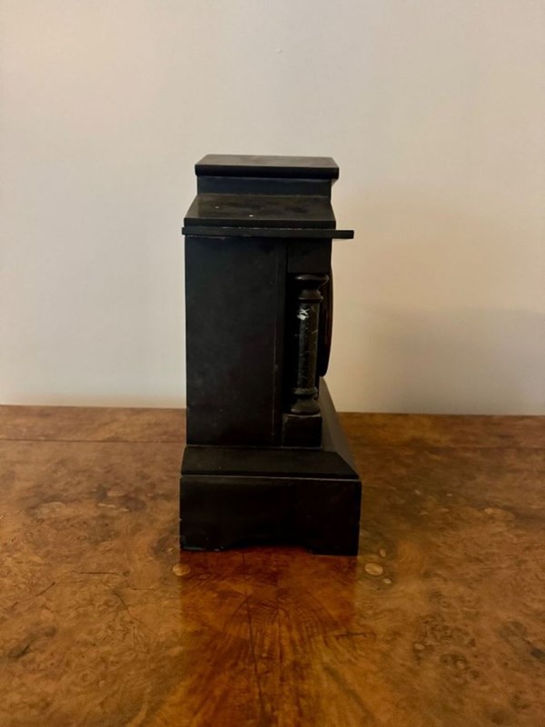 Quality antique Victorian eight day marble mantle clock, having a quality black slate and green marble cased mantel clock with two pairs of green flecked pillars flanking a 3.5inch brass bezel and chapter ring with Arabic numerals and the original hands, having an eight day movement striking the hour and half hour on a gong.