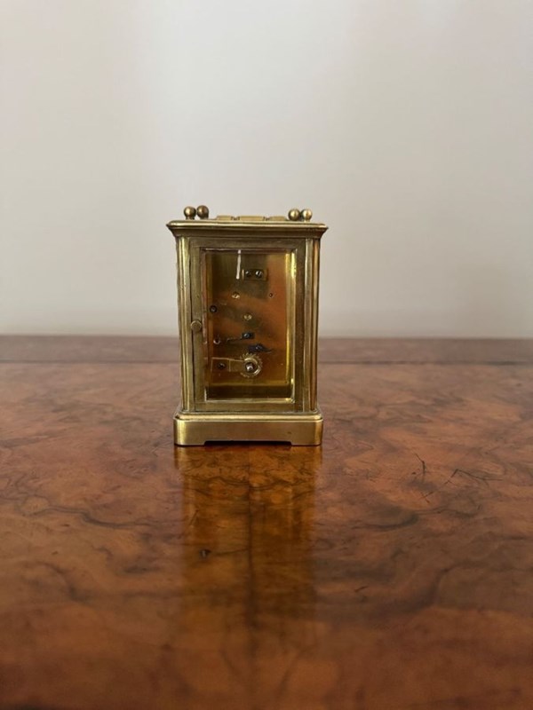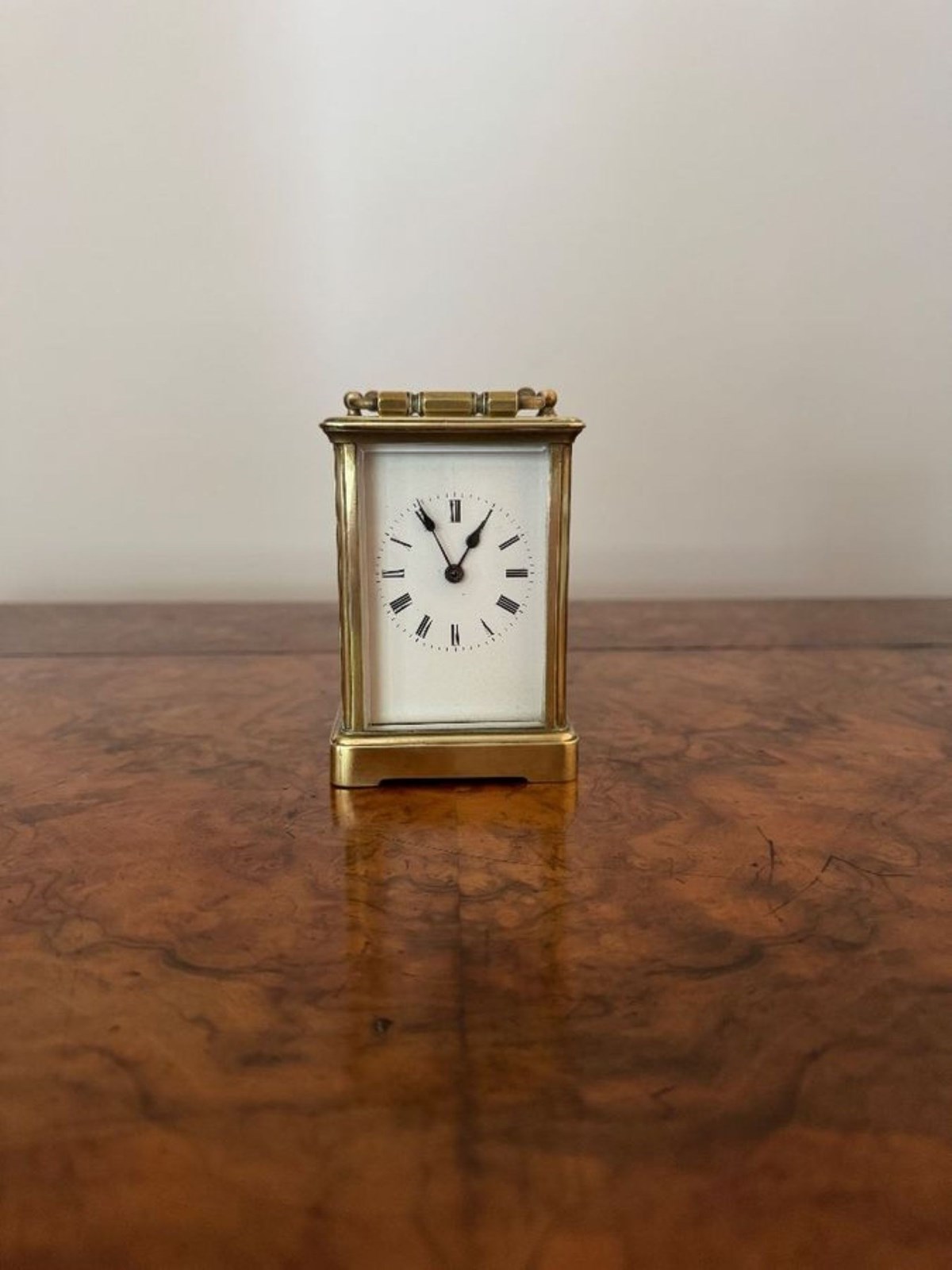 Quality antique Victorian French brass carriage clock having a quality brass case with bevelled glass, white enamel dial with original hands and key, eight day French movement and a handle to the top of the case. All clocks get serviced prior to delivery by a trusted horologist. D. 1880