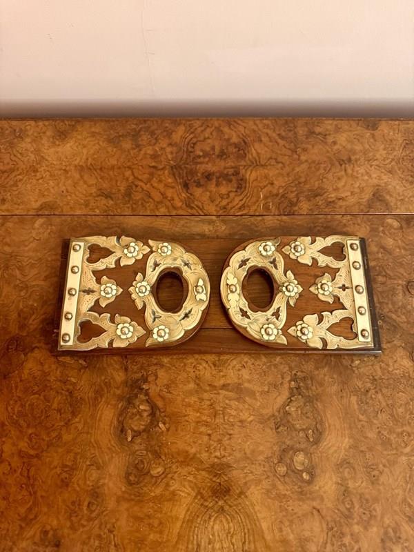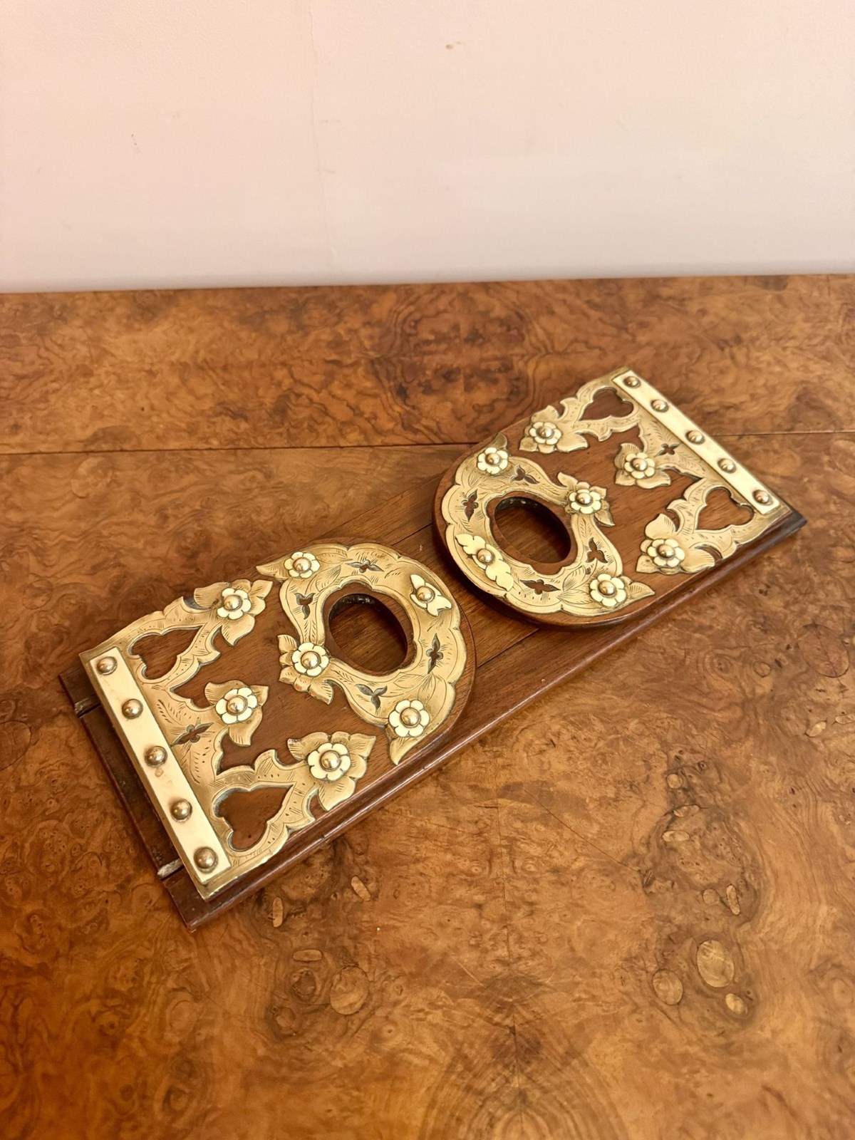 Quality antique Victorian walnut & brass mounted sliding bookends, having a quality sliding walnut book stand with engraved brass & walnut ends, extending to 57cm. D. 1860