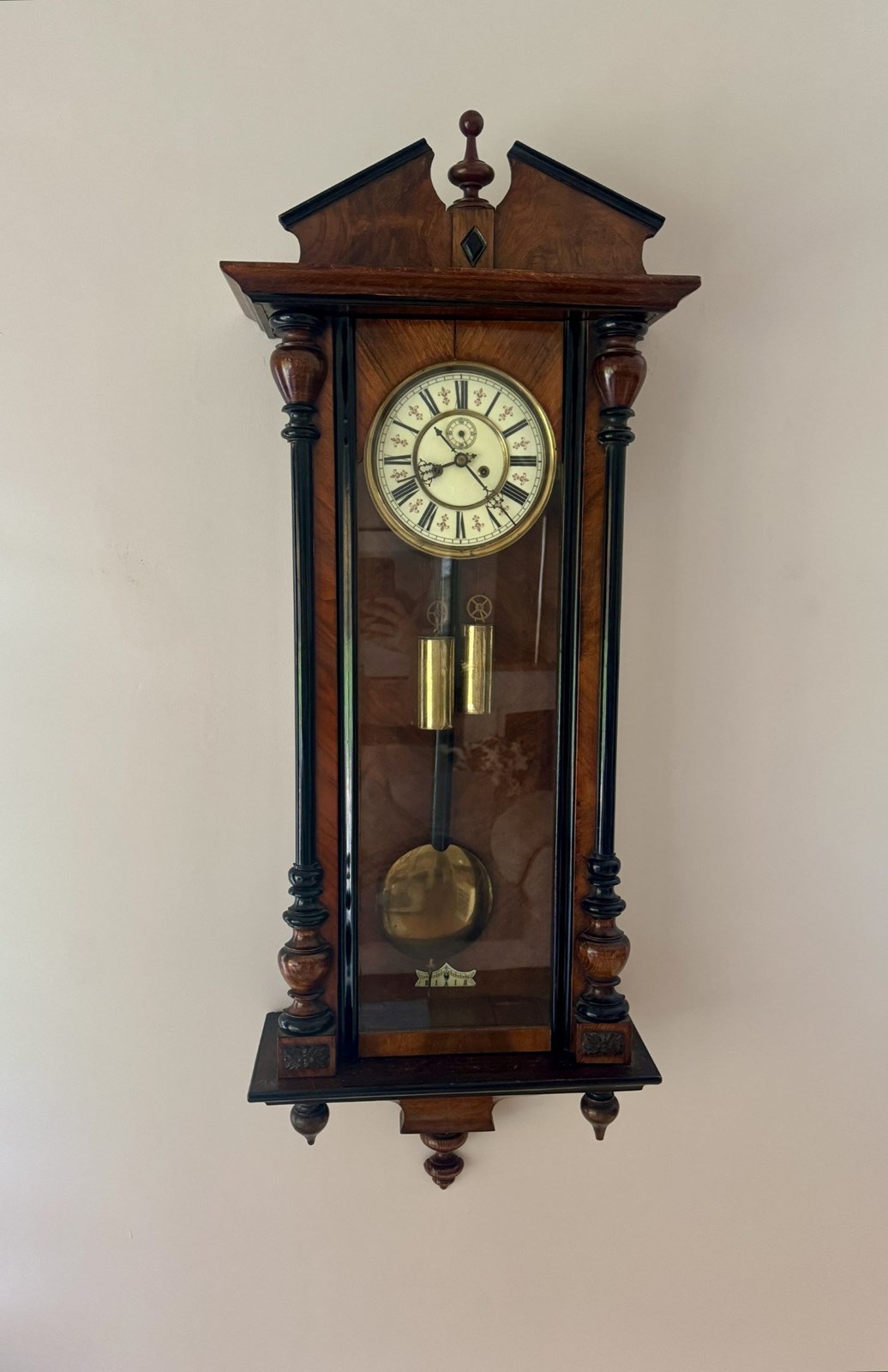 Quality antique Victorian walnut double weight wall clock, having a quality antique Victorian double weight wall clock with a quality walnut and ebonised case, having a single glazed door casing a quality circular dial surrounded by a brass bezel, having black Roman numerals with decorative red detail around the numerals and black ornate hands with a eight day movement striking on a gong, above the original brass weights and pendulum, having a shaped top and bottom. Includes a winding key. All clocks get serviced prior to delivery. D. 1860