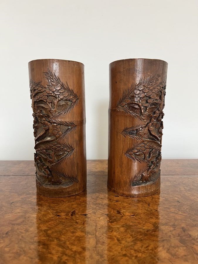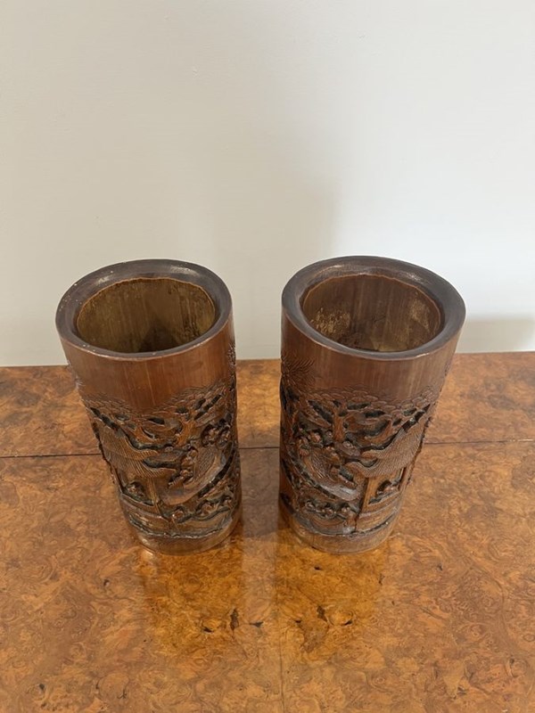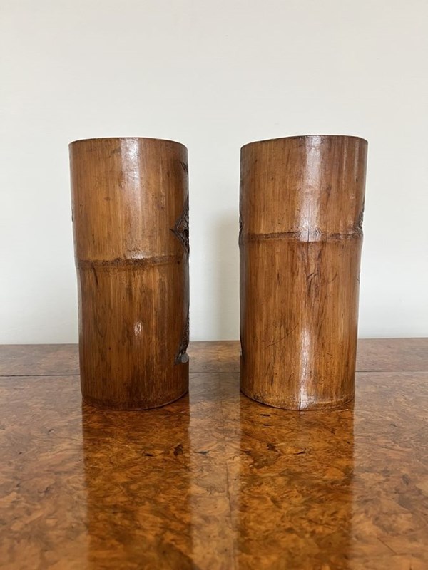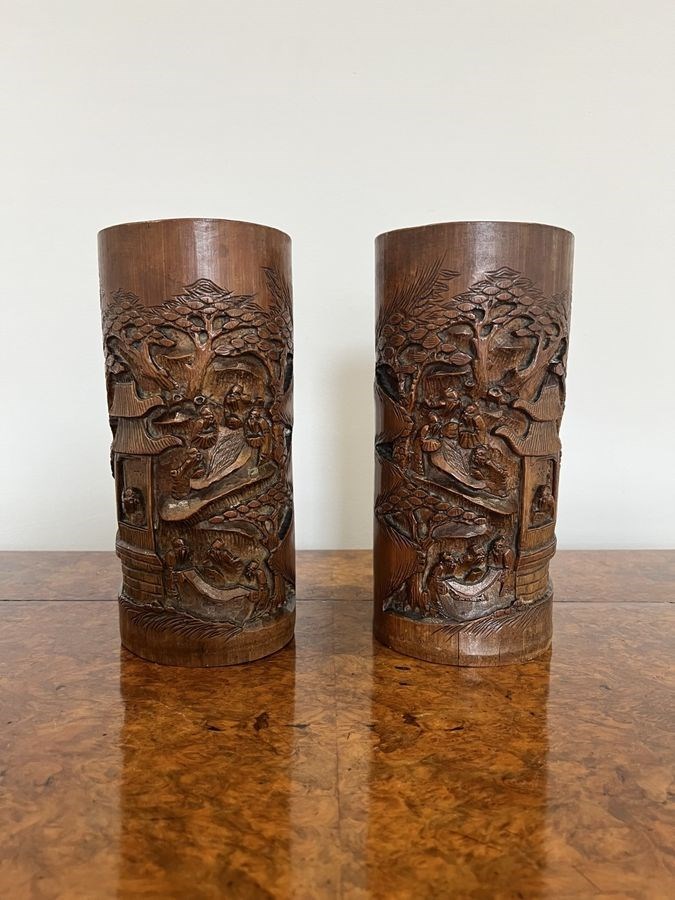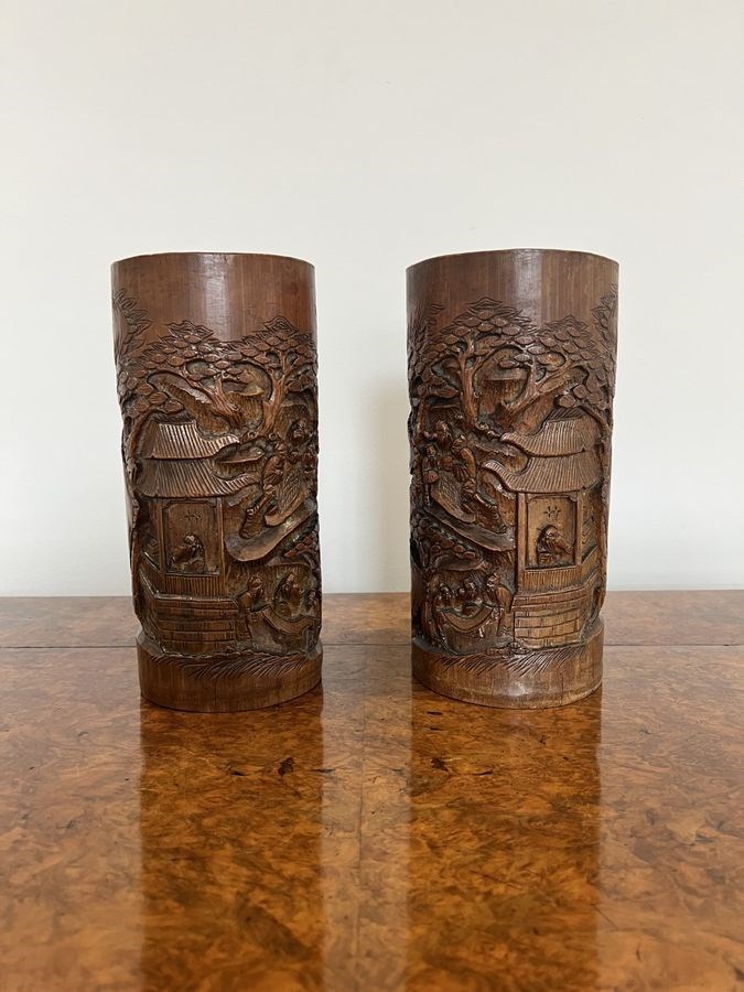 Quality carved bamboo brush pots having a quality pair of antique Chinese brush pots with quality carved decoration to the front with traditional scenes of figures, trees and a house.