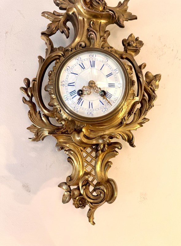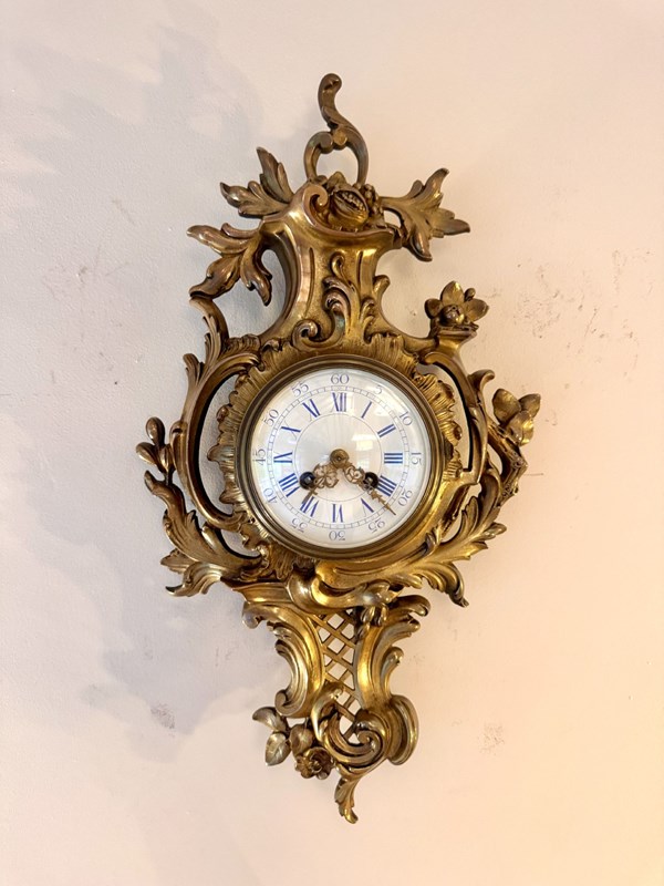 Stunning quality antique Victorian French neo Rococo wall clock, having a stunning quality antique 19th century French cartel wall clock, cased within a beautiful gilt metal neo rococo case with scrolling acanthus leaves surrounding a white circular enamel dial with blue Roman numerals having the original gold coloured ornate hands matching the style of the case, with a quality eight day French movement striking on a bell. D. 1830 All clocks get serviced prior to delivery.