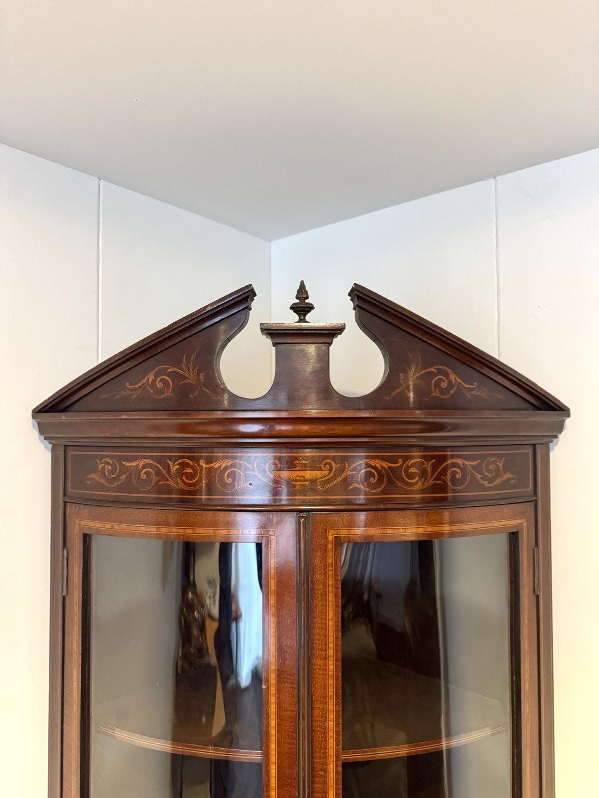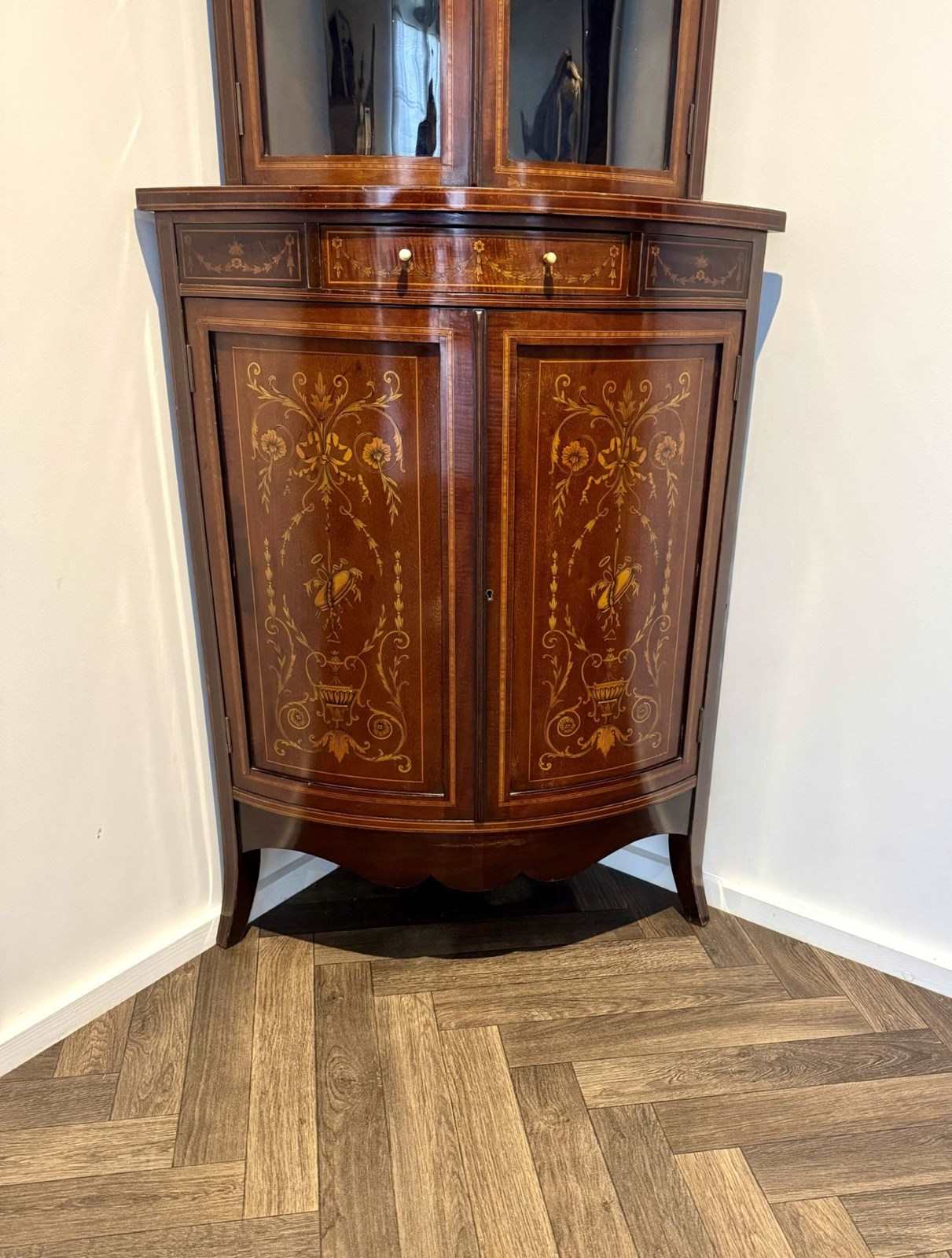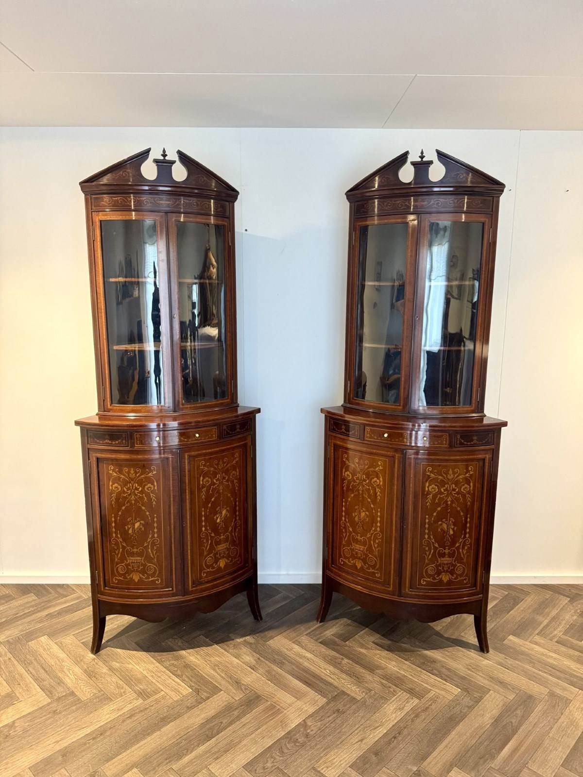 Superb Quality Pair Of Antique Edwardian Mahogany Marquetry Inlaid Corner Cabine