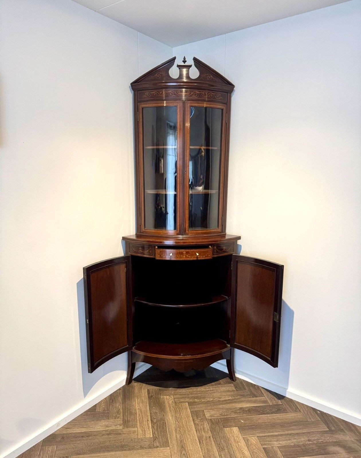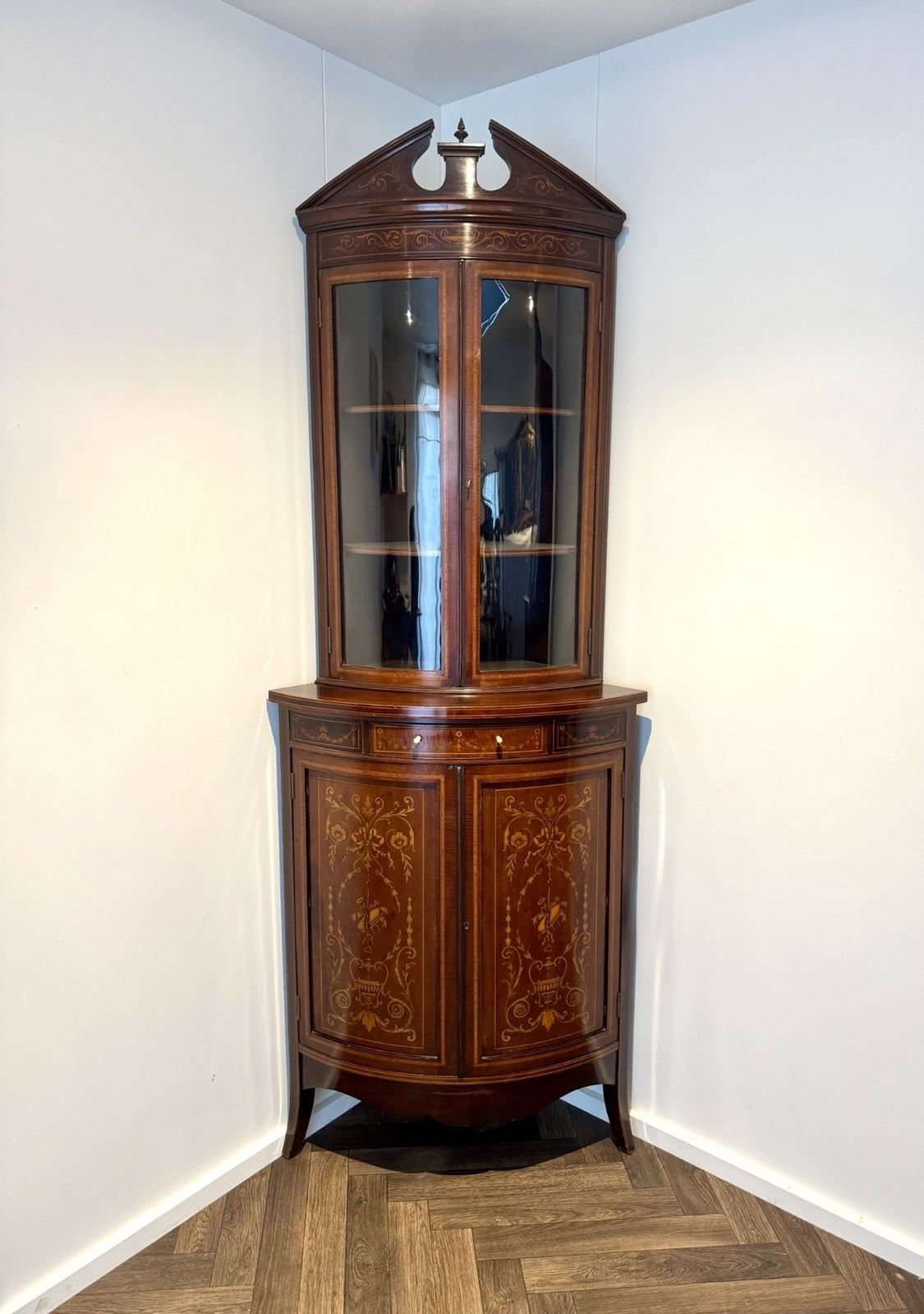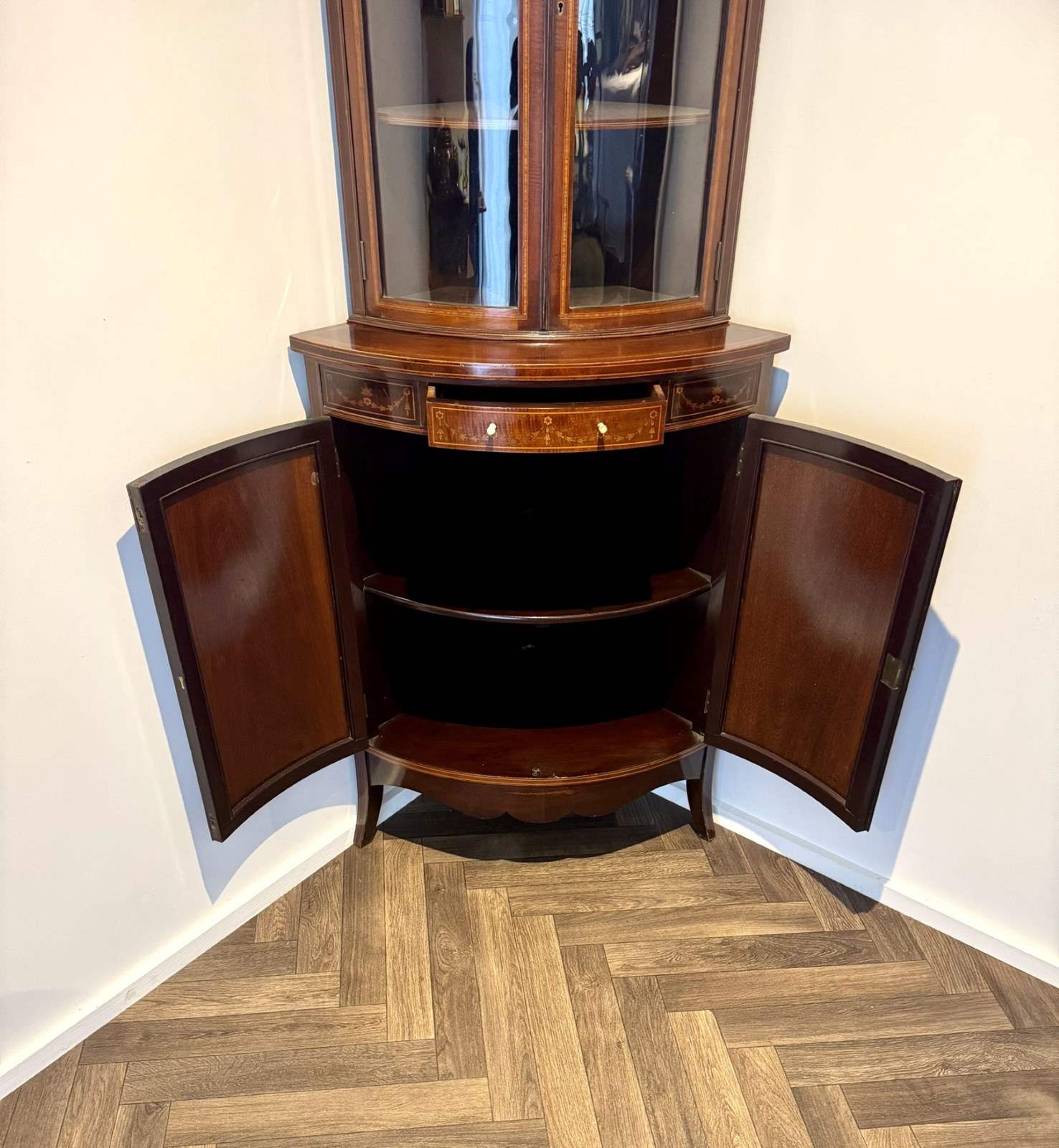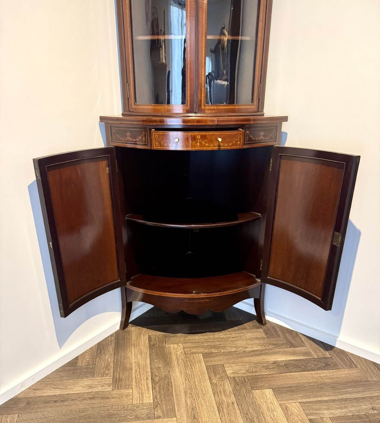 Superb Quality Pair Of Antique Edwardian Mahogany Marquetry Inlaid Corner Cabine
