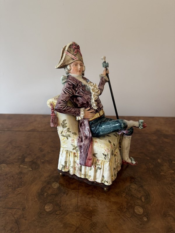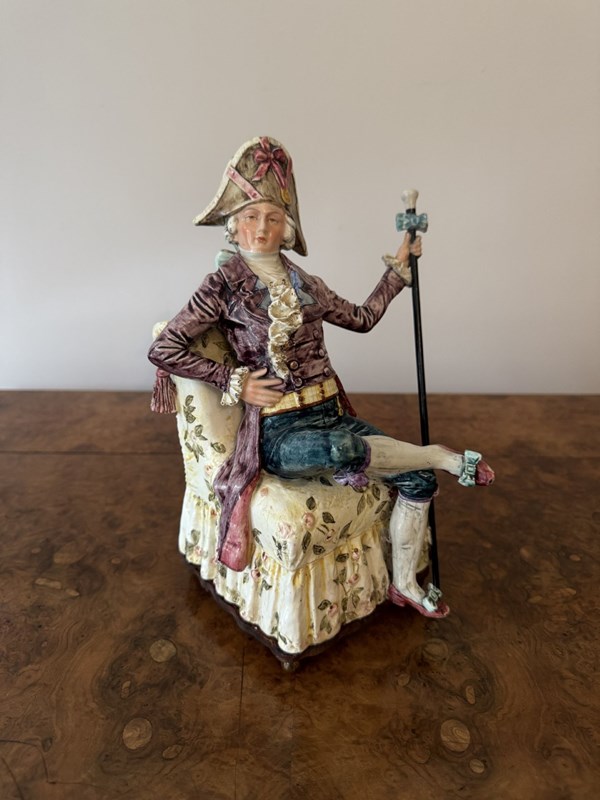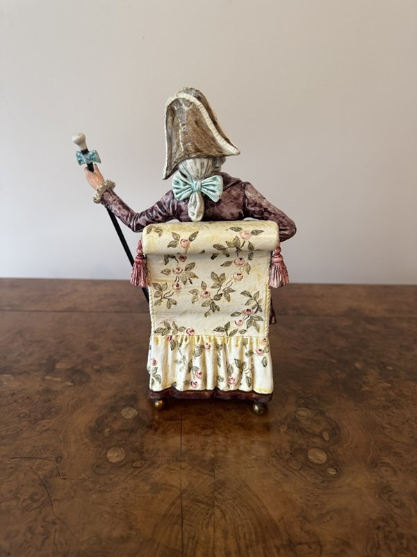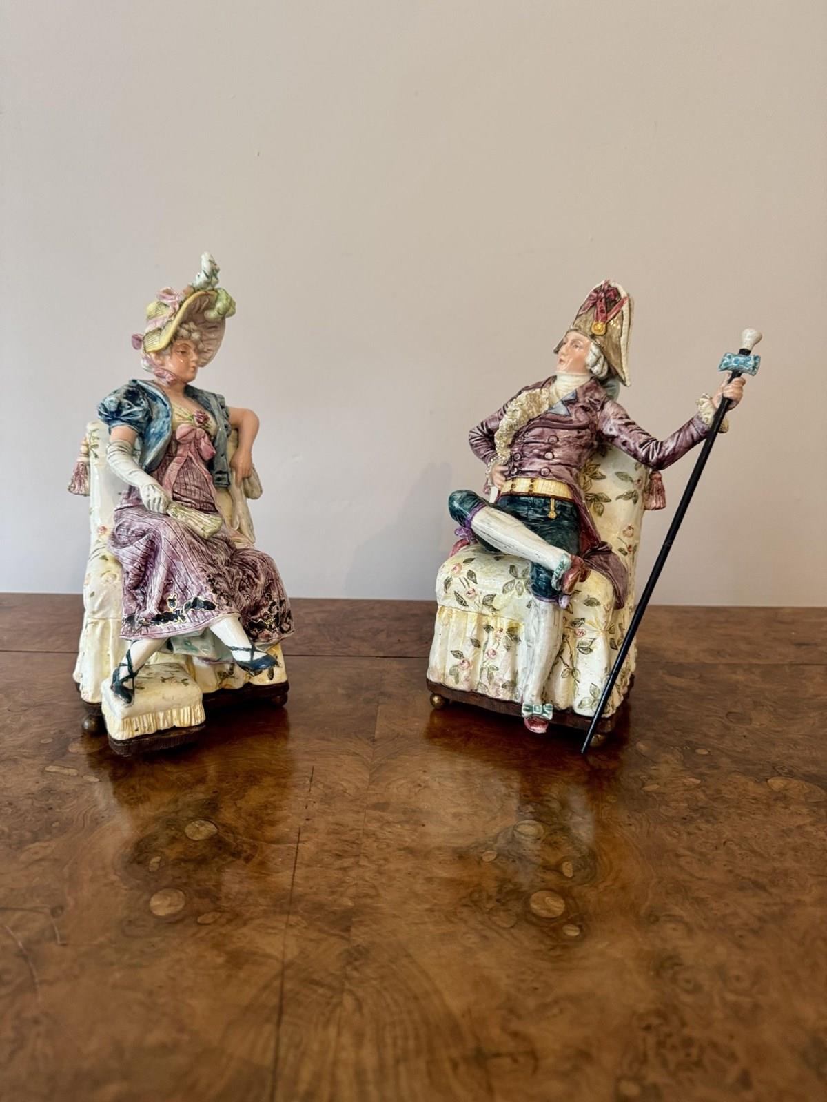 Unusual fine quality pair of antique Victorian musical figures, having a quality pair of antique Victorian musical figures one being a seated lady on a cream coloured chair with floral motifs holding a fan, dressed in a lavish purple gown with intricate folds and hand painted black flourishes, a blue bolero jacket with long white gloves wearing a ornate detailed bonnet with feathers in pretty pastel shades. The gentleman seated in a similar armchair holding a cane topped with sculptured knob, dressed in a richly textured burgundy coat, teal breeches with white stockings and red shoes, wearing a oversized bicorne hat adorned with a large pink bow and other decorative elements. Having the original music elements to the bases with a wind up mechanism with a winding key, both playing different tunes, both music boxes have been fully serviced and are in perfect working order. D. 1880