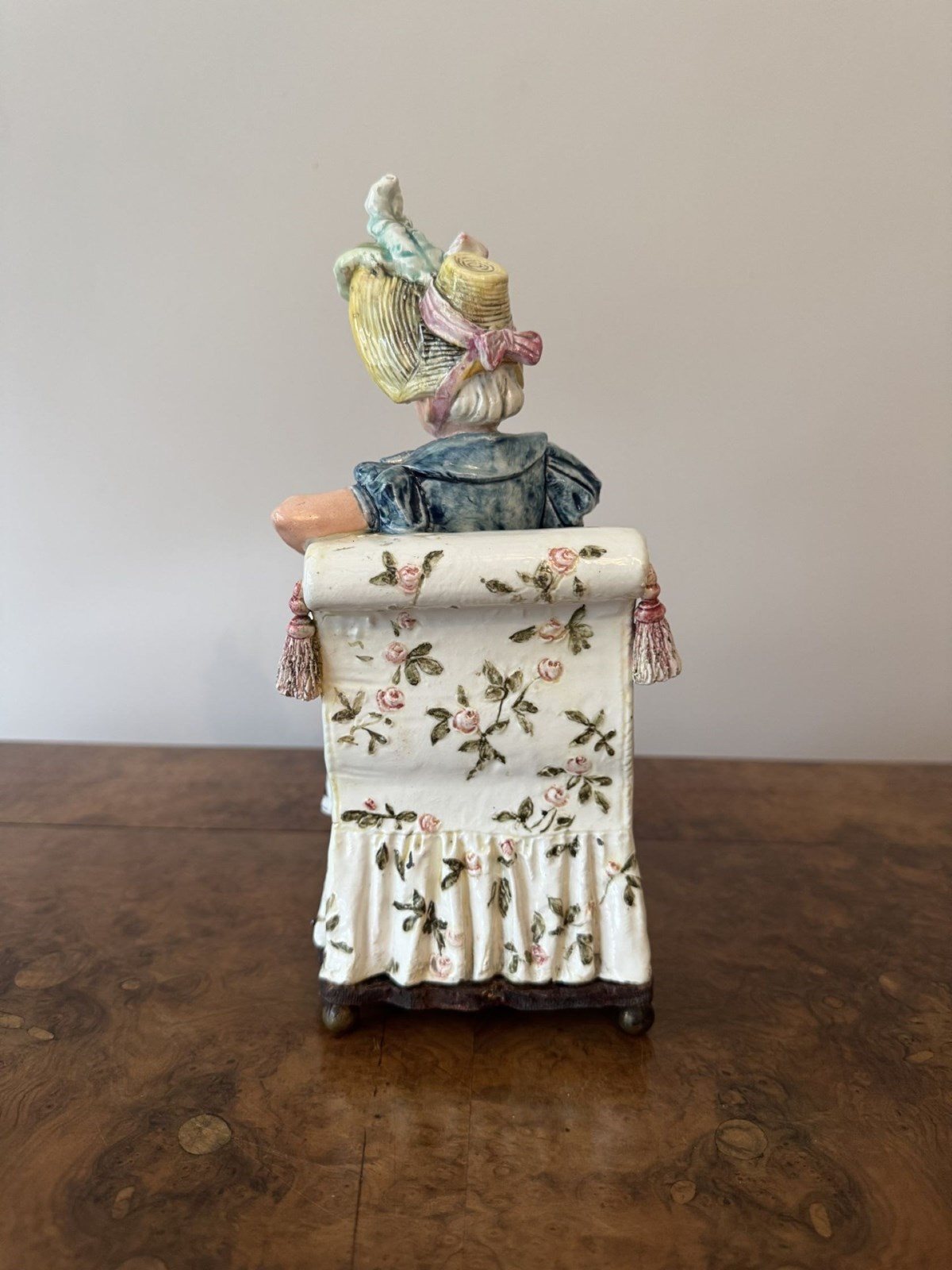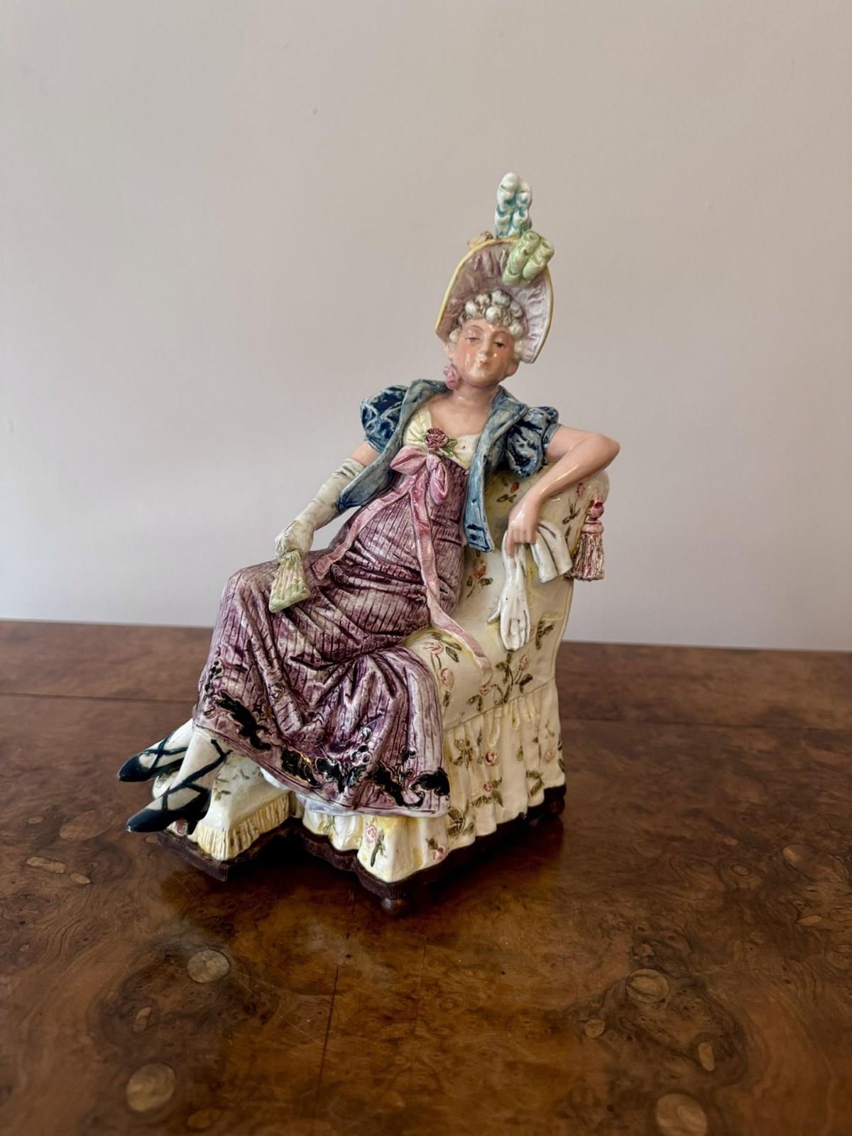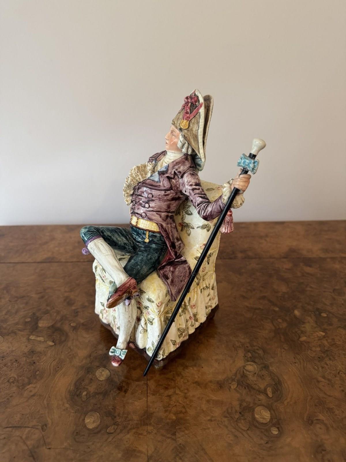 Unusual fine quality pair of antique Victorian musical figures, having a quality pair of antique Victorian musical figures one being a seated lady on a cream coloured chair with floral motifs holding a fan, dressed in a lavish purple gown with intricate folds and hand painted black flourishes, a blue bolero jacket with long white gloves wearing a ornate detailed bonnet with feathers in pretty pastel shades. The gentleman seated in a similar armchair holding a cane topped with sculptured knob, dressed in a richly textured burgundy coat, teal breeches with white stockings and red shoes, wearing a oversized bicorne hat adorned with a large pink bow and other decorative elements. Having the original music elements to the bases with a wind up mechanism with a winding key, both playing different tunes, both music boxes have been fully serviced and are in perfect working order. D. 1880