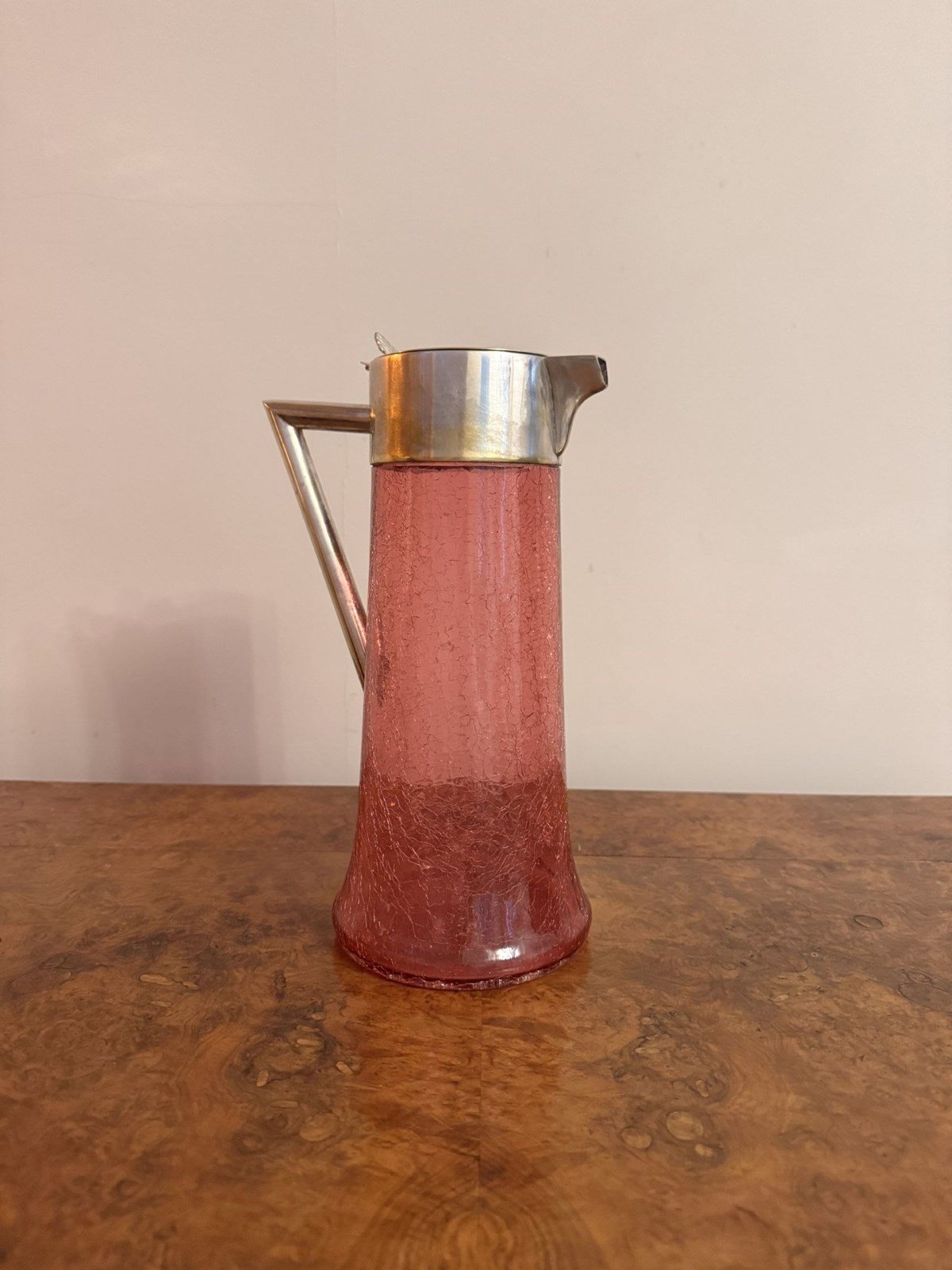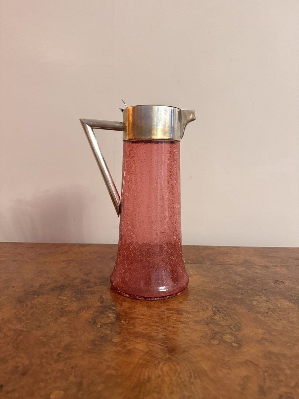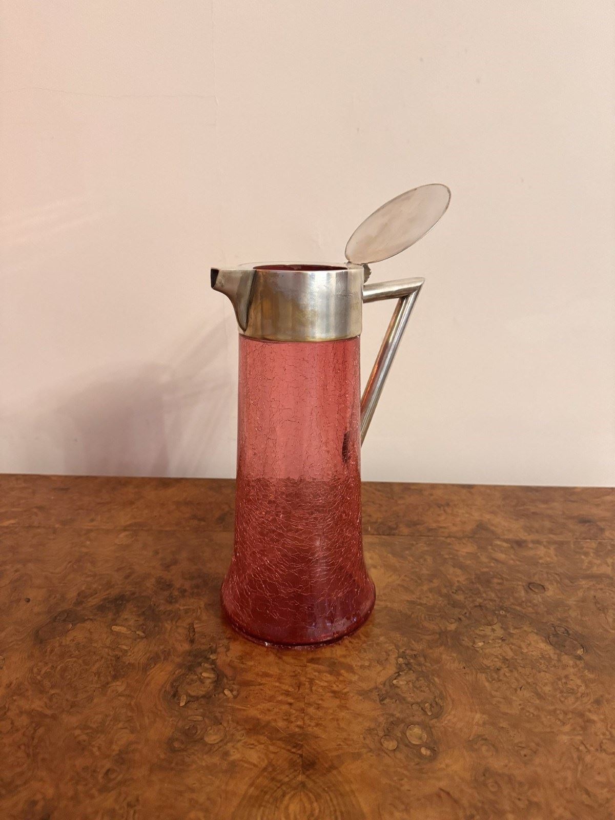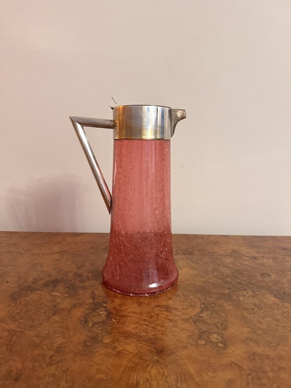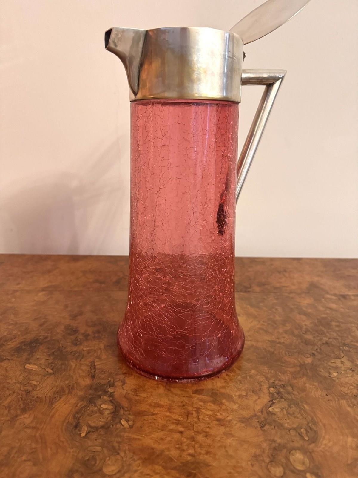 Unusual large antique Edwardian cranberry glass water jug, having a quality large antique Edwardian cranberry glass water jug, with a crackled glazed cranberry glass body with a shaped silver plated handle to the back, with a silver plated lid and shaped spout. D. 1900
