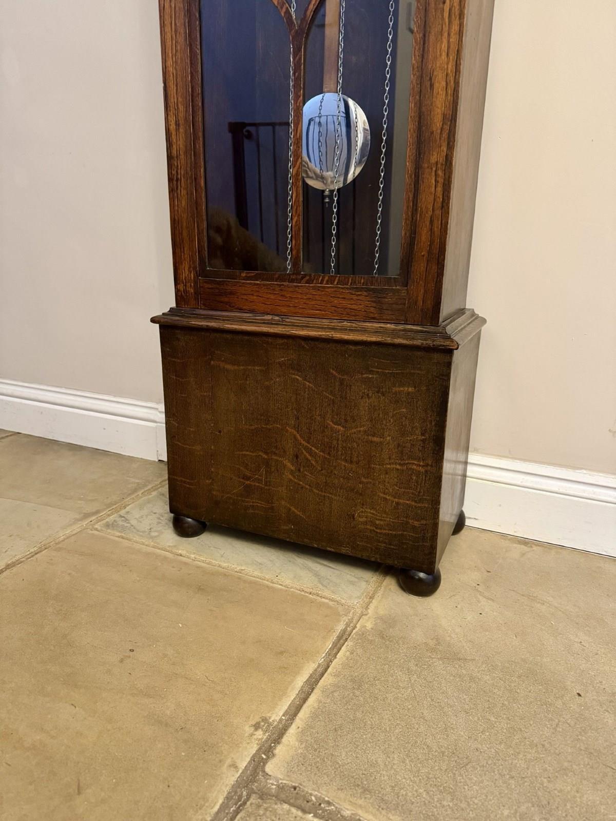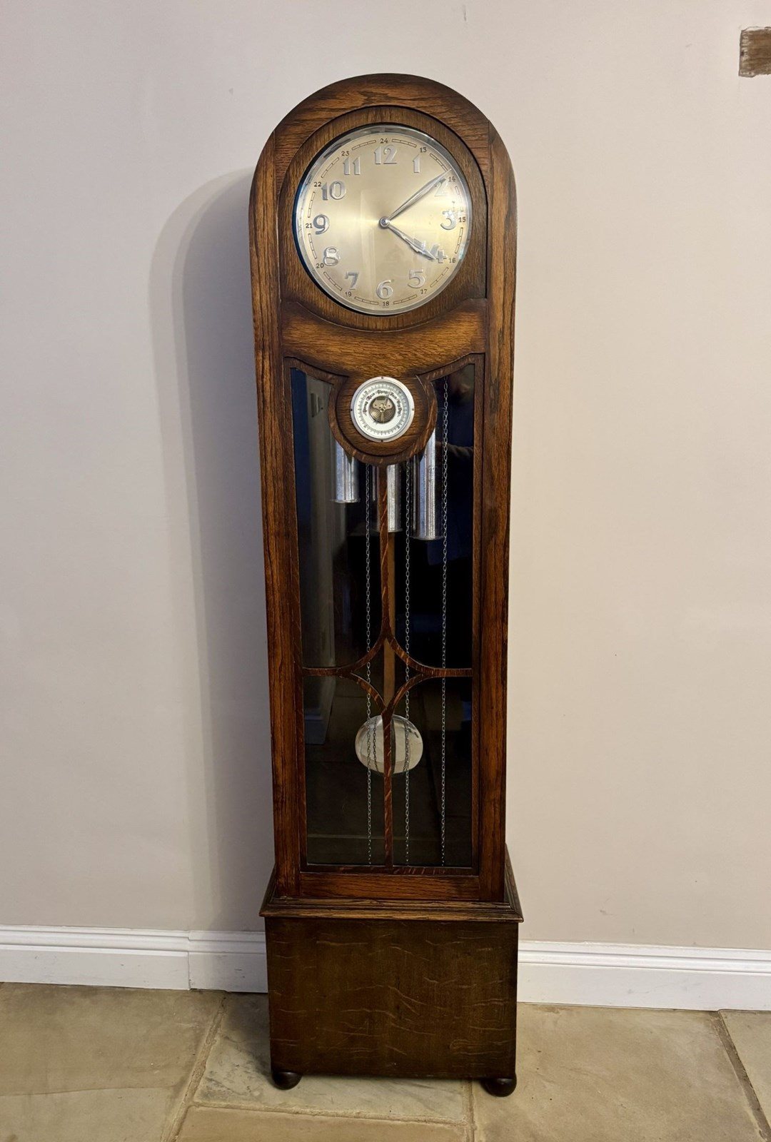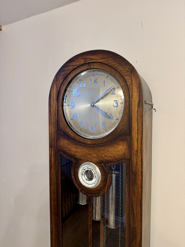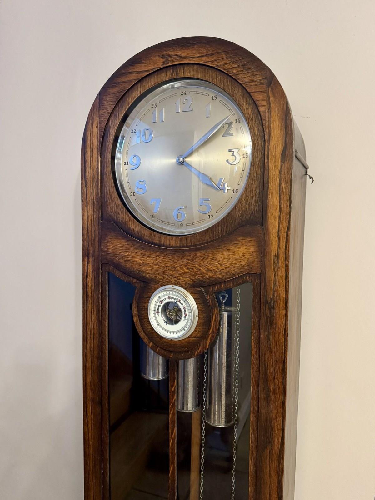 Unusual quality antique oak chiming longcase barometer clock, having a quality antique oak cased long case clock with exposed central barometer, having a arched shaped case with a large silvered dial with silver Arabic numerals and matching silver spade shaped hands with a quality eight day movement accompanied by a Westminster chime, above a unusual exposed circular barometer to the top of the single glazed door exposing three silver weights and the original silver drop down pendulum, with a bracket shaped base raised on four bun feet. Perfect condition with the original winding key. All clocks get serviced prior to delivery. D. 1920