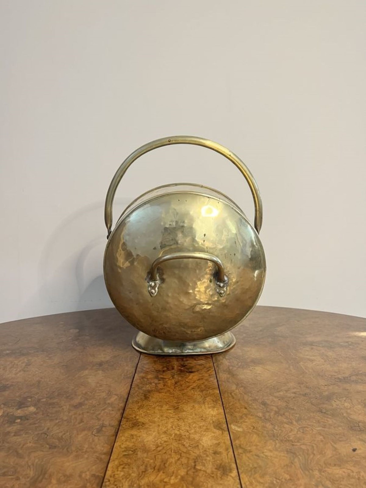 Brass coal scuttle and shovel with a swing handle to the top, a carrying handle to the back raised on a circular base.