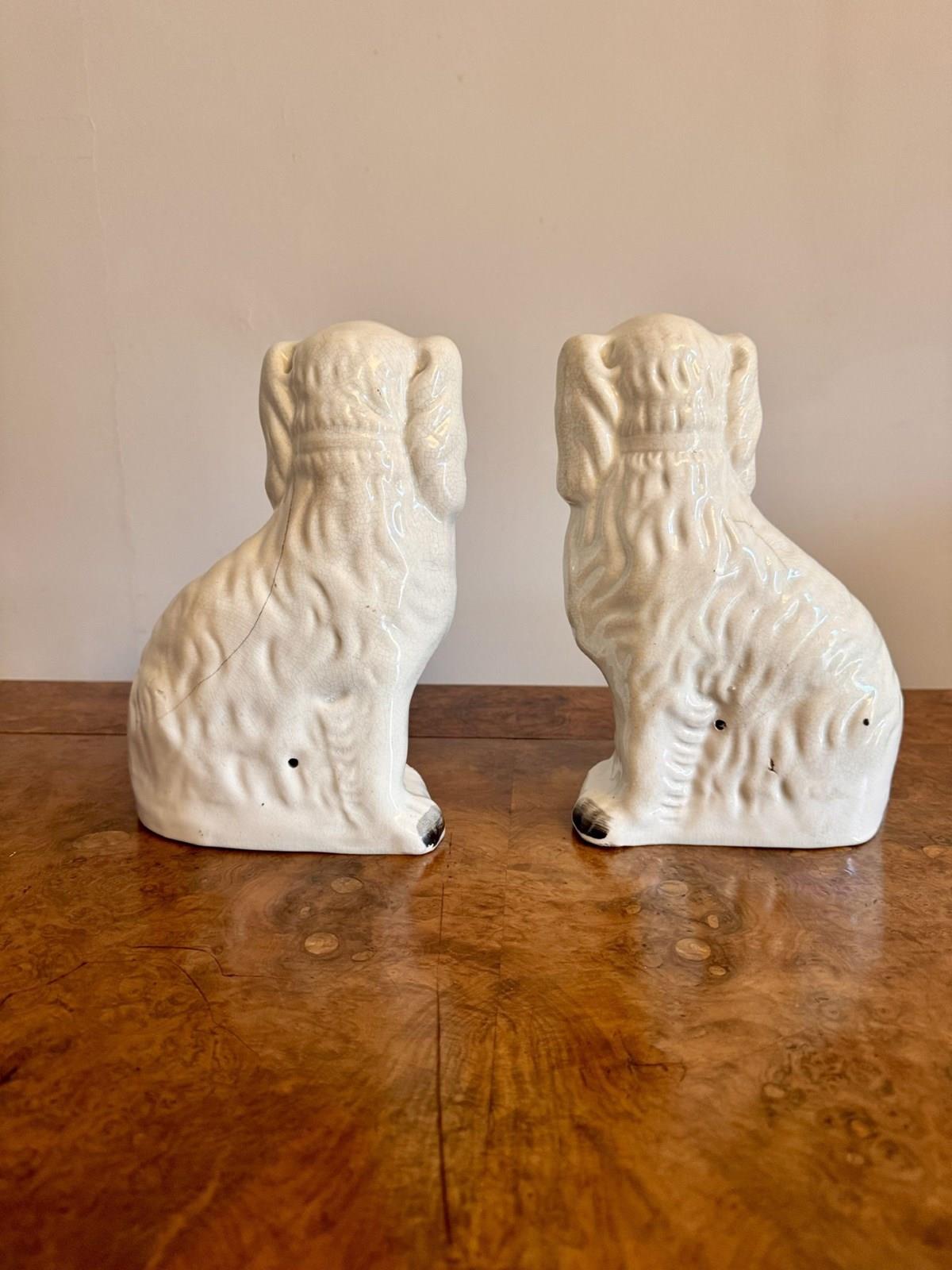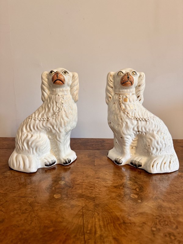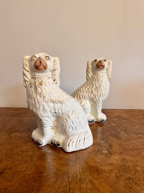 Wonderful pair of antique Victorian Staffordshire dogs, having a pair of seated spaniels in white and gold coloured coats with matching gold collars and padlocks. D. 1880