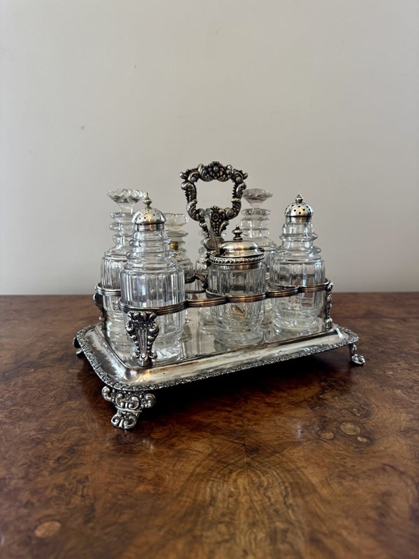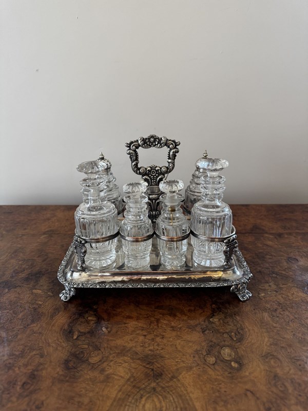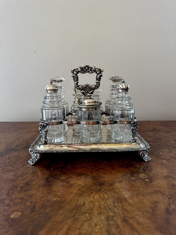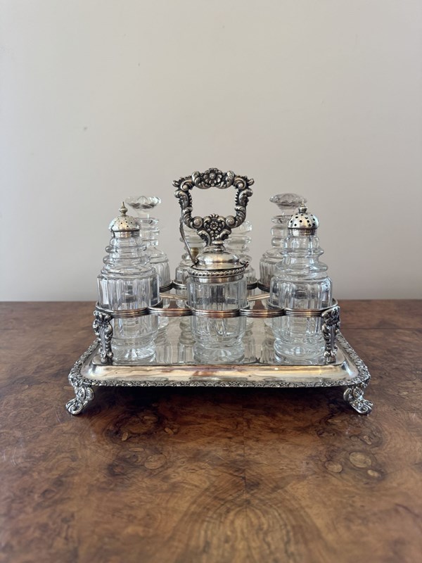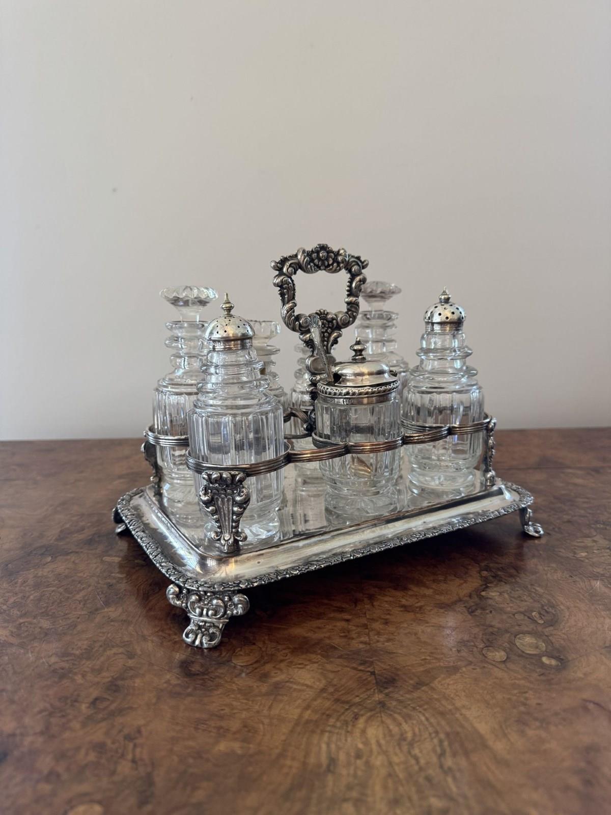 Wonderful quality antique Georgian seven bottle cruet set, having a quality antique Georgian cruet set, with a silver plated ornate stand with a shaped carrying handle to the centre above seven holders, raised on four shaped feet, Housing seven cut glass bottles four with the original glass stoppers, three with Georgian hallmarked silver tops. D. 1800