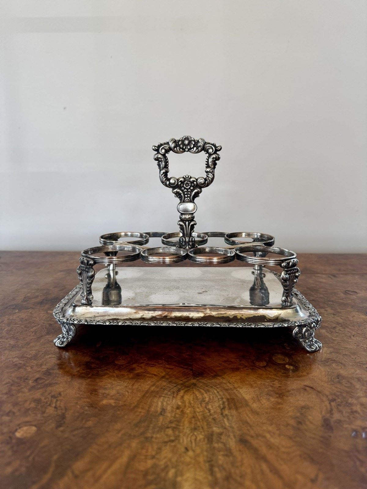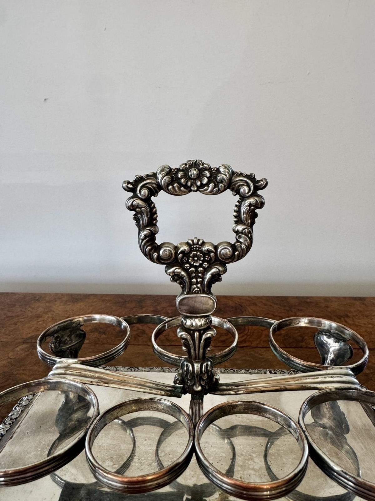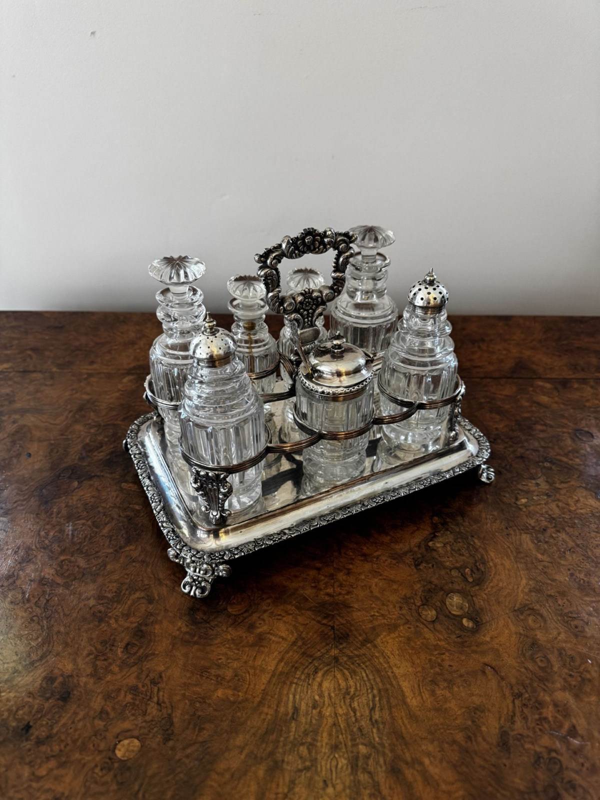 Wonderful quality antique Georgian seven bottle cruet set, having a quality antique Georgian cruet set, with a silver plated ornate stand with a shaped carrying handle to the centre above seven holders, raised on four shaped feet, Housing seven cut glass bottles four with the original glass stoppers, three with Georgian hallmarked silver tops. D. 1800
