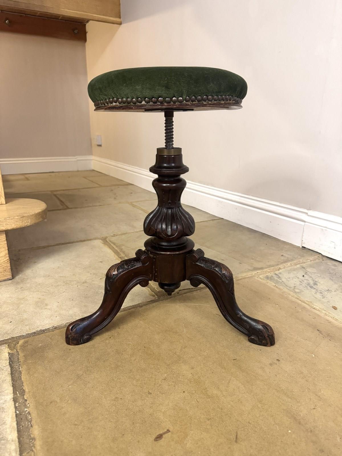 Wonderful quality antique Victorian carved walnut revolving stool, having a quality antique Victorian revolving stool with a circular shaped top turned above a carved walnut column with three downswept legs terminating into pad feet. D. 1880