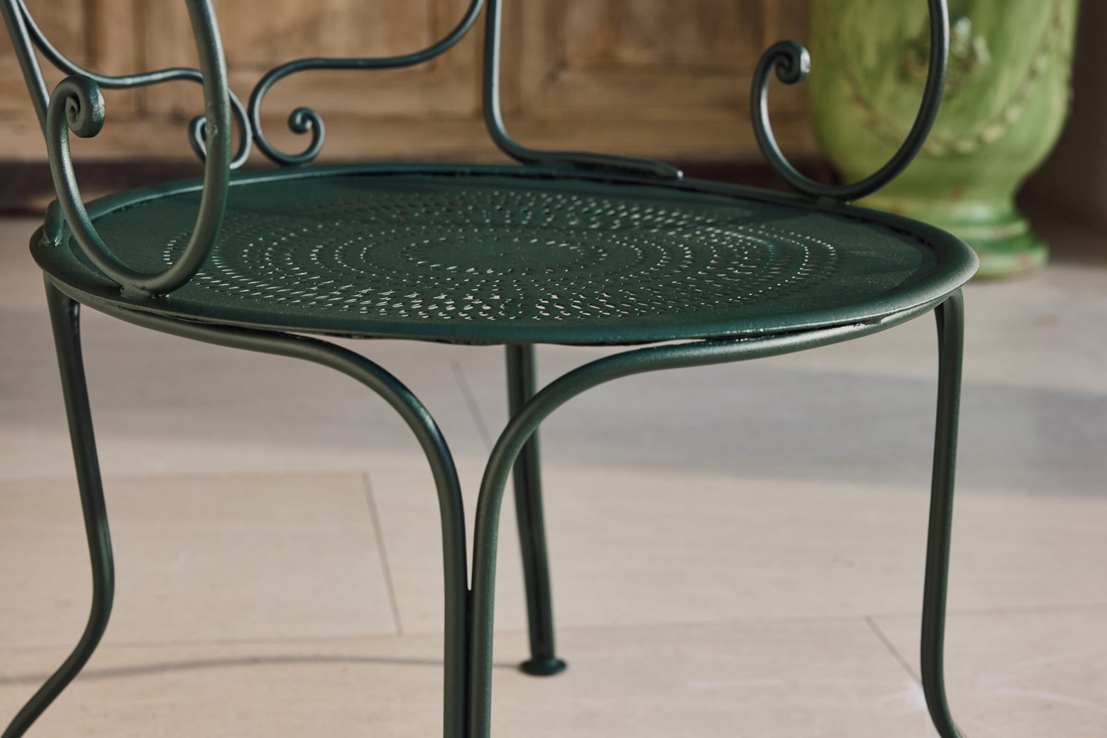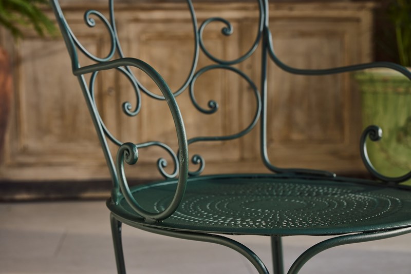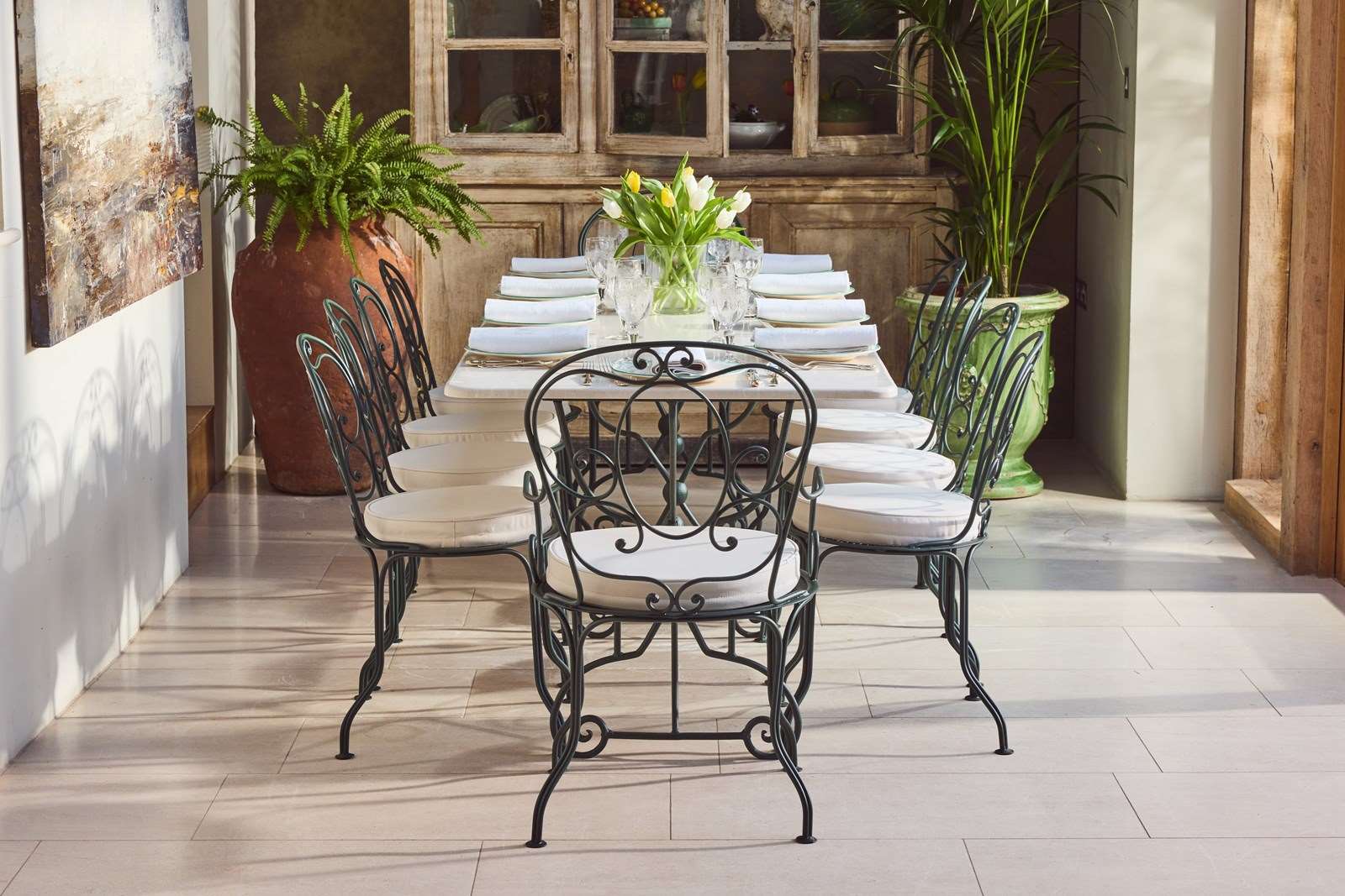 The table comes with eight chairs and two armchairs, all supplied with seat cushions, creating an elegant and generous outdoor dining set. The entire set has been powder coated in a classic dark green finish to protect it from weathering while preserving the intricate ironwork.