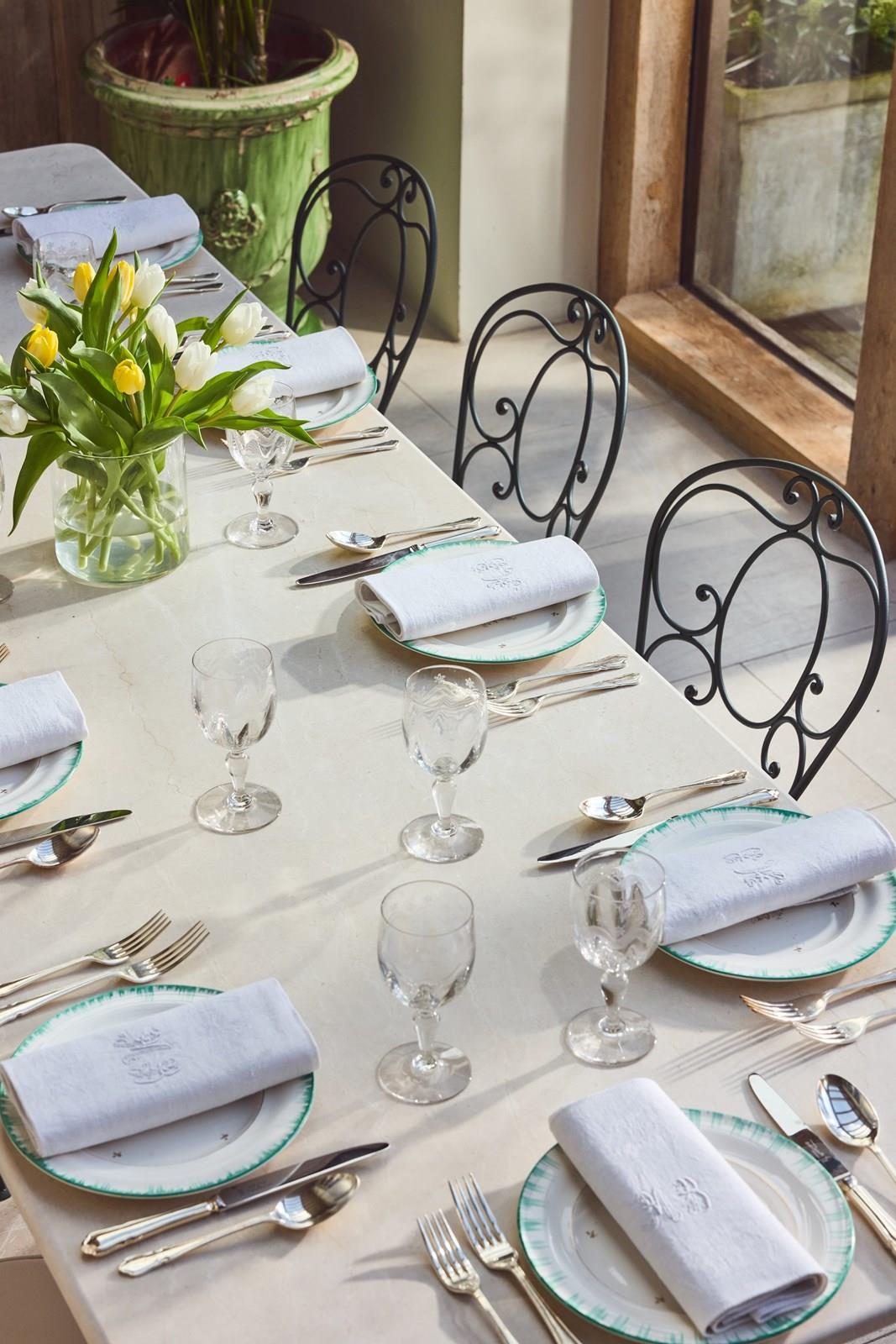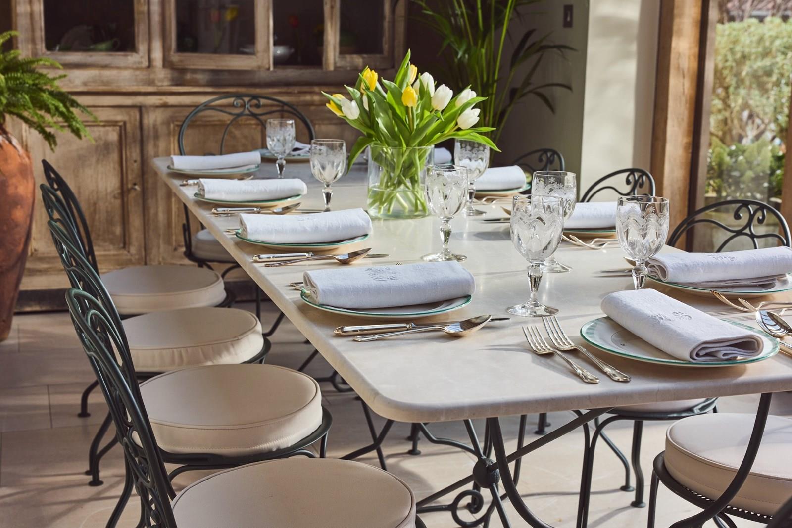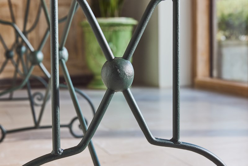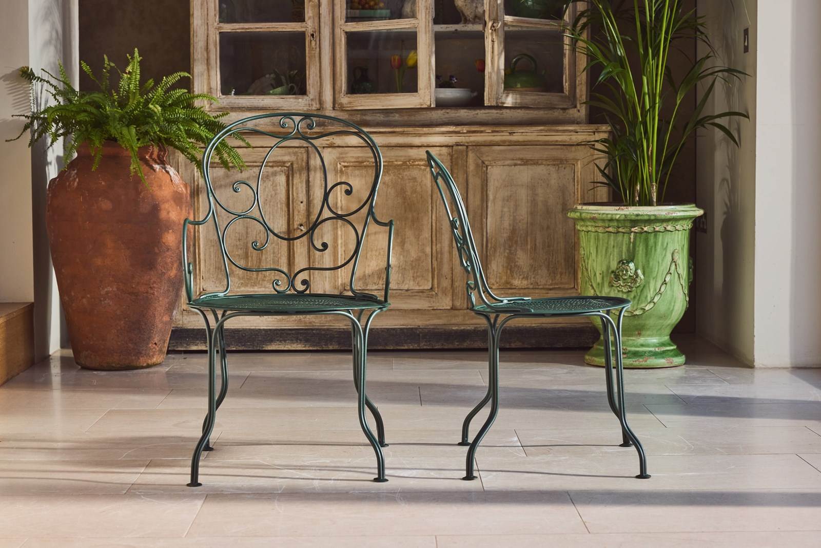 The table comes with eight chairs and two armchairs, all supplied with seat cushions, creating an elegant and generous outdoor dining set. The entire set has been powder coated in a classic dark green finish to protect it from weathering while preserving the intricate ironwork.