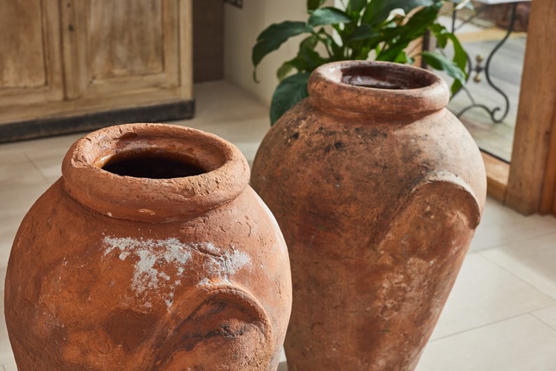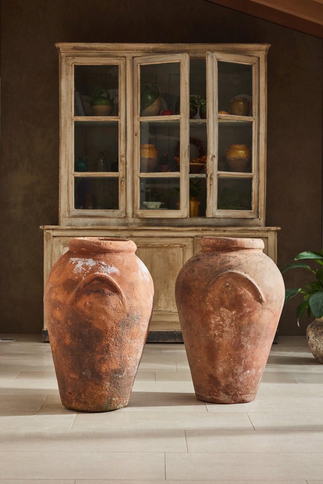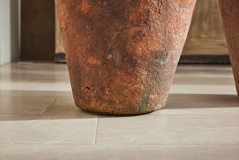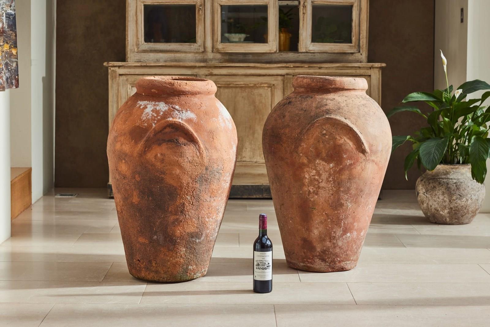A handsome pair of tall Florentine terracotta urns, attributed to Montelupo and dating from the 19th century. Montelupo Fiorentino remains one of Italy’s most important centres of pottery production, known for the quality of its clay and craftsmanship.