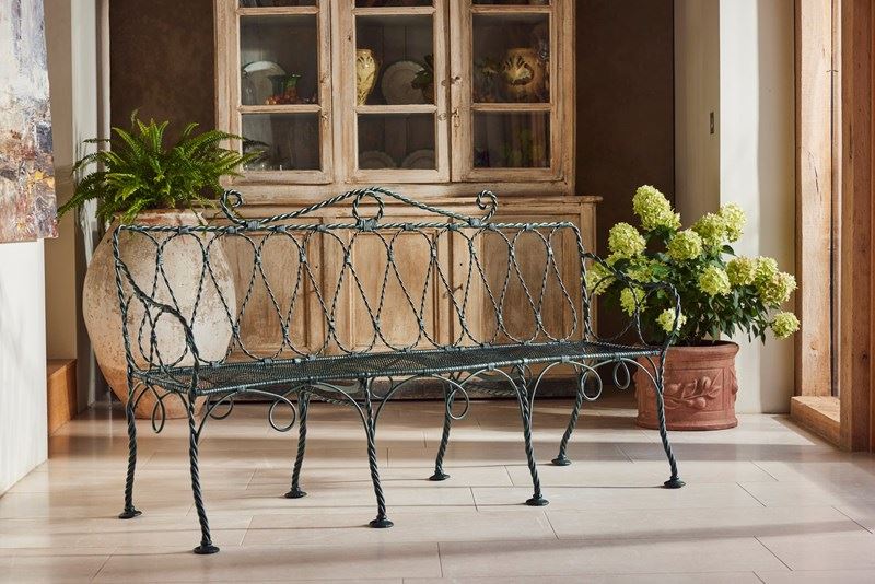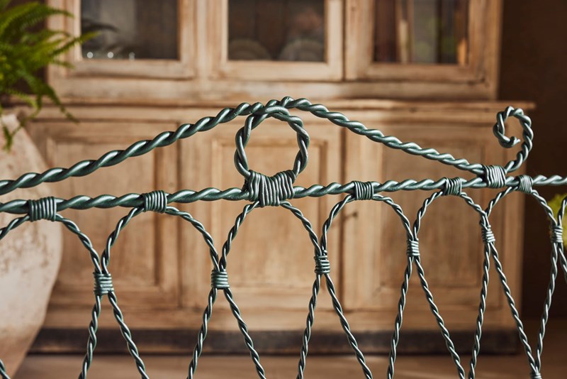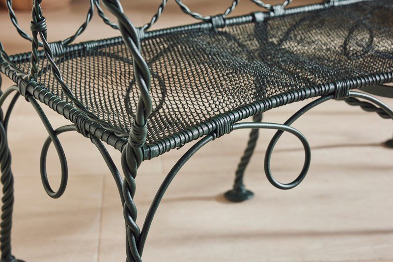 A very rare 19th century French bench, artisan-made and beautifully hand-forged with twisted metal details resembling rope. It features mesh seats, rope-like arms, and lead feet for stability. Recently restored, it is in excellent condition and remains comfortable. Highly decorative and finely crafted, this bench is a superb example of French metalwork and would make a striking addition to any garden or interior. We have two benches available.