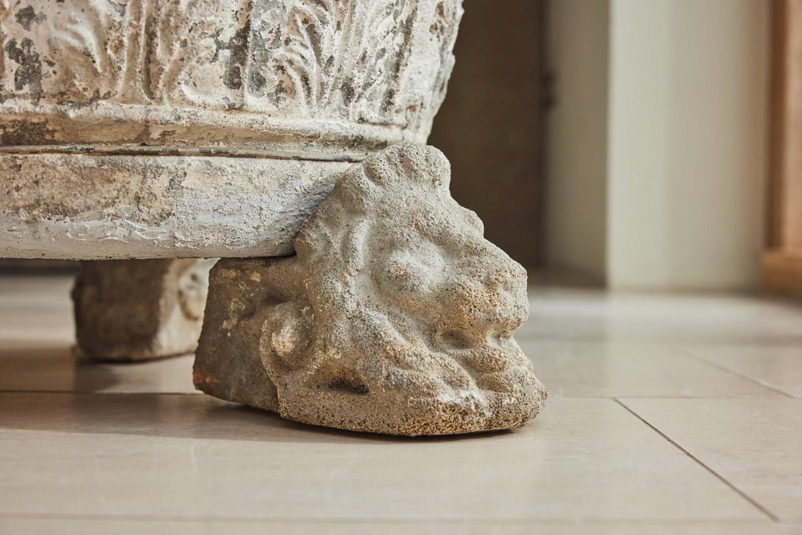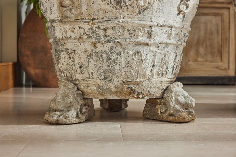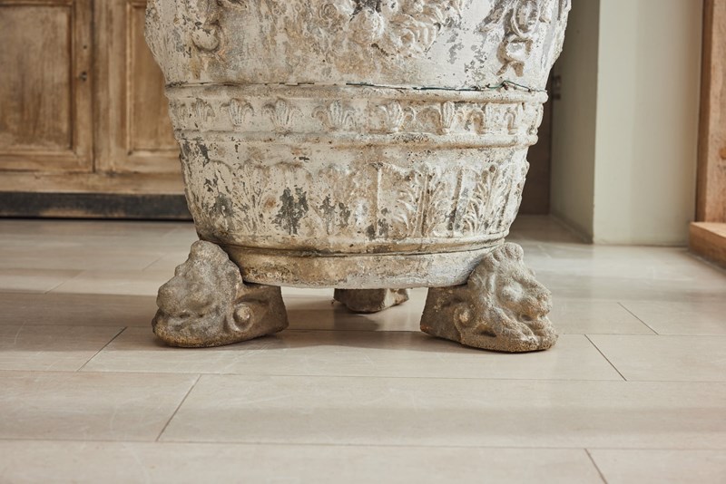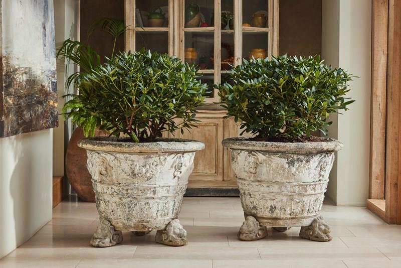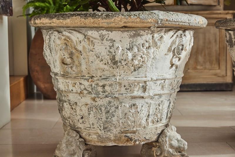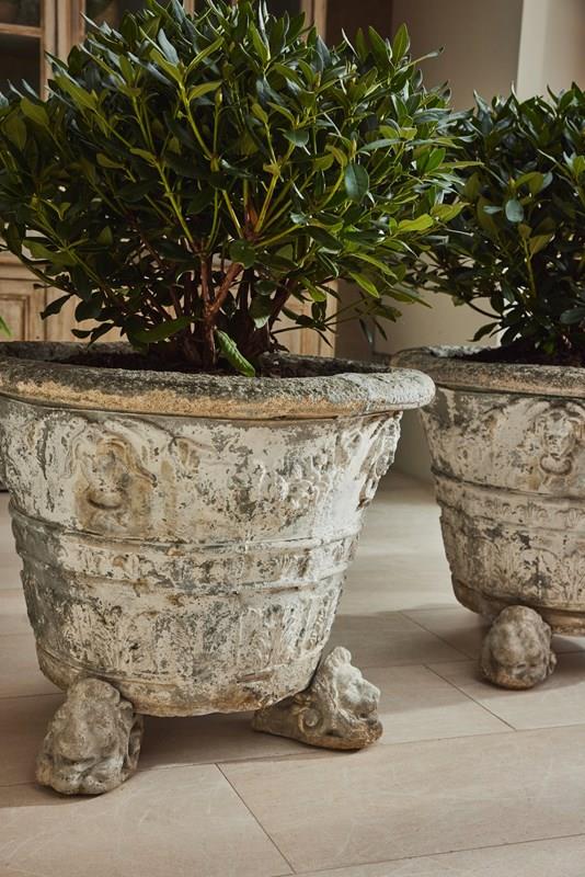 A striking and substantial pair of French cast stone planters, dating from the late 19th to early 20th century. Each planter features attractive decorative mouldings and stands on individual lion’s head feet.