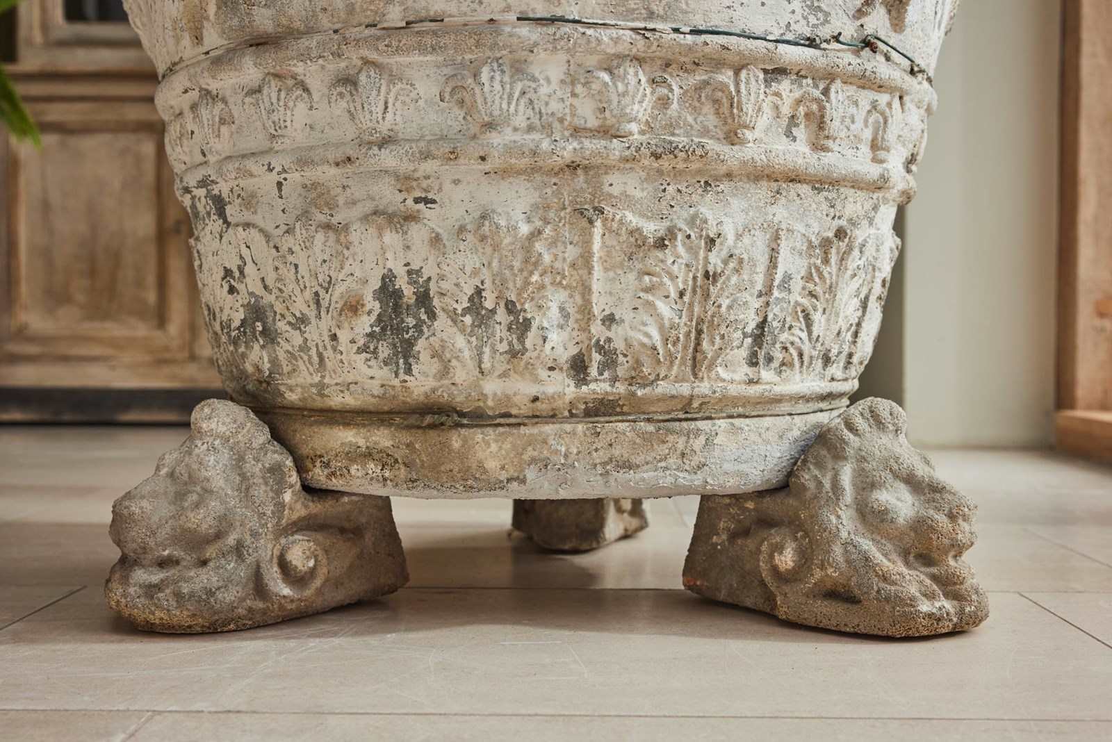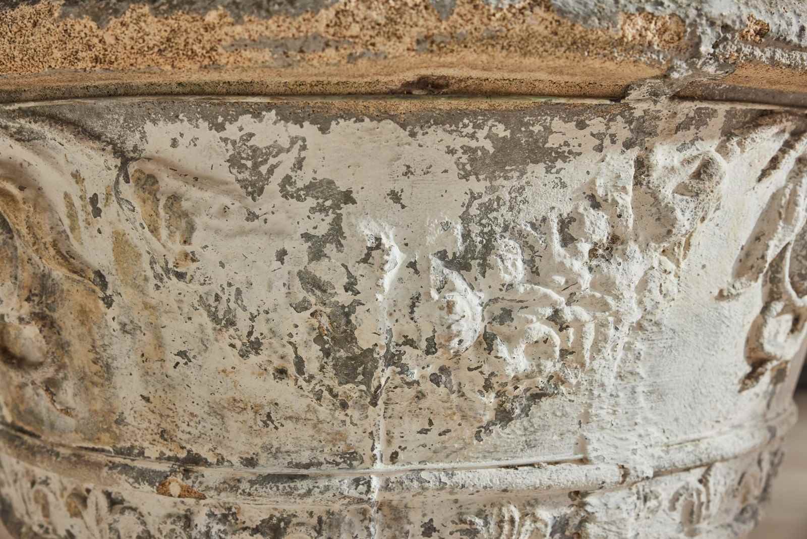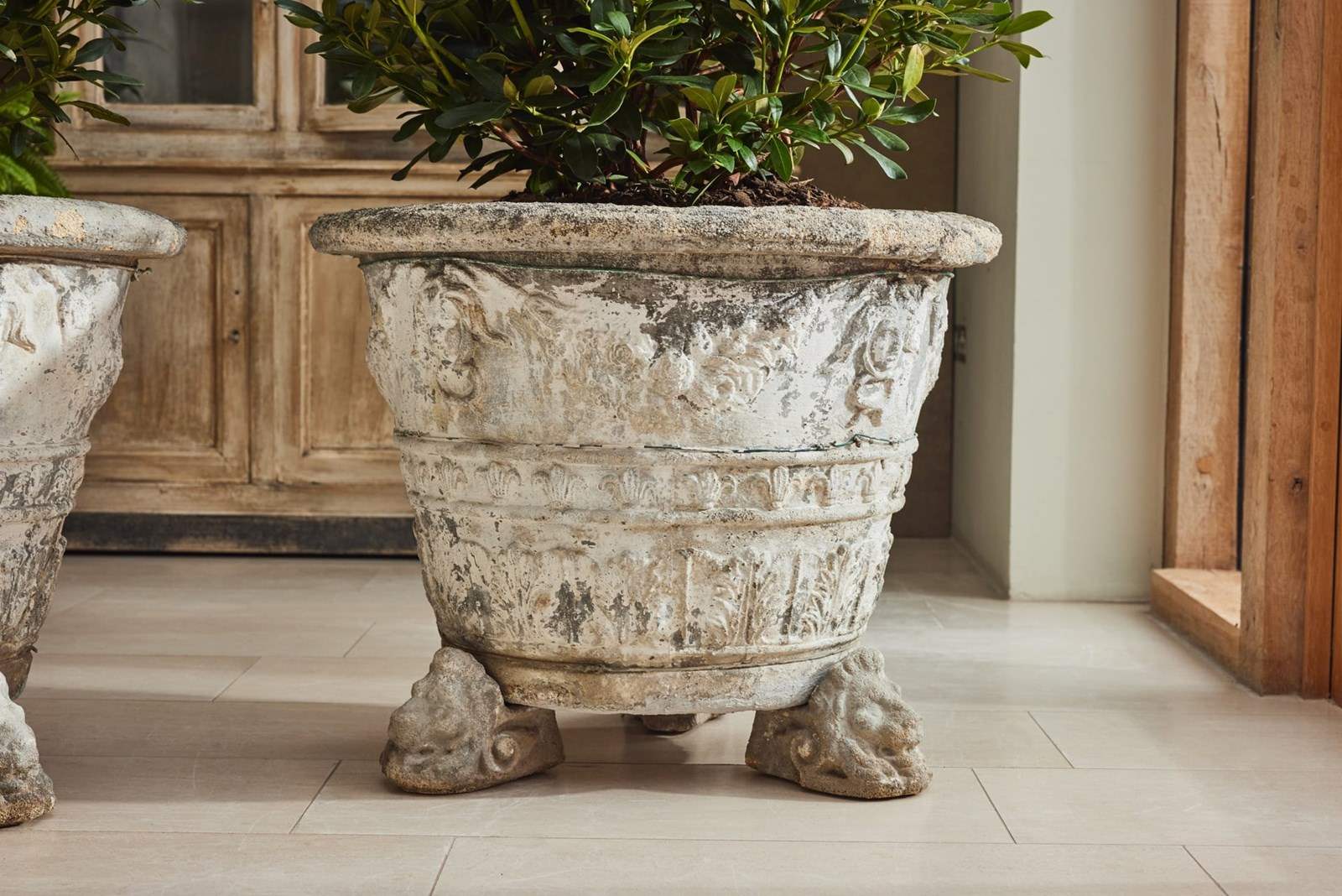A striking and substantial pair of French cast stone planters, dating from the late 19th to early 20th century. Each planter features attractive decorative mouldings and stands on individual lion’s head feet.
