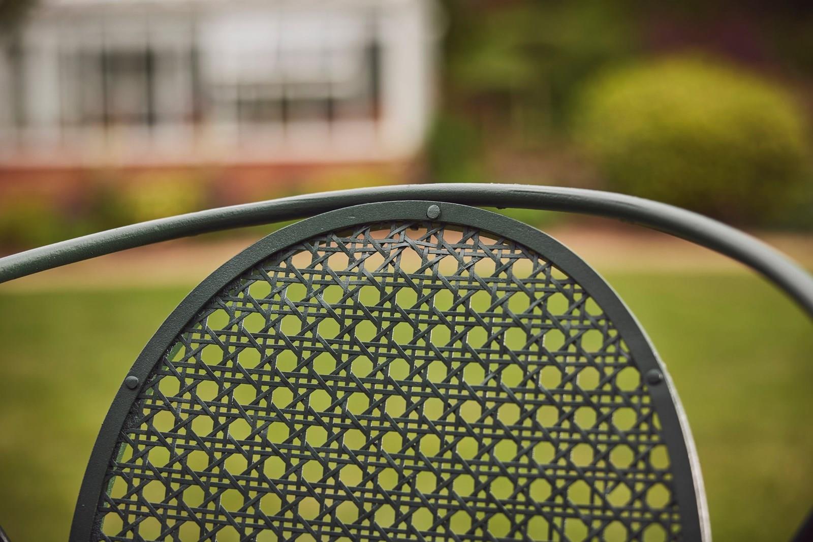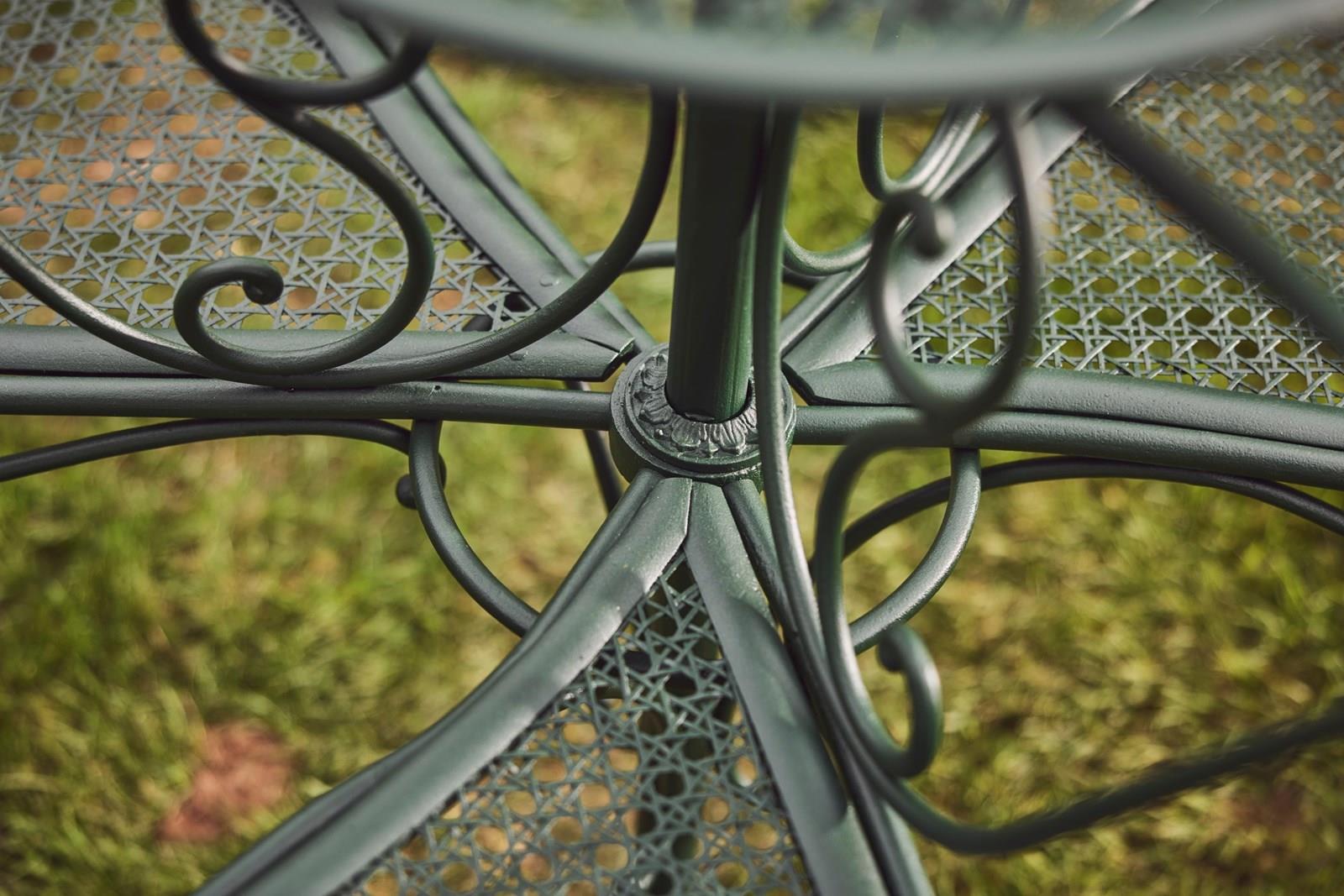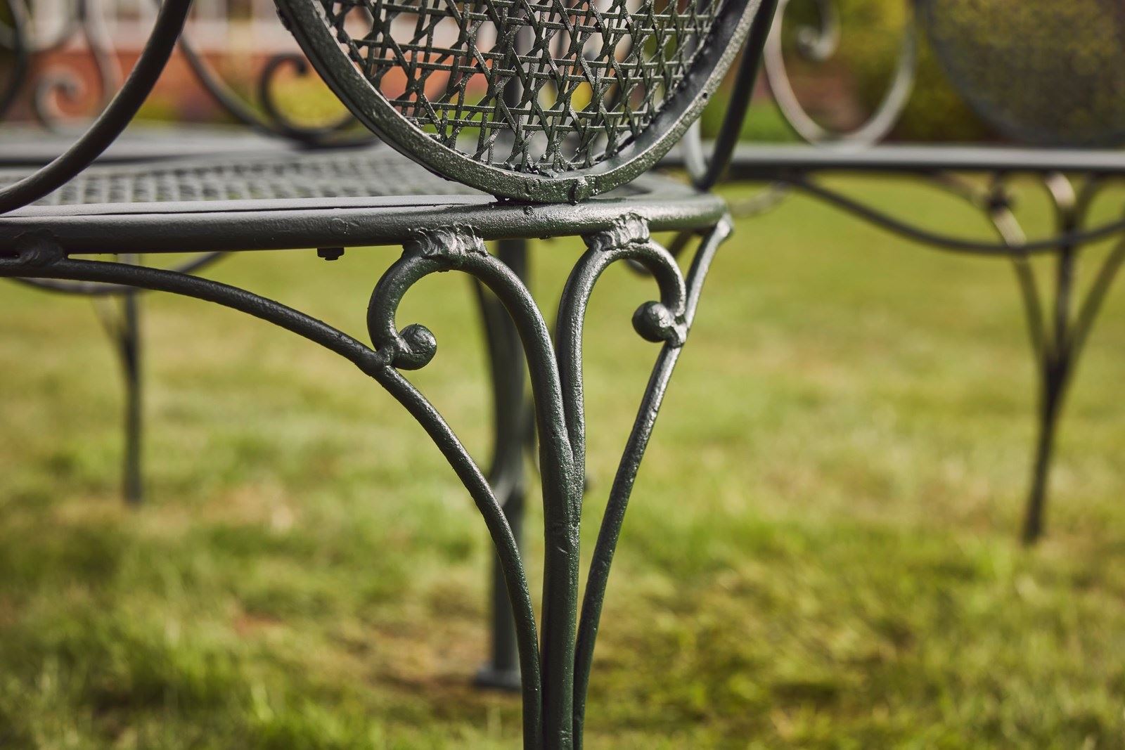 Crafted with a wrought iron frame and faux bamboo seats, it remains in very good condition considering its age. The distinctive three-seat design, arranged in a propeller-like formation, makes this both a conversation piece and a decorative focal point for any garden or orangery.