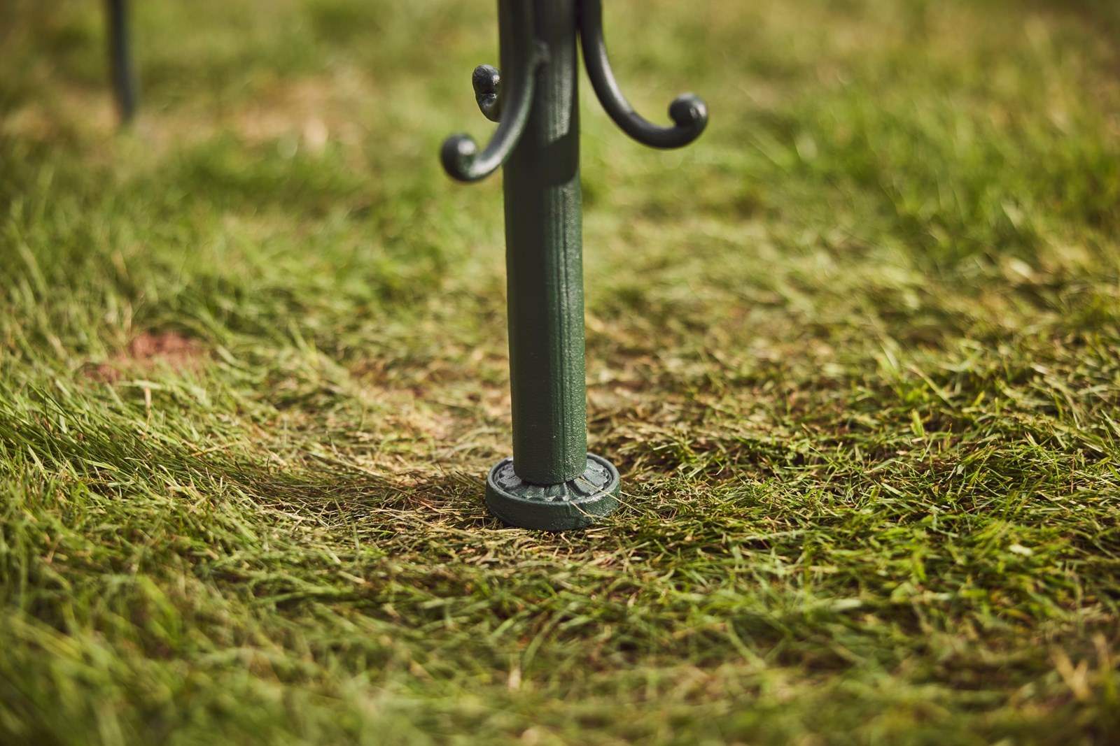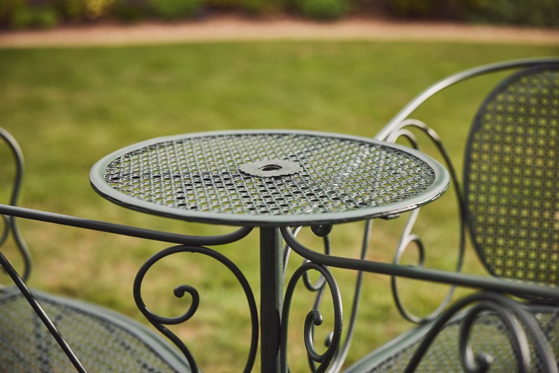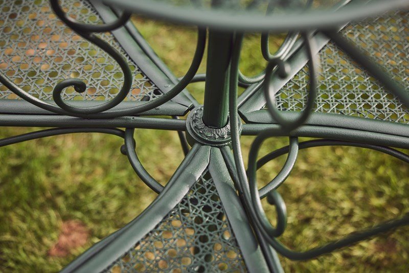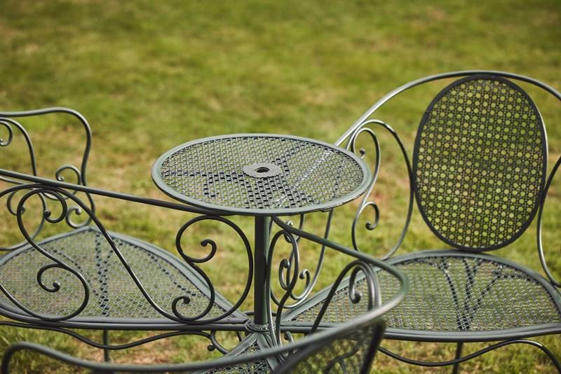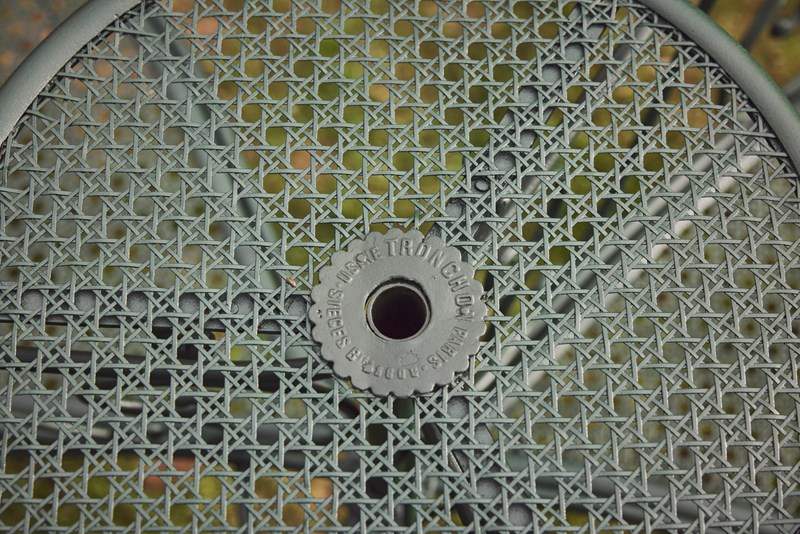 Crafted with a wrought iron frame and faux bamboo seats, it remains in very good condition considering its age. The distinctive three-seat design, arranged in a propeller-like formation, makes this both a conversation piece and a decorative focal point for any garden or orangery.