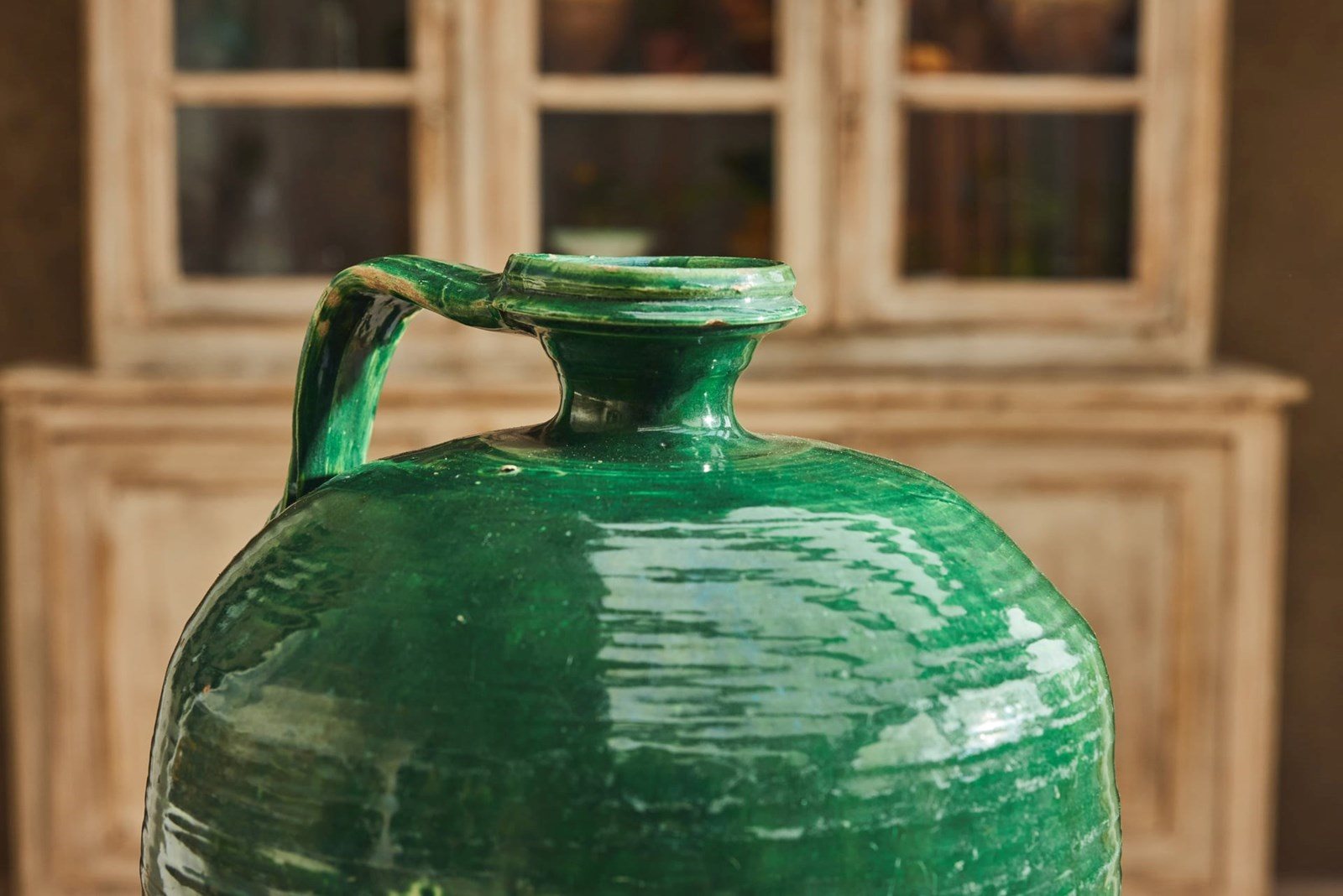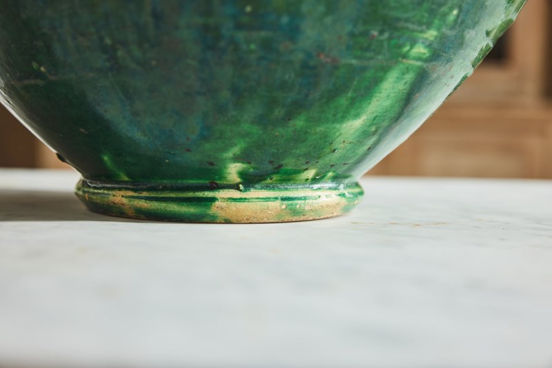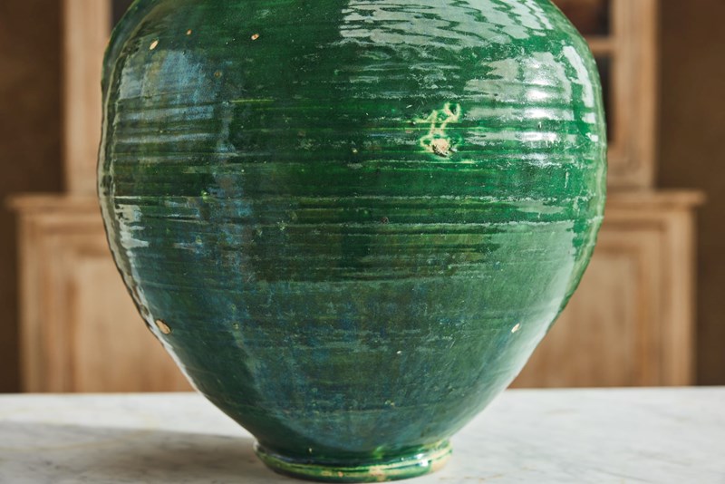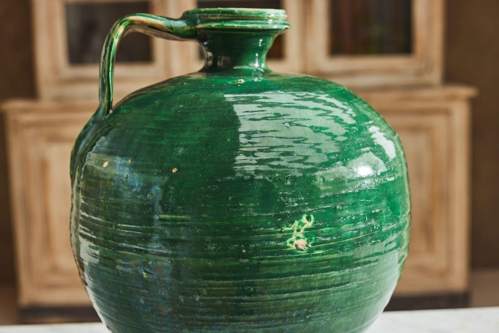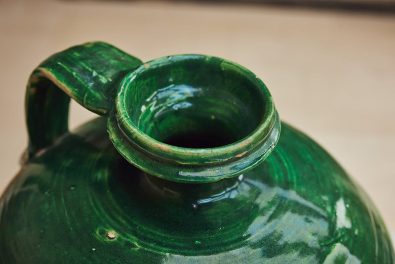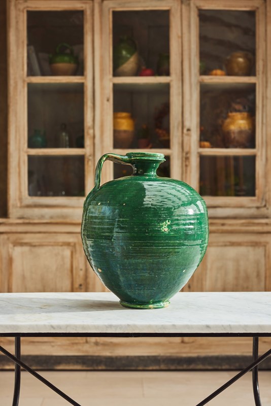 An attractive 19th-century Spanish olive oil jug, retaining its original green glaze. Formerly a utilitarian vessel, it survives in very good condition for an object of its type and age. With its simple, honest form and rich surface colour, it now works beautifully as a decorative piece within the home, adding character and warmth to shelves, consoles, or kitchen spaces.