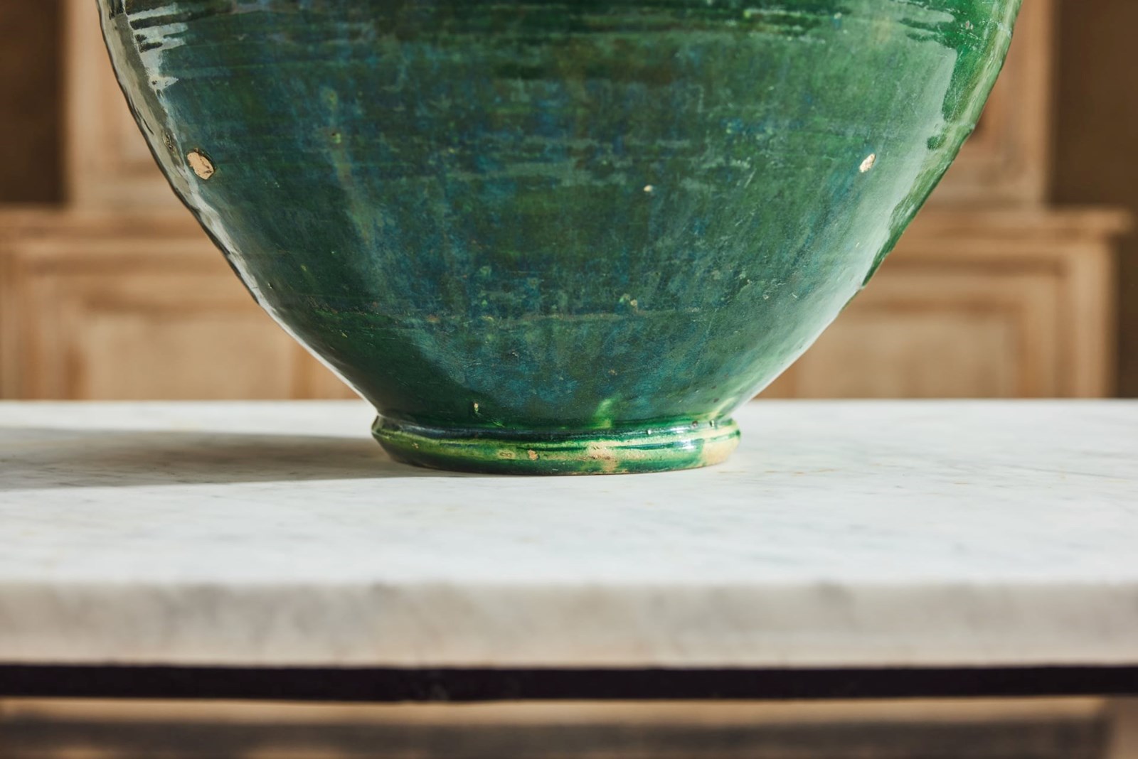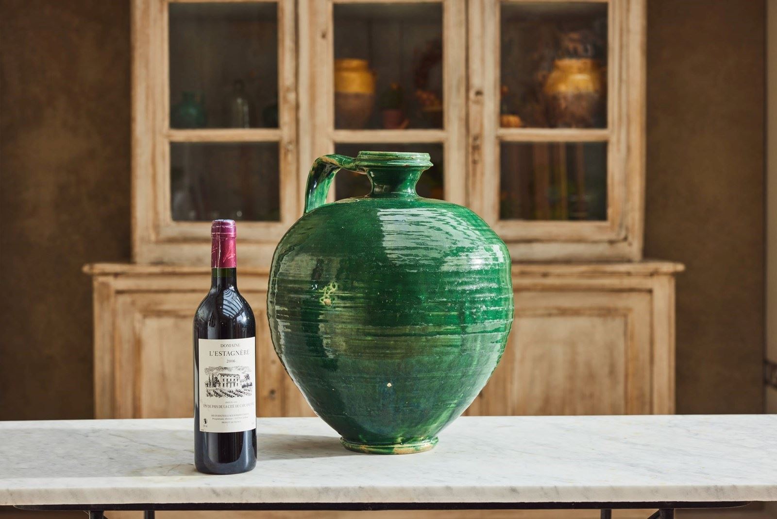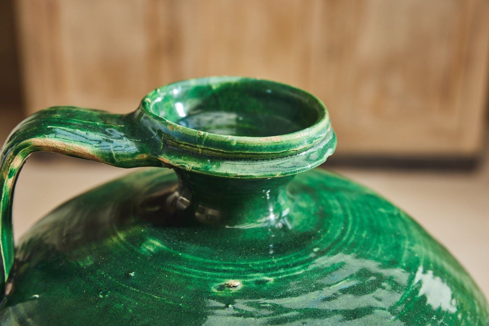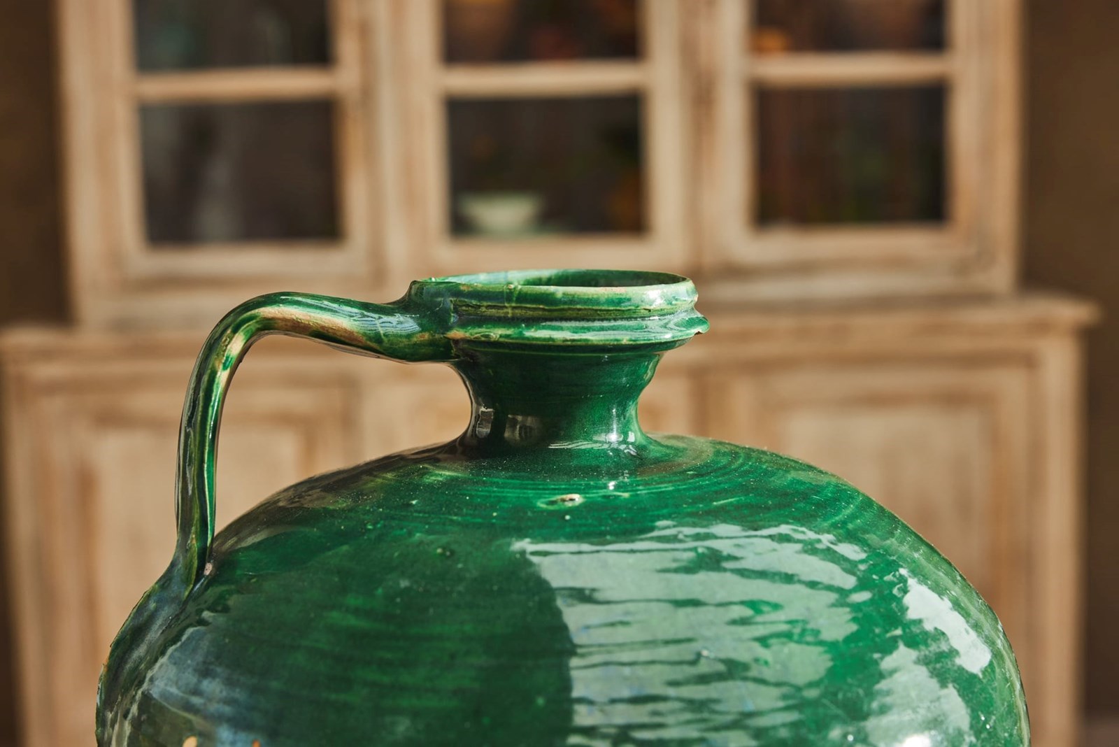 An attractive 19th-century Spanish olive oil jug, retaining its original green glaze. Formerly a utilitarian vessel, it survives in very good condition for an object of its type and age. With its simple, honest form and rich surface colour, it now works beautifully as a decorative piece within the home, adding character and warmth to shelves, consoles, or kitchen spaces.
