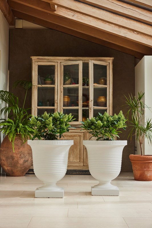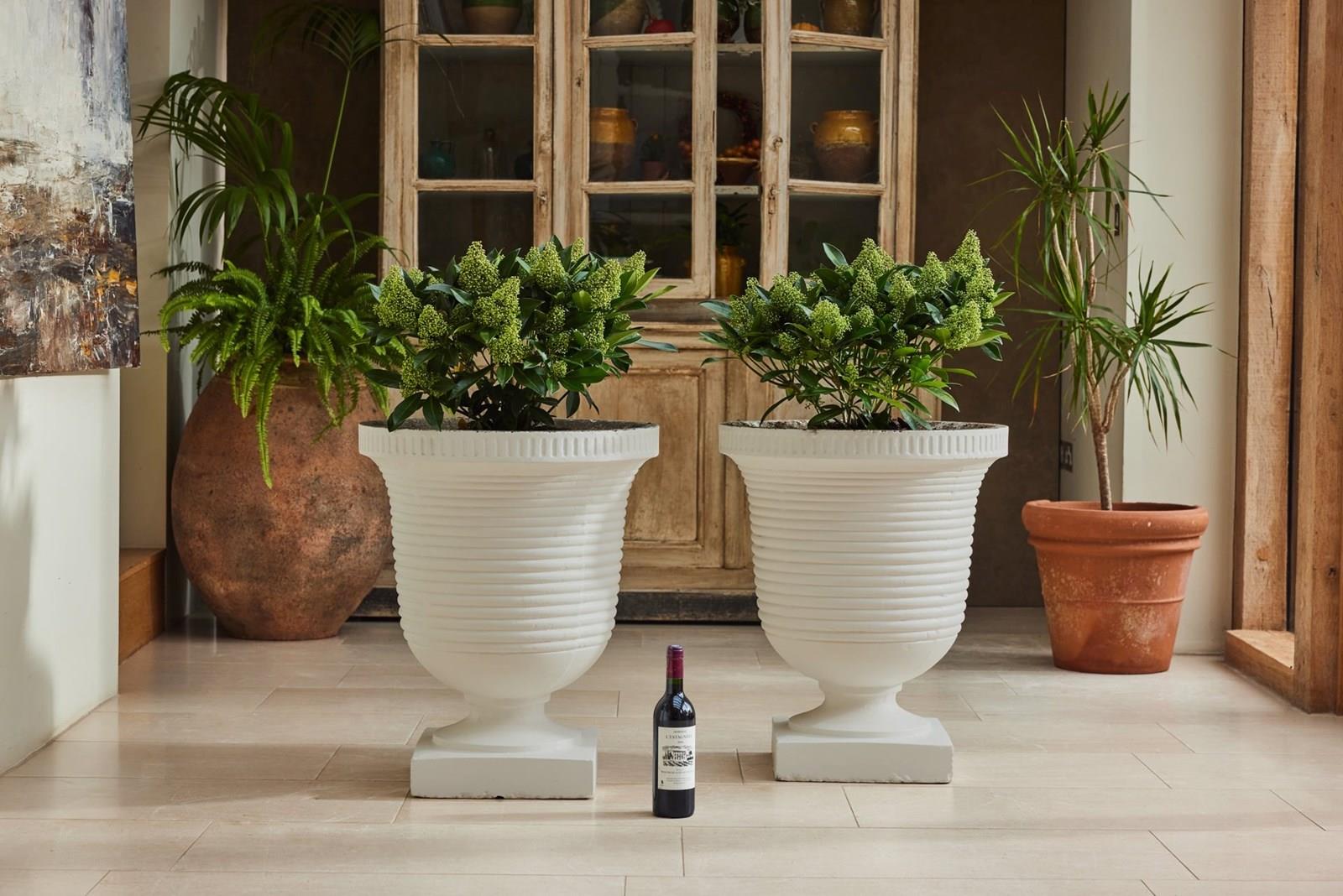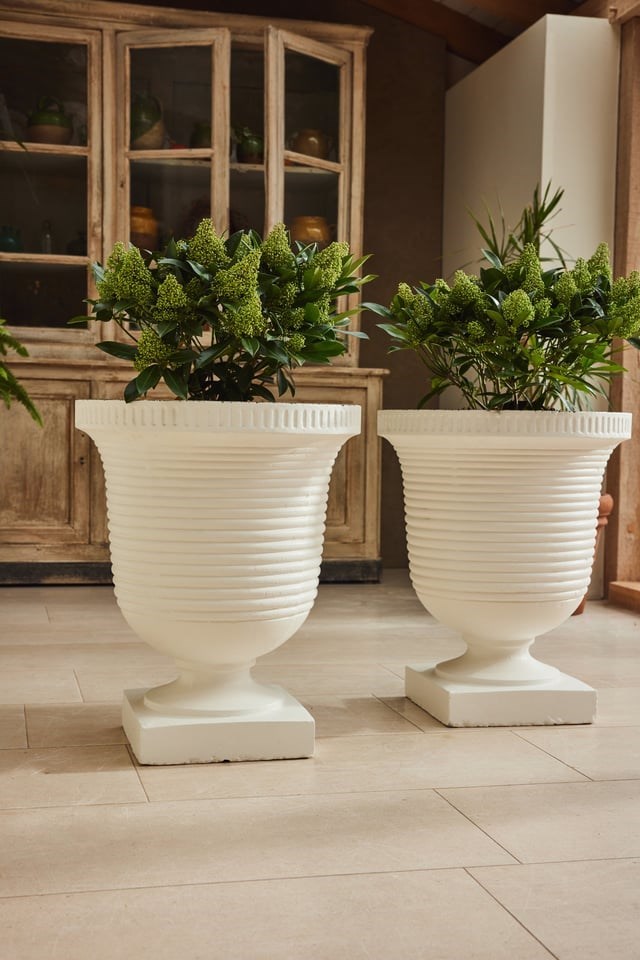 A substantial pair of statement planters dating from the 1920s, cast in concrete with a well-defined ribbed body and a decorative rim. Their proportions are generous and balanced, giving them presence without being overbearing. Each planter is deep enough to accommodate a small tree or large shrub, making them ideal for framing an entrance, pathway, or terrace.