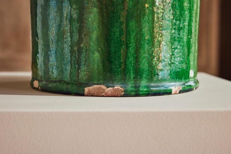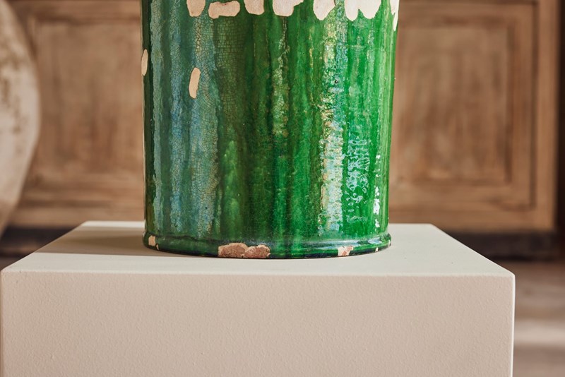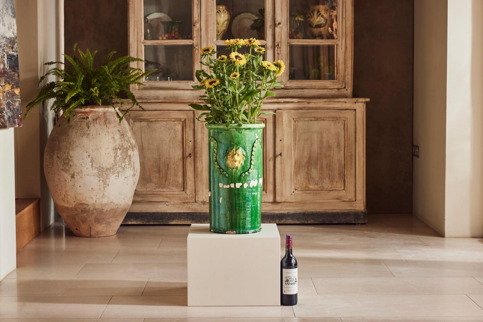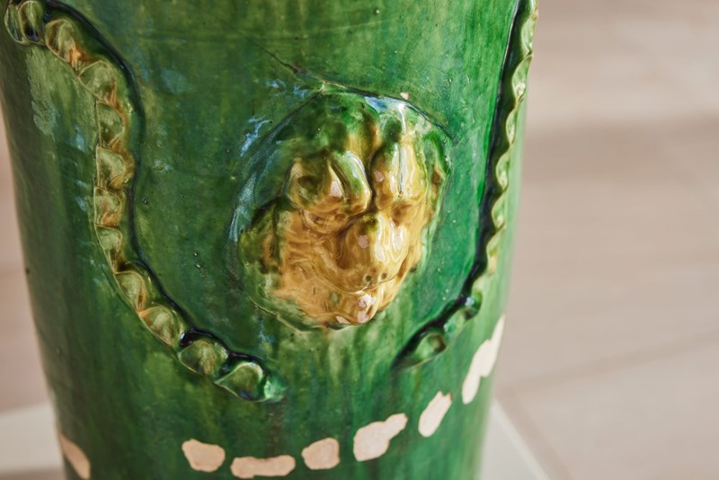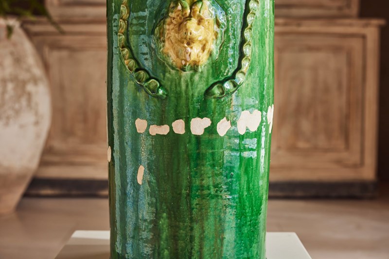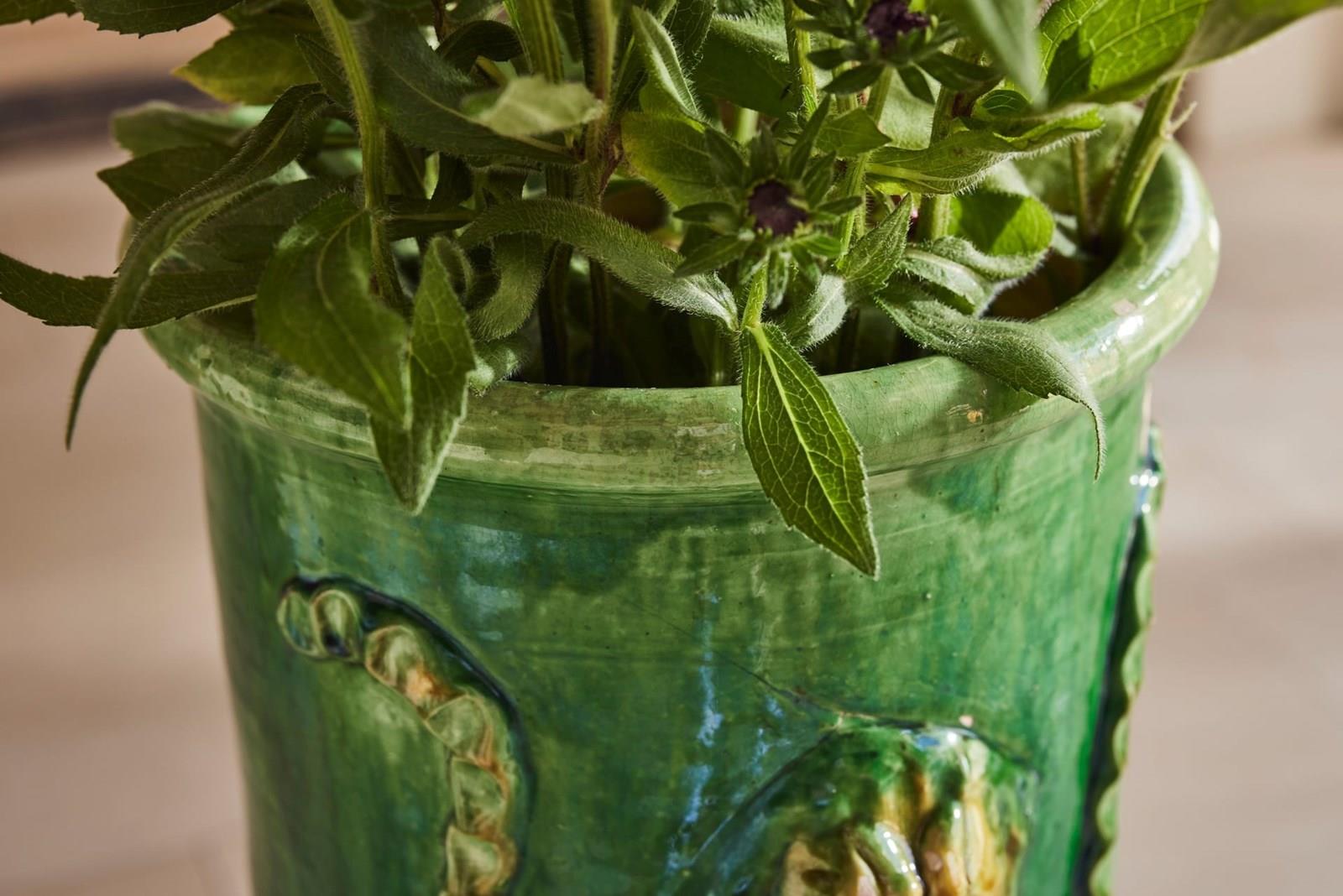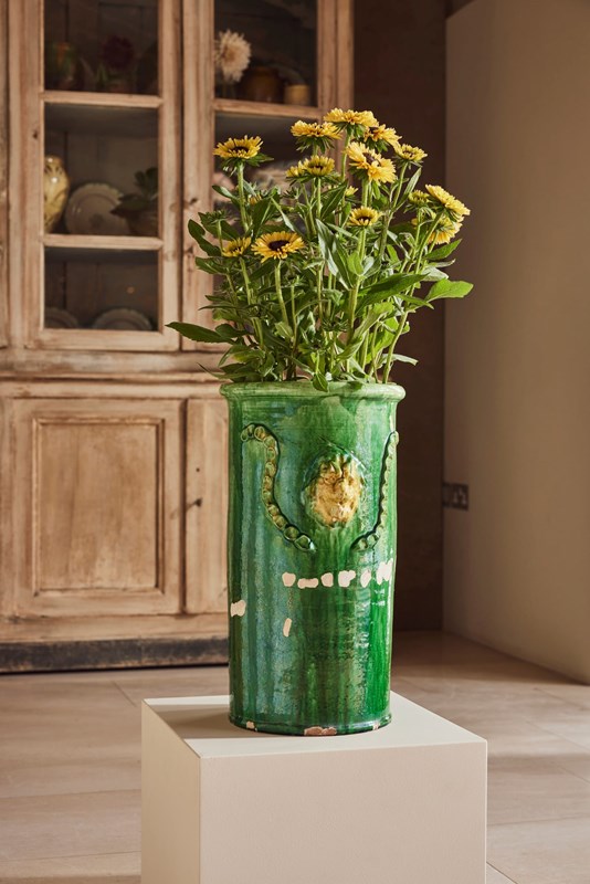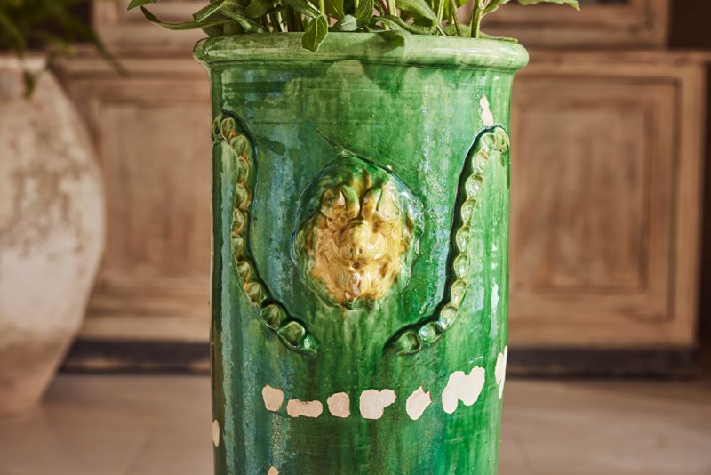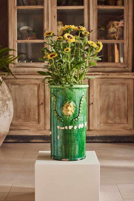 A tall mid-19th century terracotta vase from St Jean-de-Fos, finished with a rich green glaze and decorated with a yellow lion’s head surrounded by a green garland. In good condition for its age, this rare and striking piece works beautifully as a vase for flowers, a planter for seasonal displays, or as a decorative object in its own right.