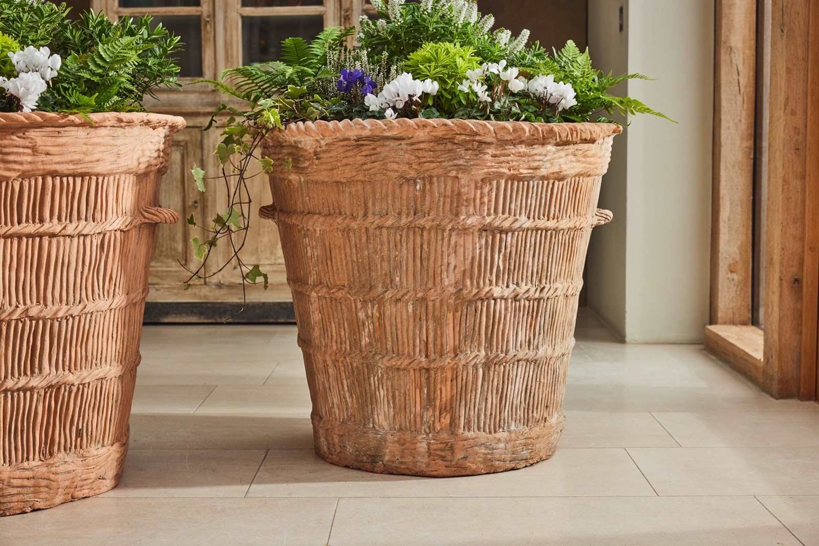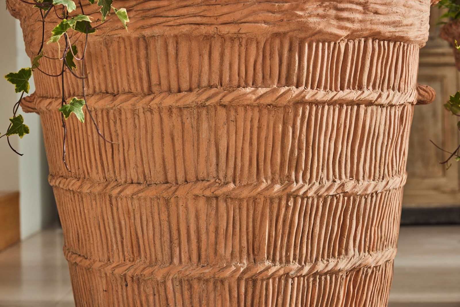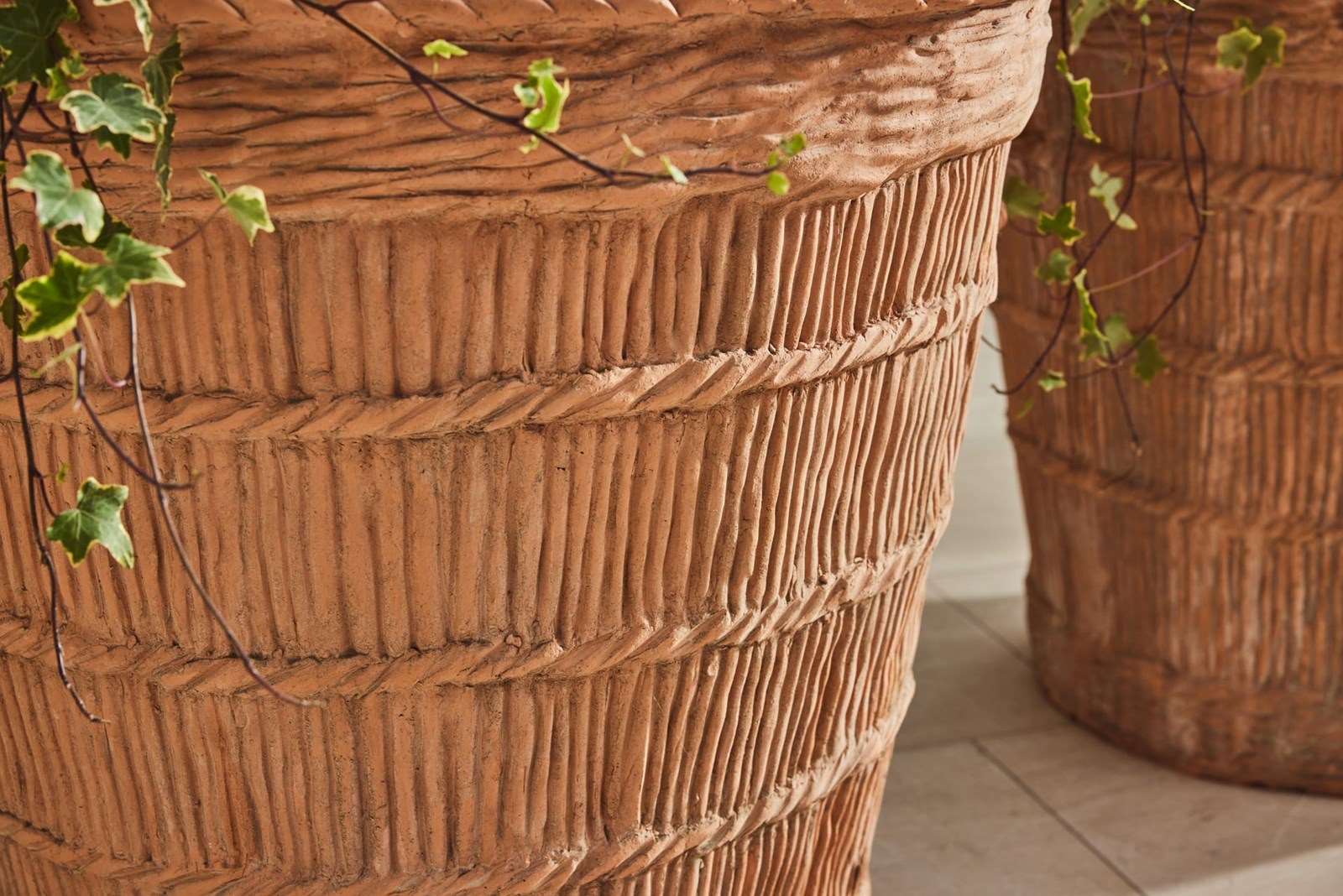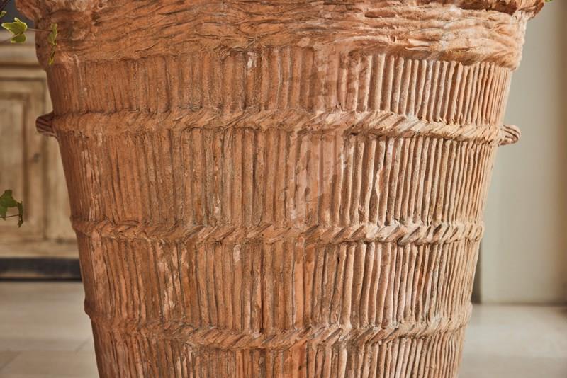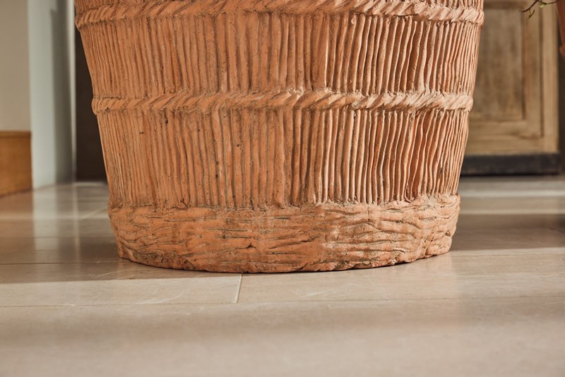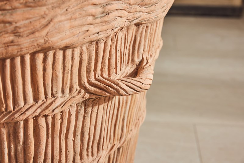 A pair of substantial terracotta planters modelled to resemble rope produced in the 1960s using original 19th-century casts. The surface detail is crisp, with hand-finished texture that gives depth and a natural, well-crafted character.