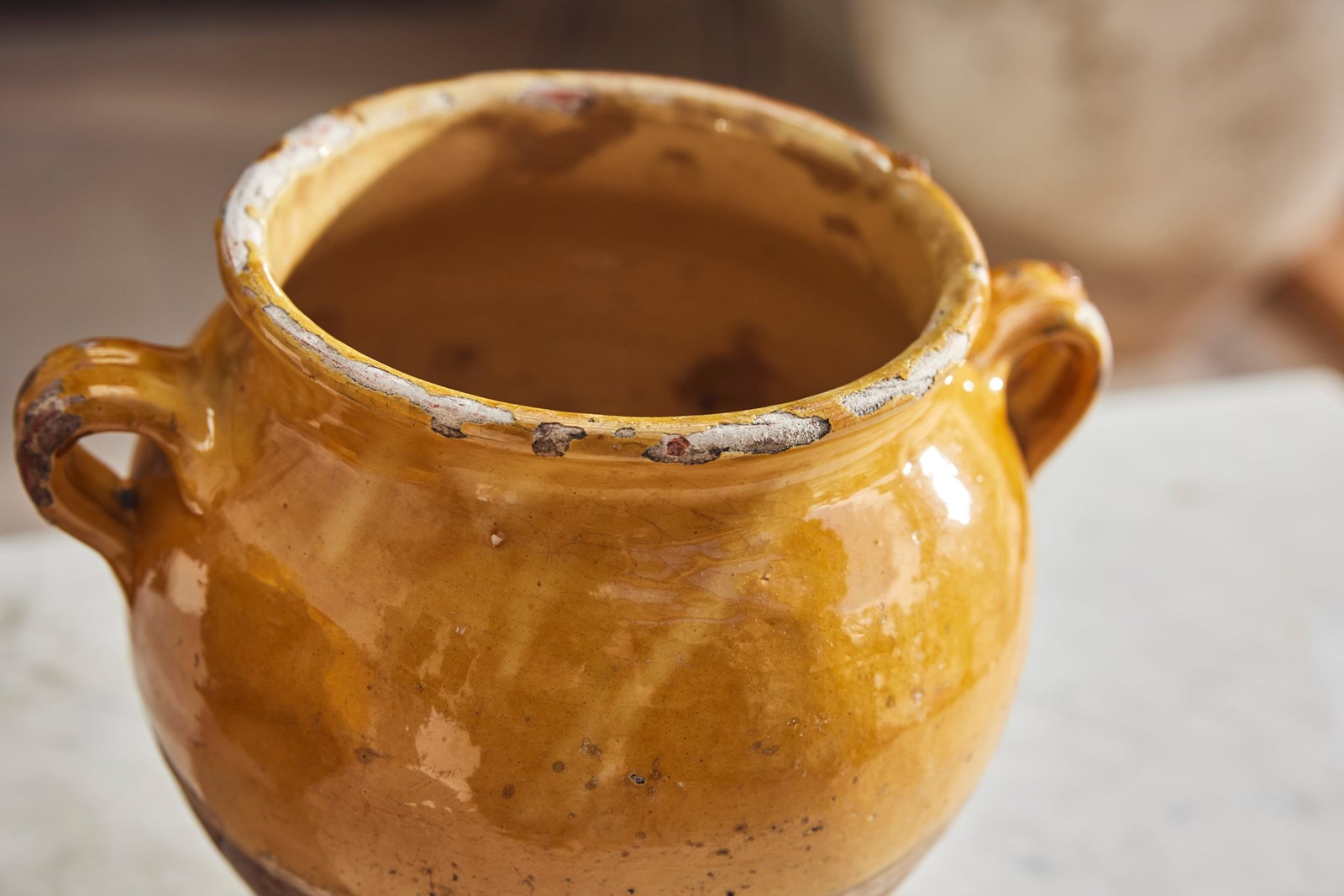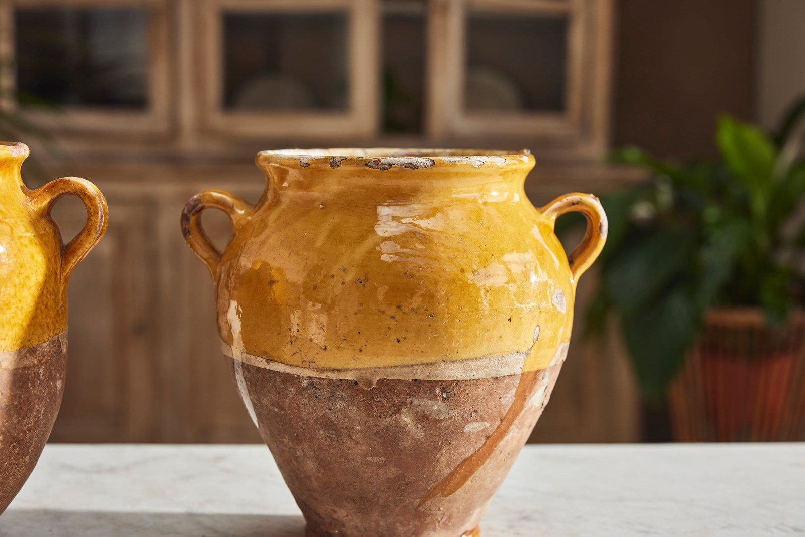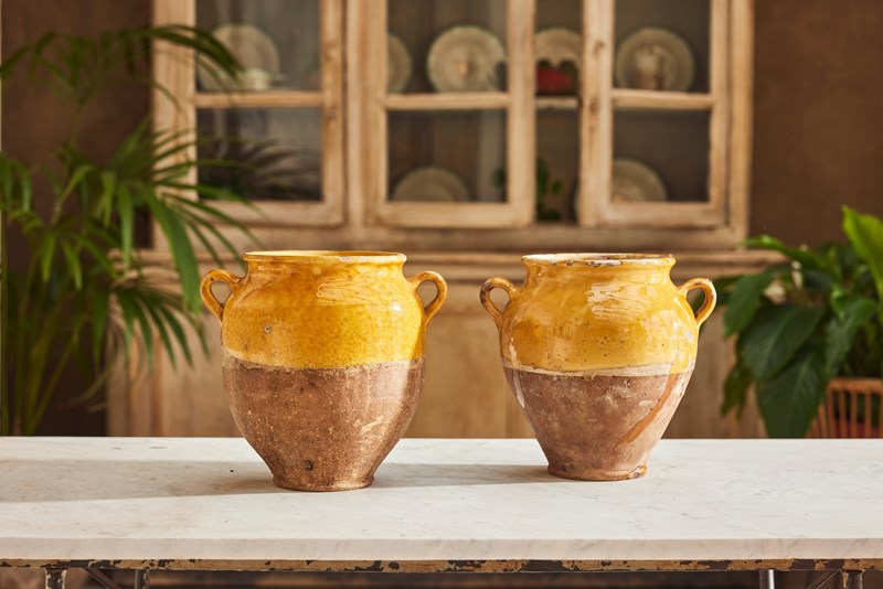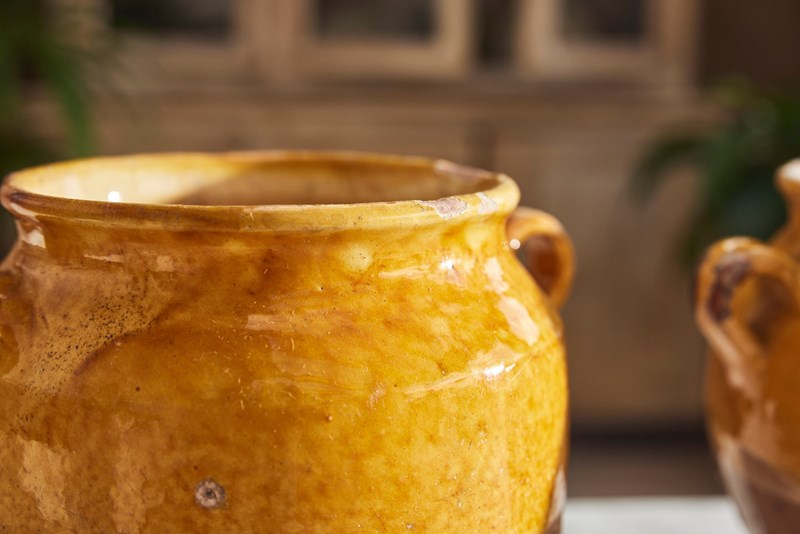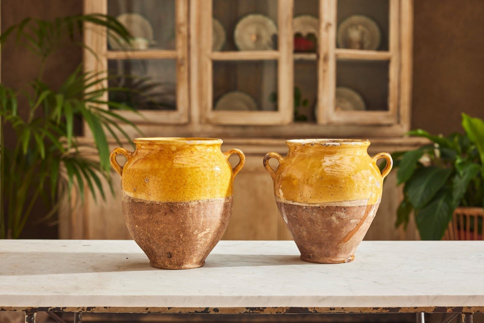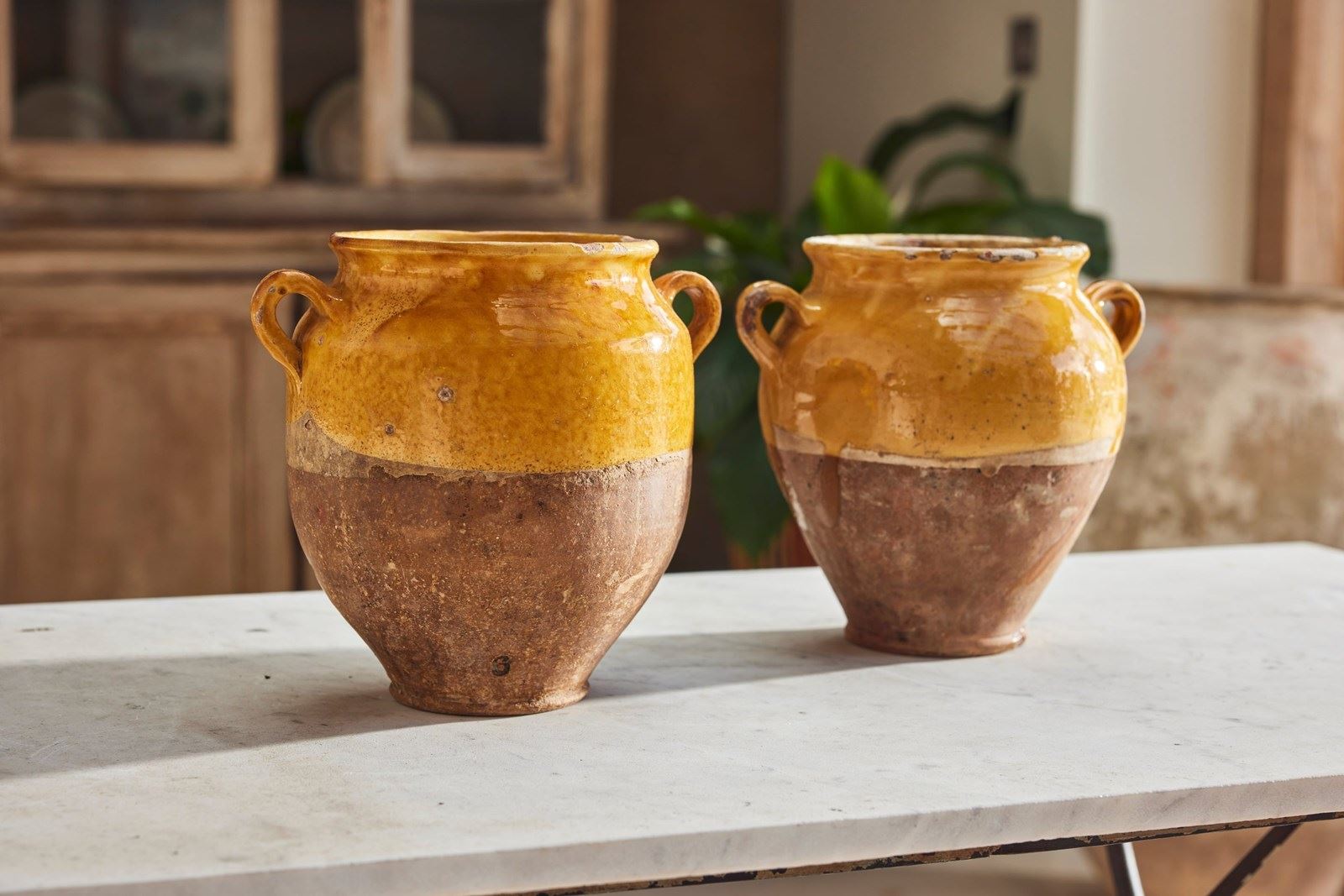 A charming pair of 19th-century French confit pots, distinguished by their rich, deep yellow glaze—more vibrant than the paler tones of later versions. Once used to preserve food these compact pots are now perfect as decorative accents for shelves, consoles, or table tops. Full of rustic character and Provençal charm.