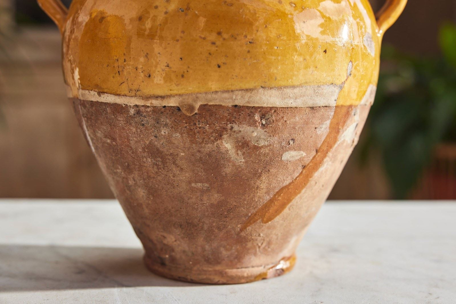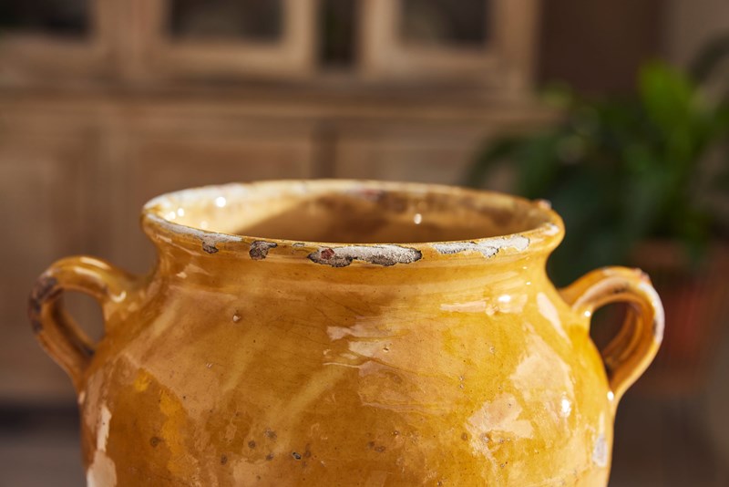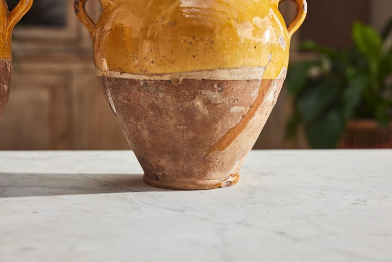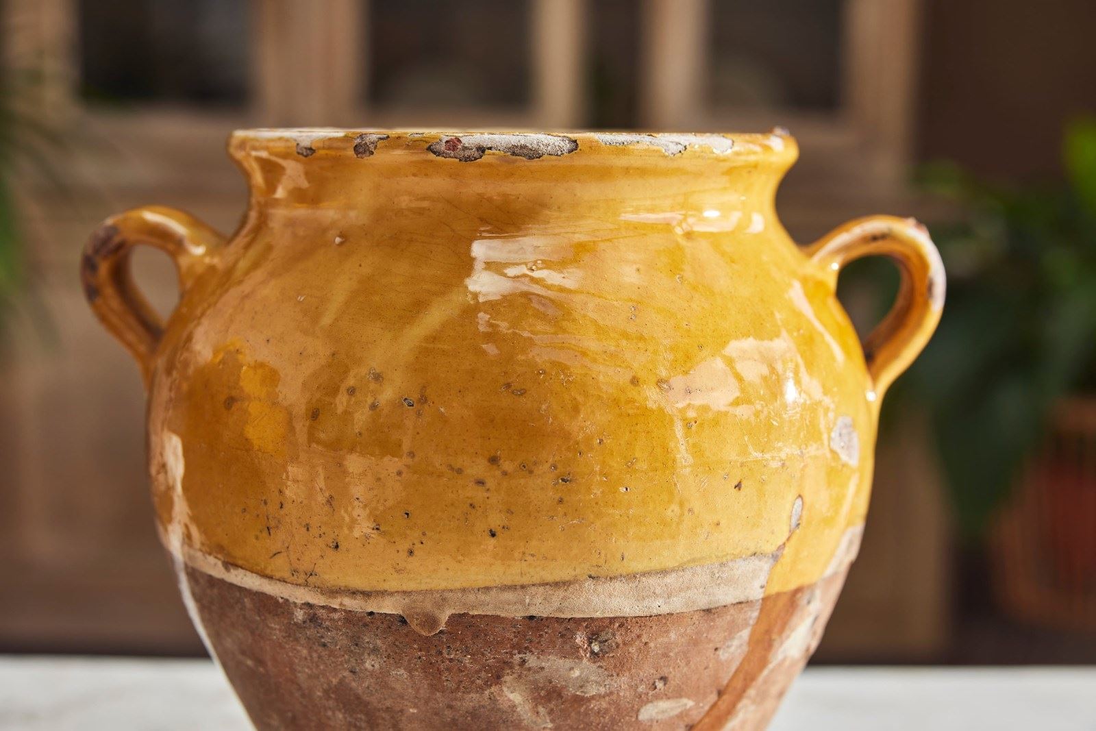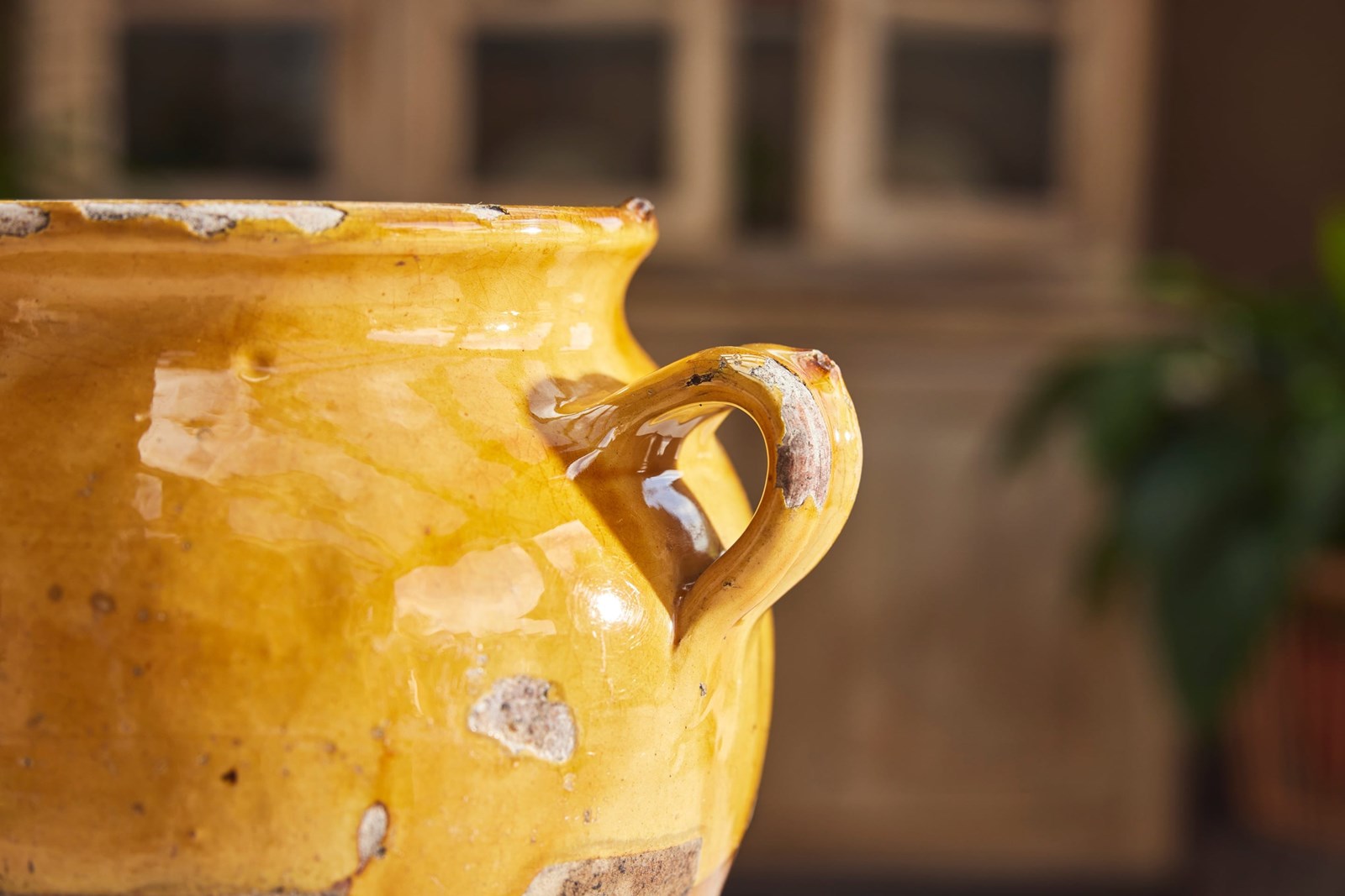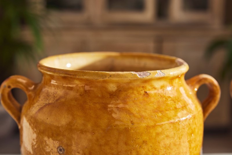 A charming pair of 19th-century French confit pots, distinguished by their rich, deep yellow glaze—more vibrant than the paler tones of later versions. Once used to preserve food these compact pots are now perfect as decorative accents for shelves, consoles, or table tops. Full of rustic character and Provençal charm.