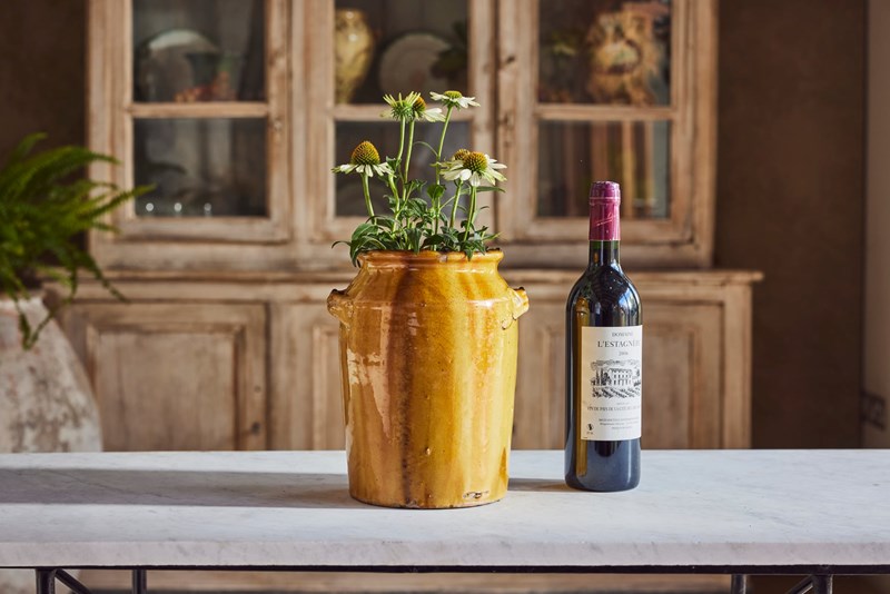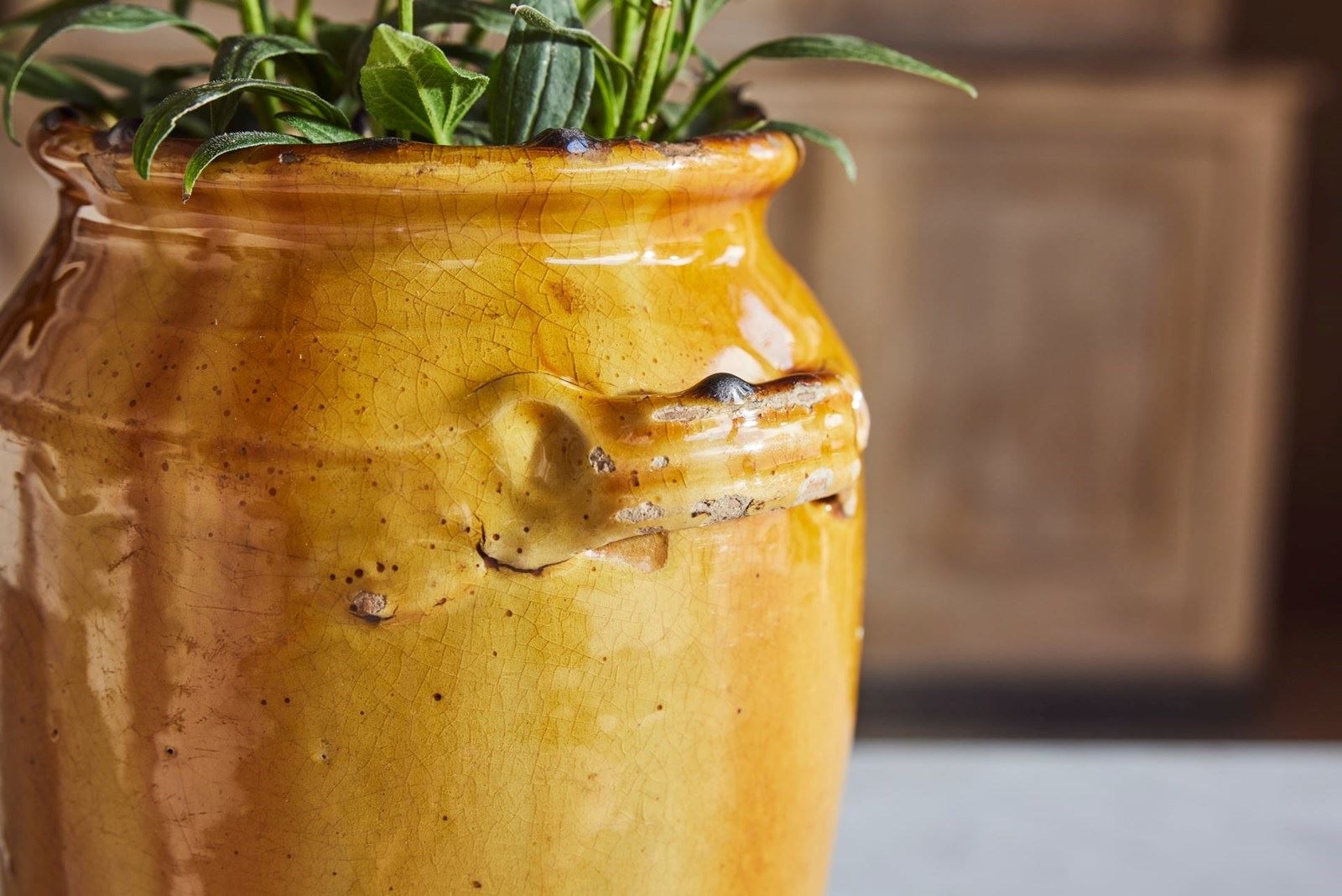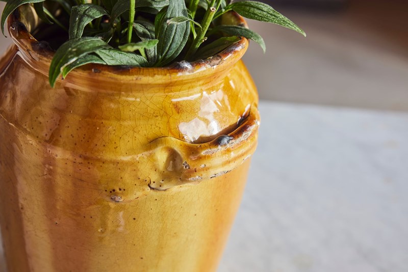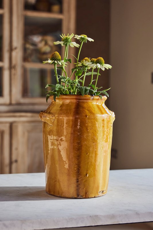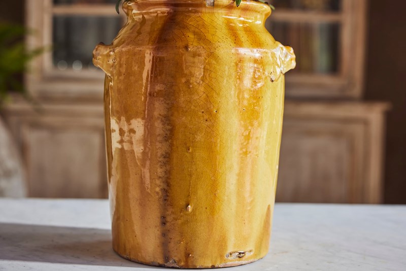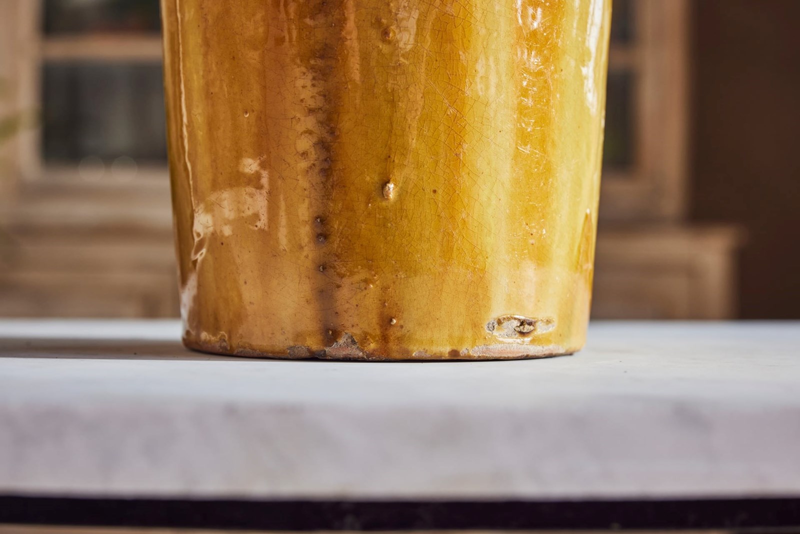 A charming 19th-century Provençal terracotta pot, beautifully glazed in a sunny yellow. Once used for food storage in its native Provence, this piece now makes a striking vase or simply a decorative accent. With two modest handles on either side, it adds a touch of French countryside warmth wherever it’s placed.