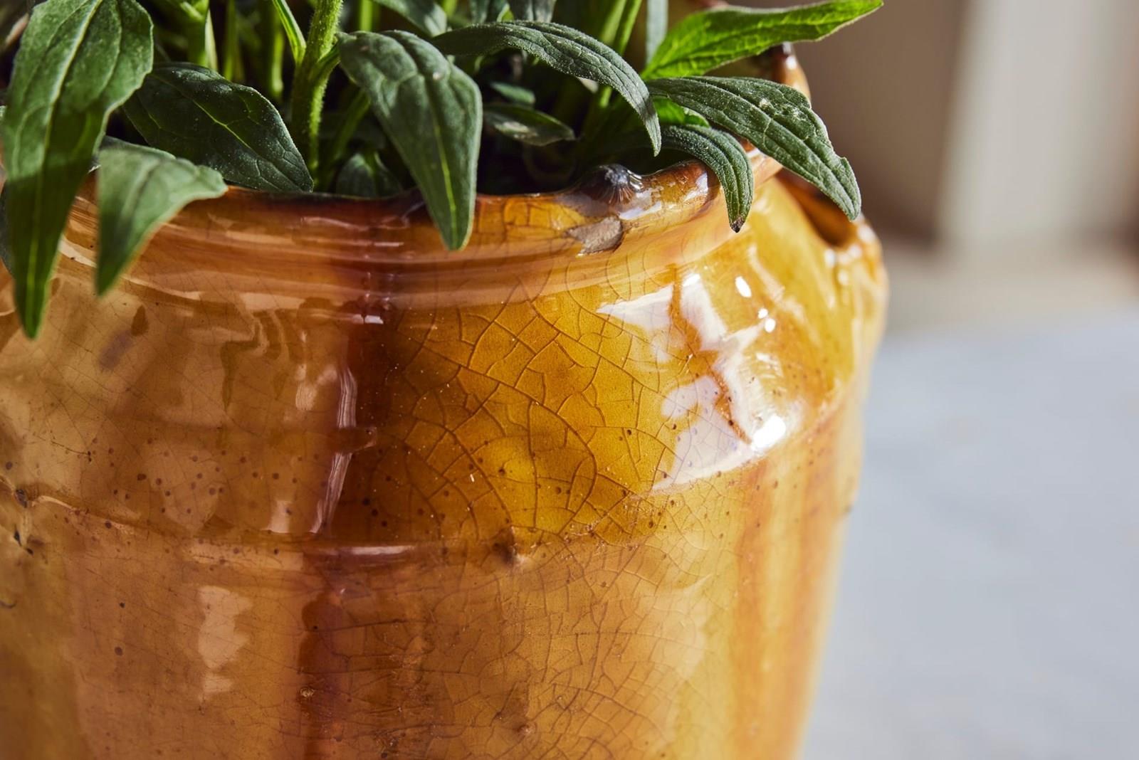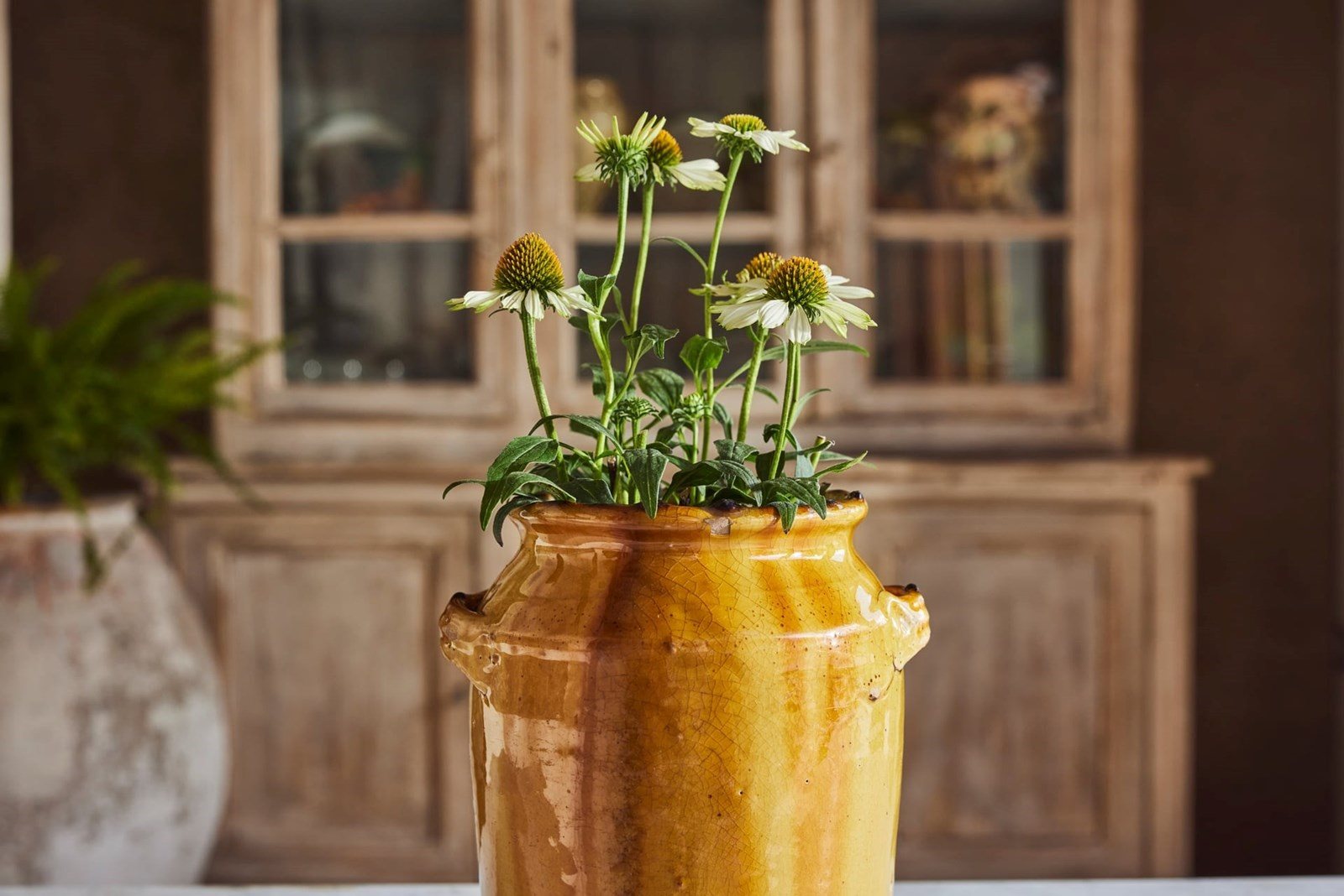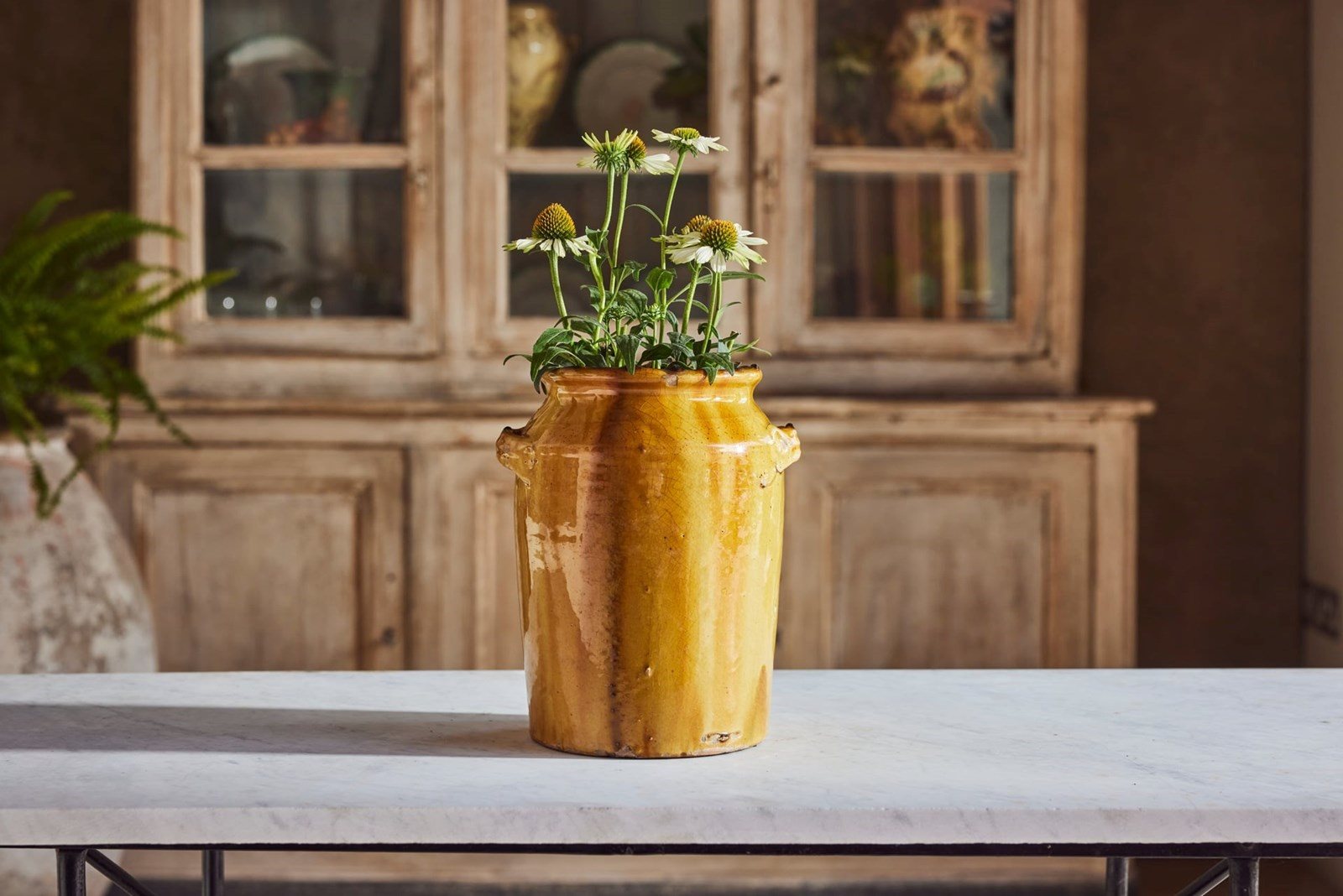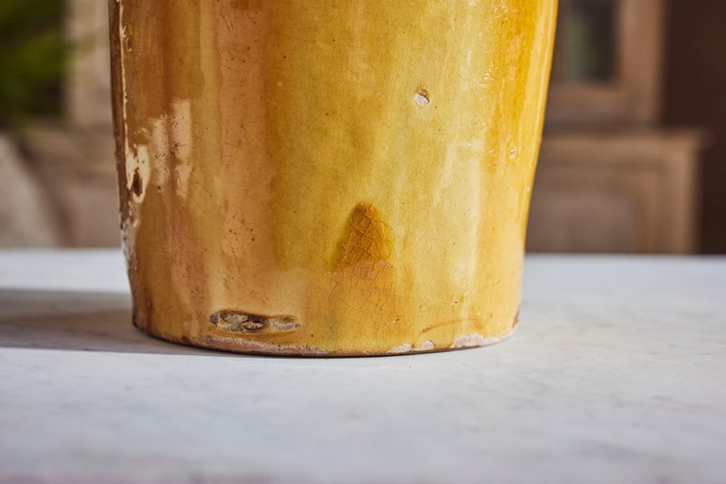 A charming 19th-century Provençal terracotta pot, beautifully glazed in a sunny yellow. Once used for food storage in its native Provence, this piece now makes a striking vase or simply a decorative accent. With two modest handles on either side, it adds a touch of French countryside warmth wherever it’s placed.