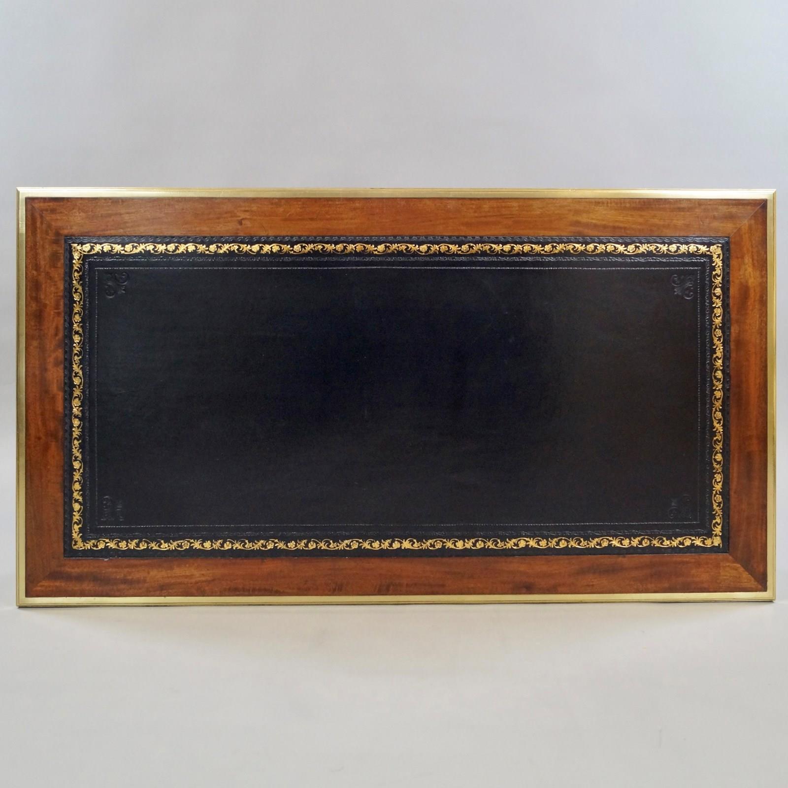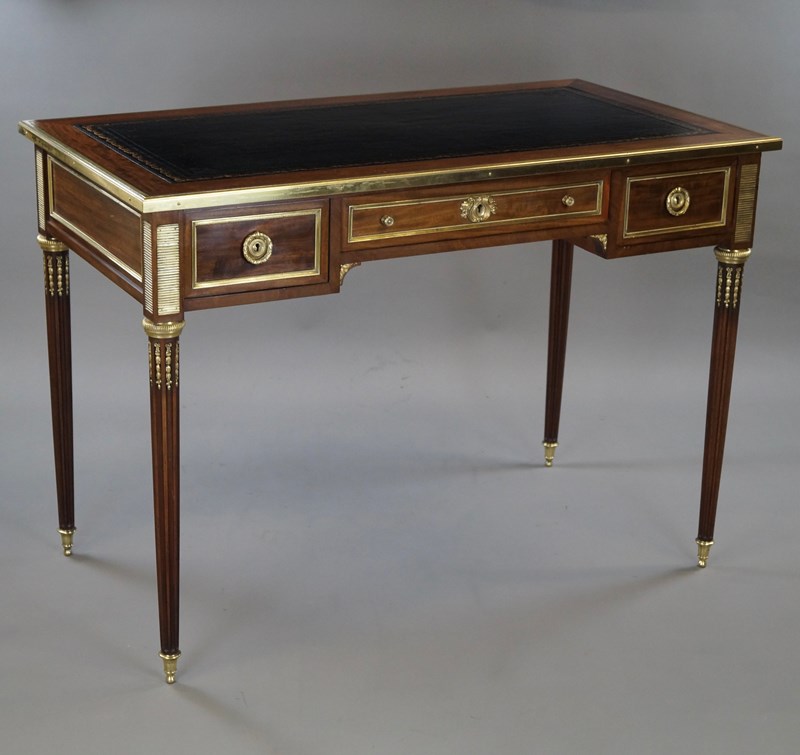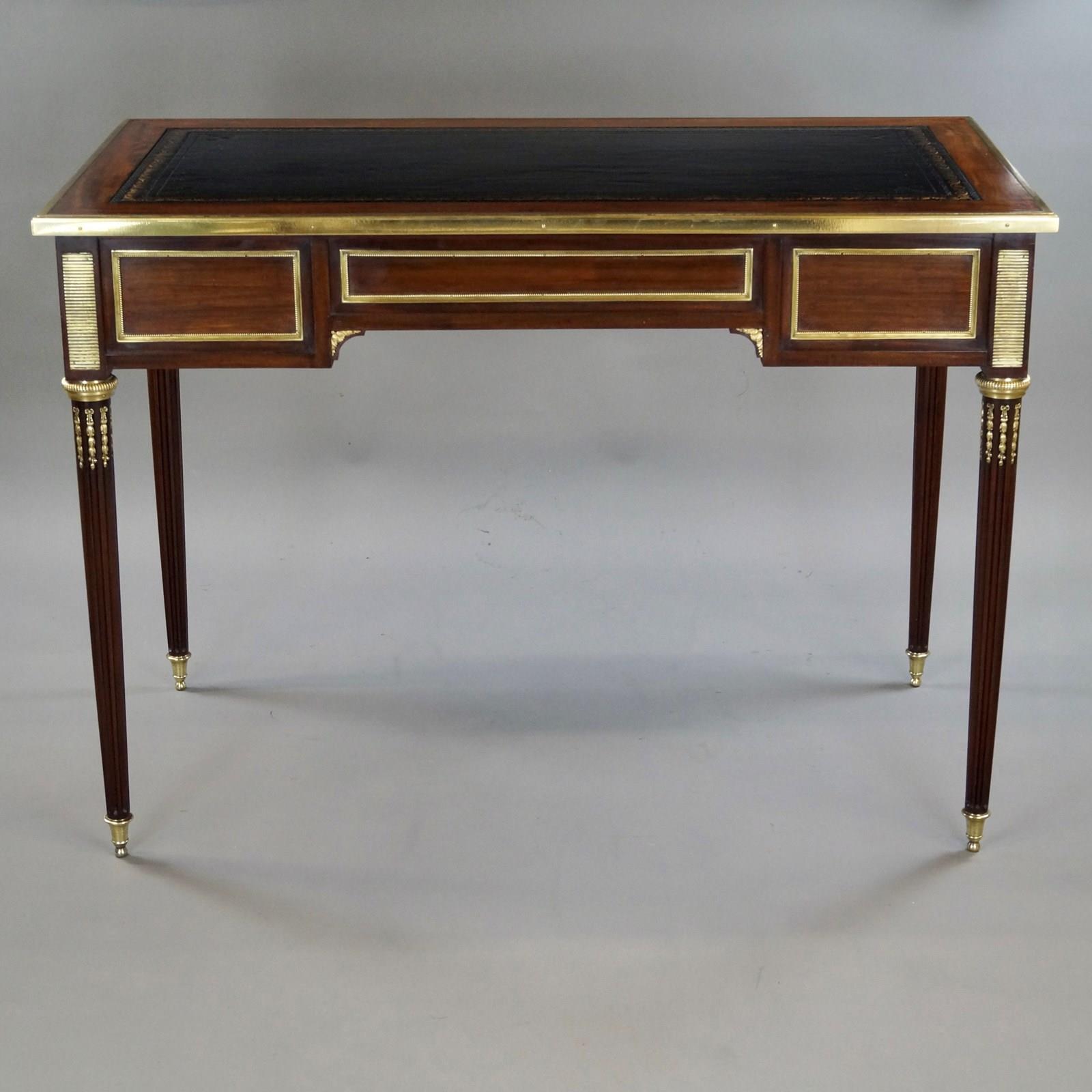 A fine English bureau plat. In quality mahogany and raised on turned and fluted legs with brass cap feet and foliate adornments. Above are three, oak lined, frieze drawers and a banded top, with inset black leather writing surface, all with cast brass moldings. The table is finished all around meaning it is a " stand alone piece". In very good and original condition and bearing the makers stamp "C. Mellier" on the underside. 760mm high, 1070mm wide and 590mm deep. English. Circa 1885.
