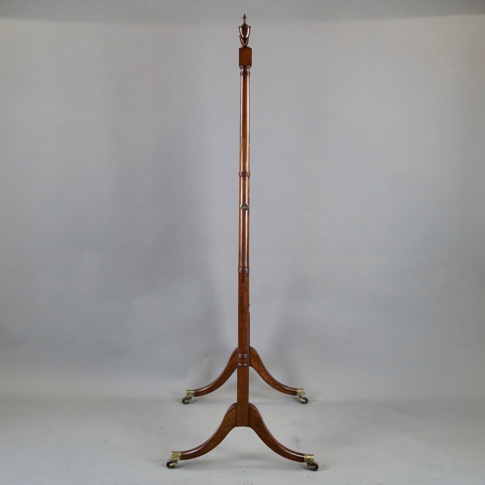 A fine George III mahogany cheval mirror. Raised on swept legs with original brass castors and with beautifully turned supports, with finials atop and stretchers holding the mahogany banded mirror. In very good and original condition. 1730mm high, 640mm wide and 560mm deep. English. Circa 1820.